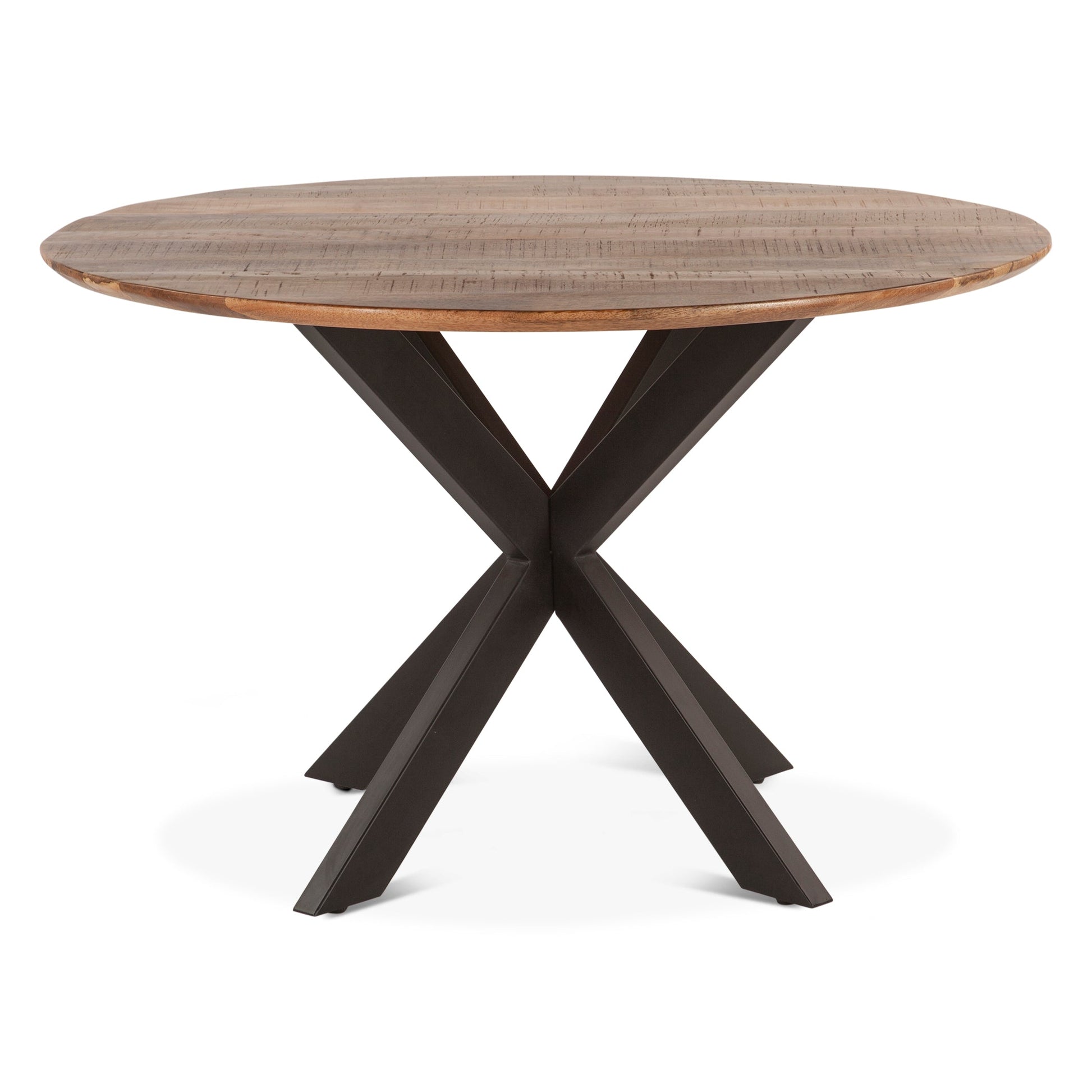 This round dining table offers a refined blend of rustic texture and modern balance. Crafted from solid mango wood in a natural finish, the tabletop showcases beautiful grain variation and organic warmth. The black iron X-base provides structural strength and an industrial touch that complements the wood’s character. Compact yet substantial, this piece is ideal for breakfast nooks, small dining areas, or boutique hospitality spaces seeking timeless versatility.