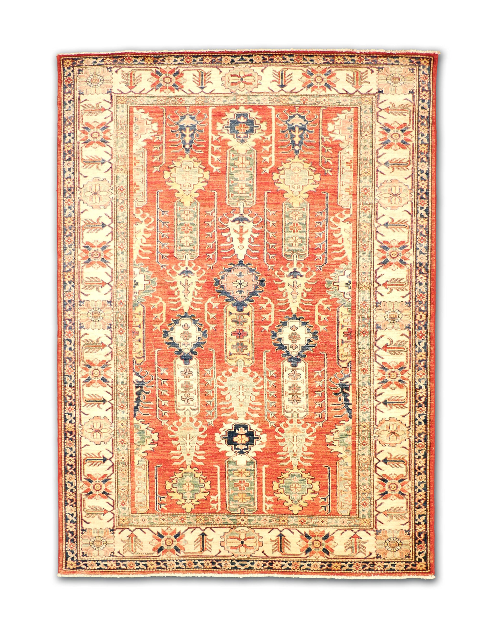 This rug features a vivid red field adorned with vertically aligned geometric and botanical motifs that create rhythm and balance across its surface. The ivory border, filled with stylized rosettes and angular vine work, provides a striking contrast and frames the composition with elegance. The use of teal, gold, navy, and soft green accents adds depth, making the rug both bold and versatile.