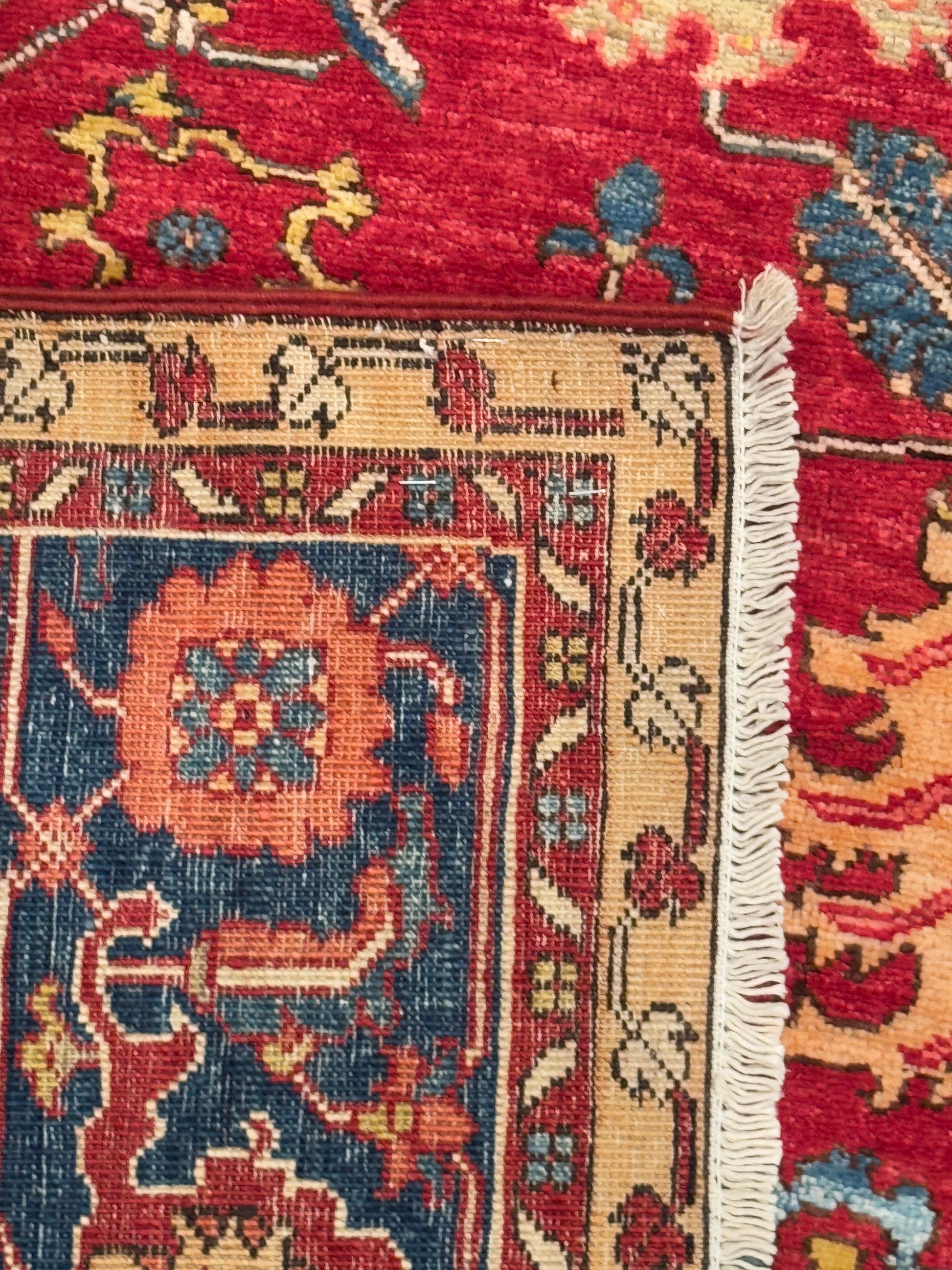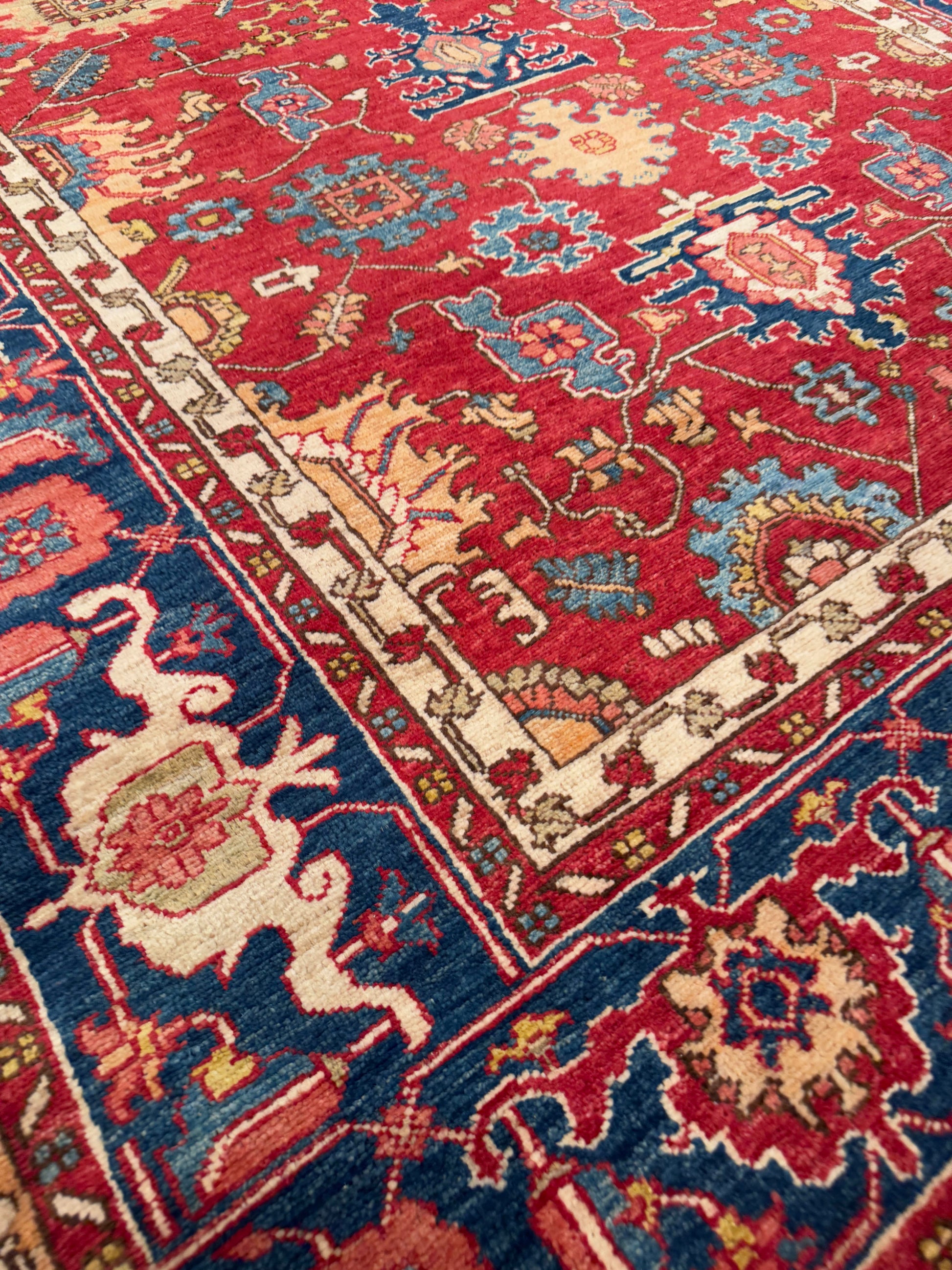 This rug features a vibrant red field with large-scale floral and palmette motifs woven in rich tones of ivory, blue, teal, and soft gold. The bold navy border is decorated with stylized animals, blossoms, and flowing vine work, creating a dramatic frame that enhances the tribal yet elegant aesthetic. The rug’s intricate detailing and warm palette make it a powerful statement piece for any interior.