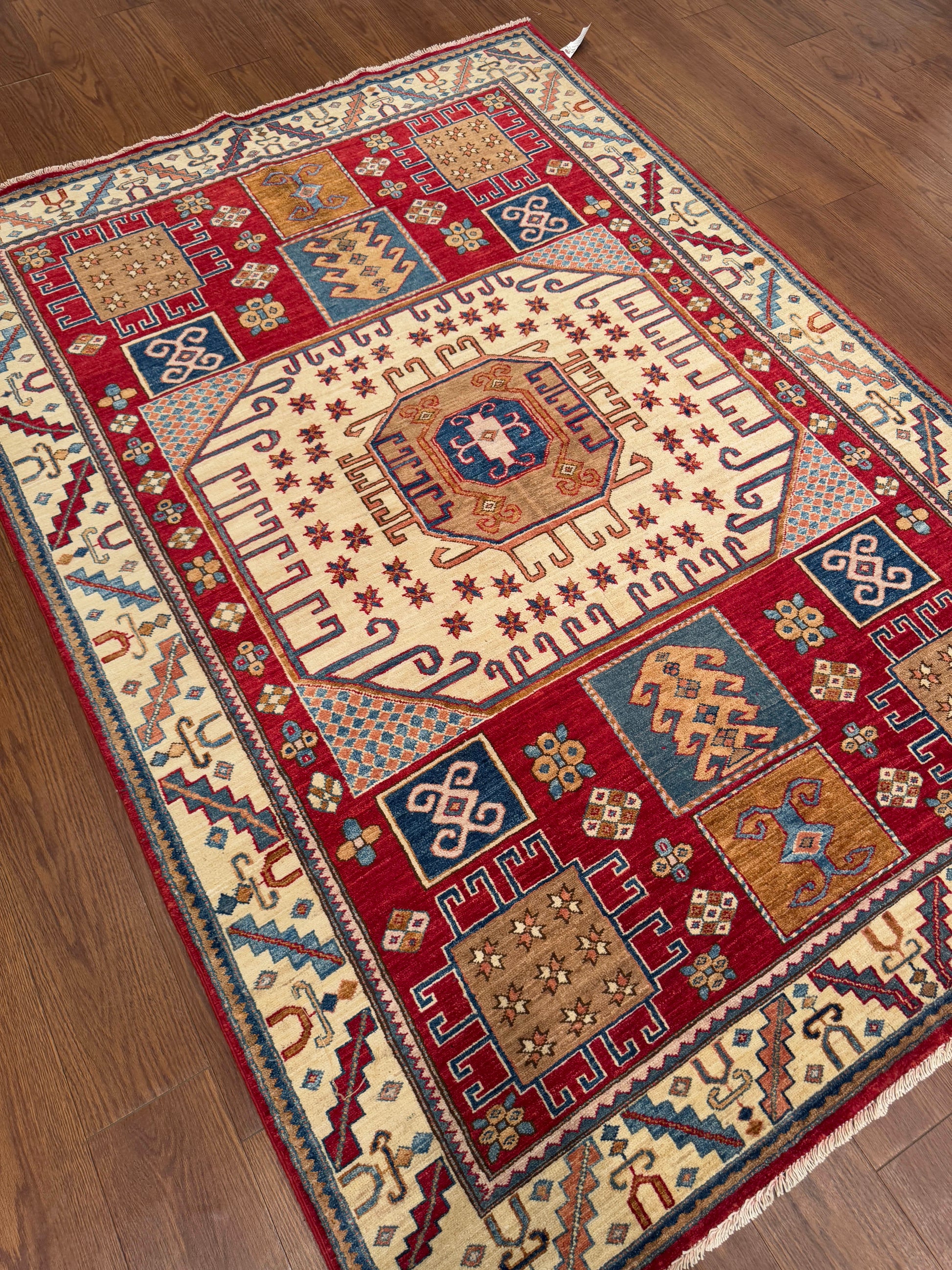 This rug showcases a striking tribal design with a bold ivory central medallion set against a deep red field. The geometric motifs include symbolic squares, diamonds, and stylized tribal emblems in shades of blue, gold, tan, and ivory, giving it a rich and historic character. The borders feature intricate step patterns and traditional Caucasian elements, creating a harmonious frame for the bold central field.