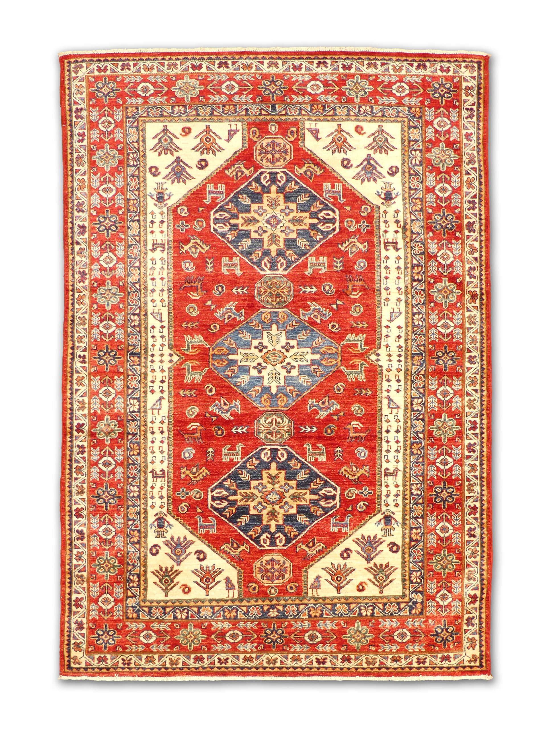 This rug showcases a bold red field with a striking sequence of linked navy medallions, each adorned with intricate star and floral motifs. Ivory spandrels on the top and bottom lighten the composition, decorated with stylized floral and animal figures, adding a unique tribal charm. The border is detailed with continuous floral and vine patterns, grounding the design with balance and rhythm. Its layout reflects a classic Caucasian-inspired village weaving with strong symmetry and storytelling elements.