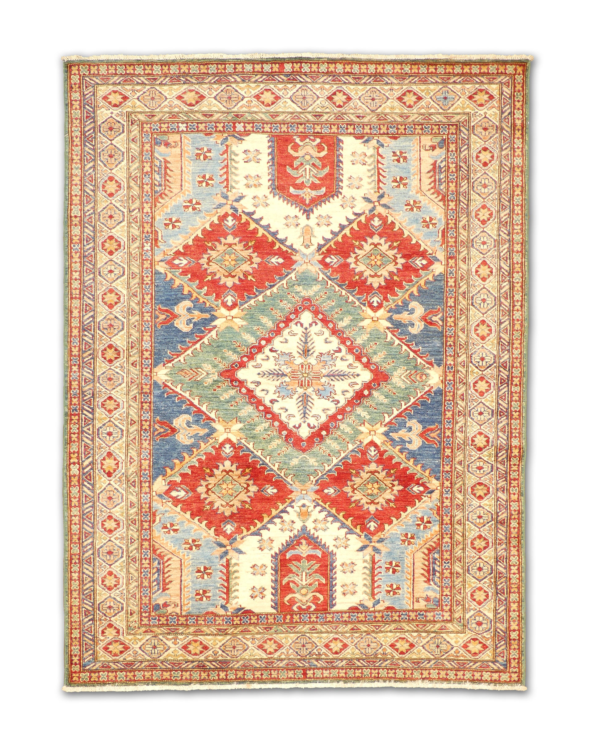 This handwoven rug features a striking central diamond medallion in ivory and red, flanked by layered geometric motifs in green and soft blue. Floral accents and stepped designs bring depth and movement to the composition. The surrounding border, detailed with repeating diamond motifs, enhances its bold symmetry and traditional character. Crafted from high-quality wool, it blends durability with timeless beauty, making it a standout piece for both classic and modern interiors.