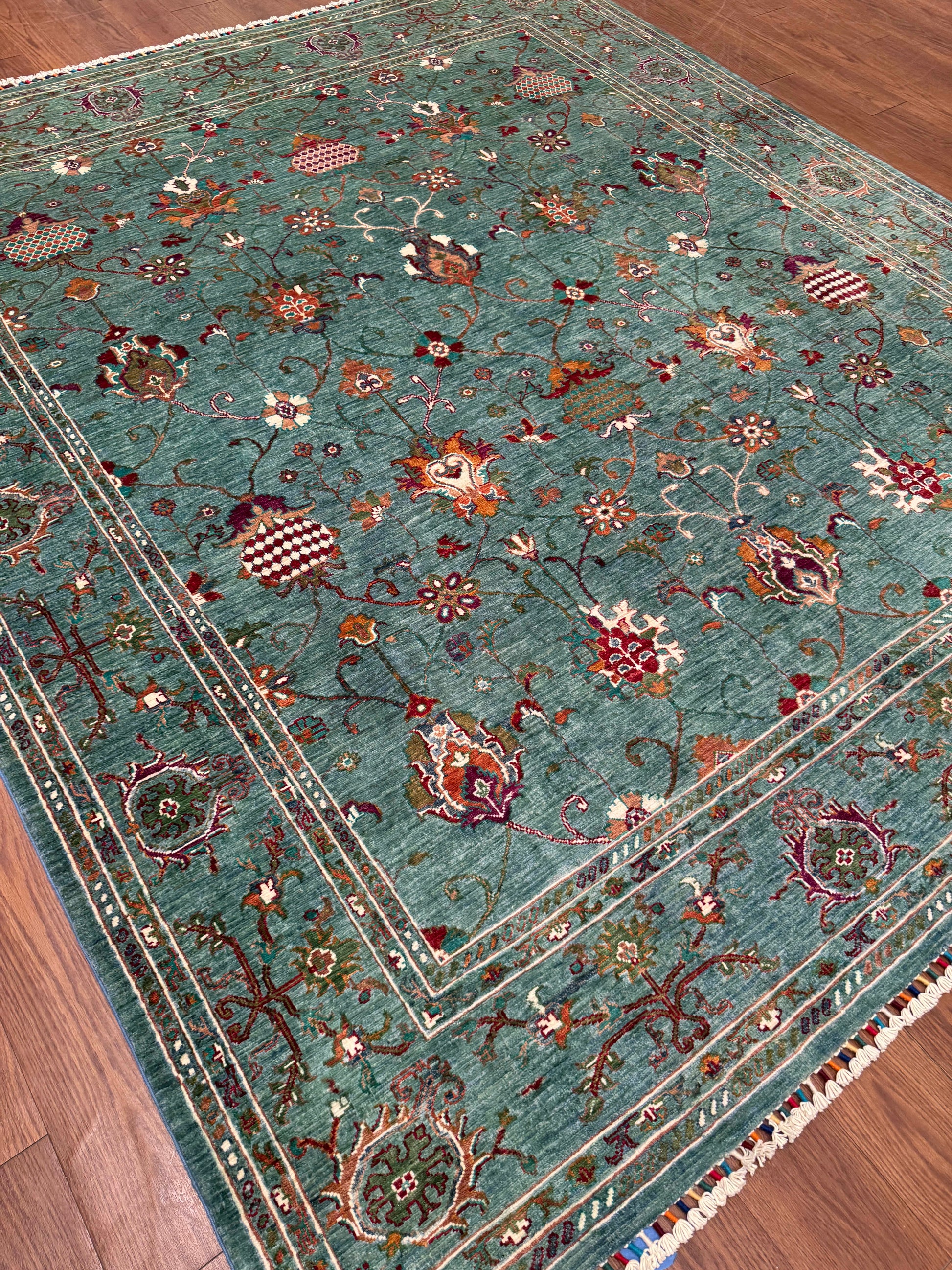 This hand-knotted rug presents a rich turquoise field adorned with an intricate allover floral pattern. Stylized blossoms and vine scrolls are accented with pops of ivory, red, orange, and gold, creating both contrast and depth. The detailed border frames the design beautifully, balancing elegance with bold color. This piece adds refinement and vibrancy, perfect for enhancing both traditional and eclectic interiors.