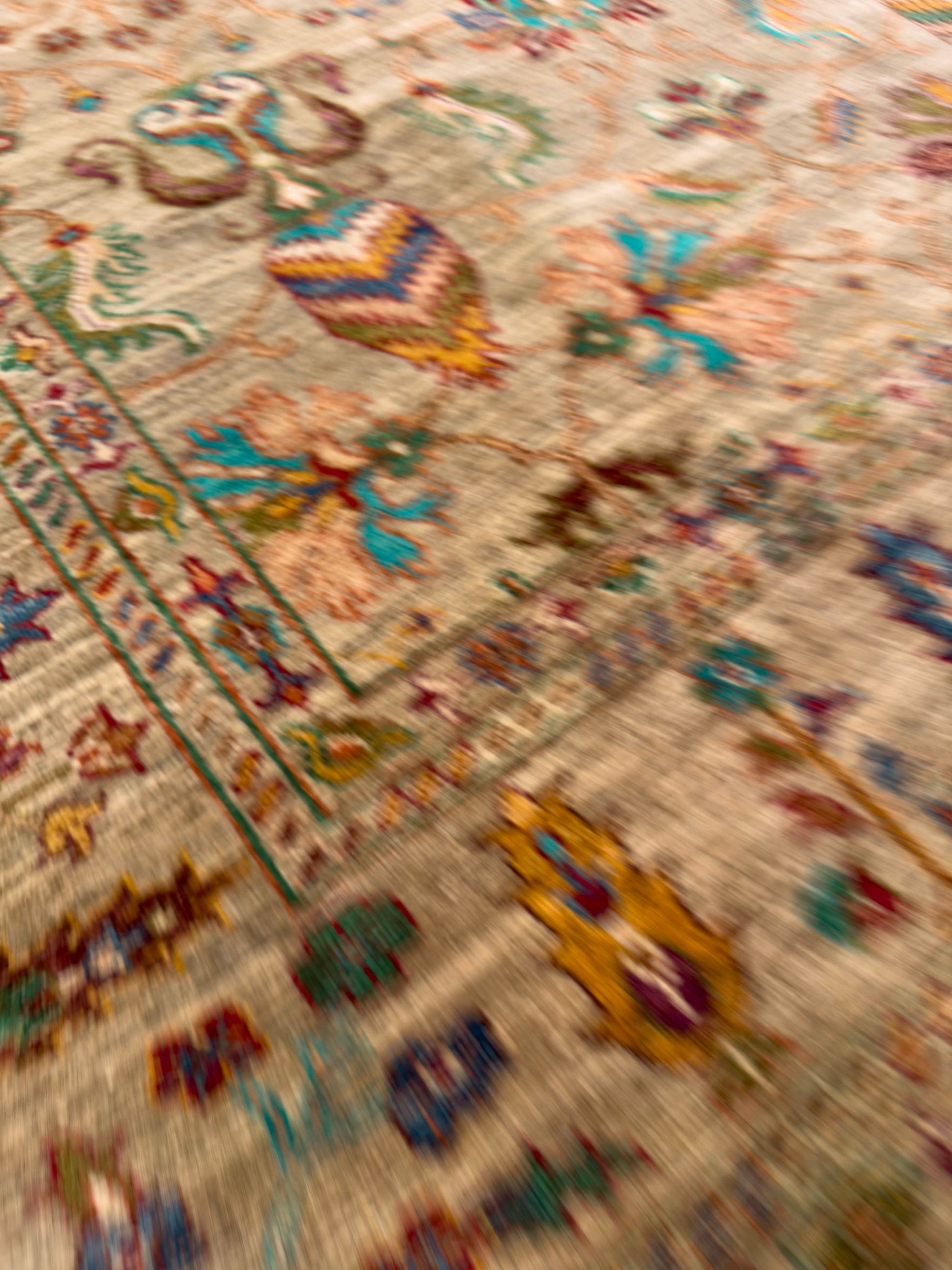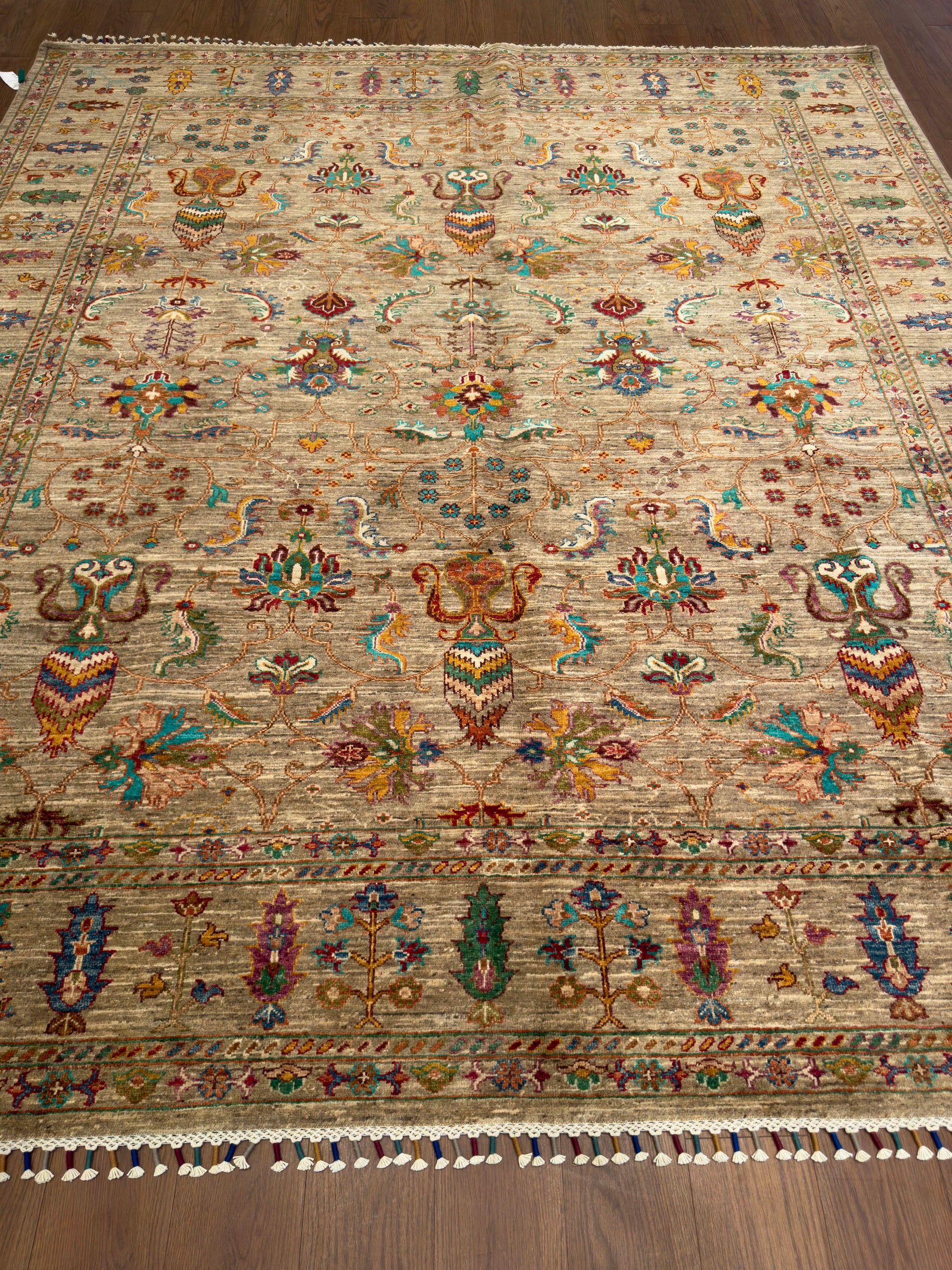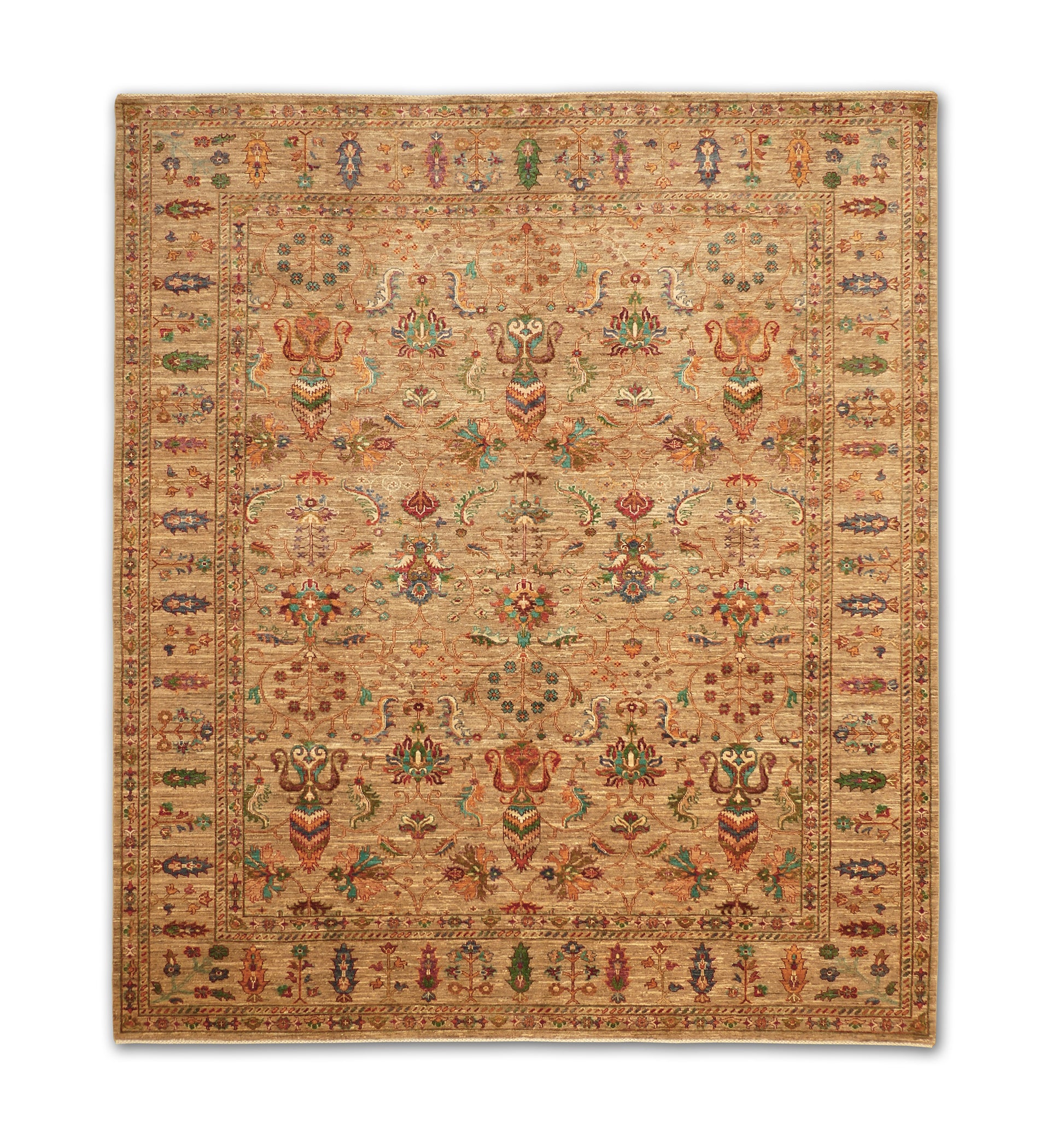 This hand-knotted rug showcases a warm tan field brought to life with vivid floral and botanical motifs arranged in a symmetrical layout. Rich shades of green, red, blue, and orange create a lively contrast, while the detailed border frames the design with elegance. Its balance of earth tones and jewel hues makes it a versatile statement piece that works beautifully in both classic and eclectic interiors.