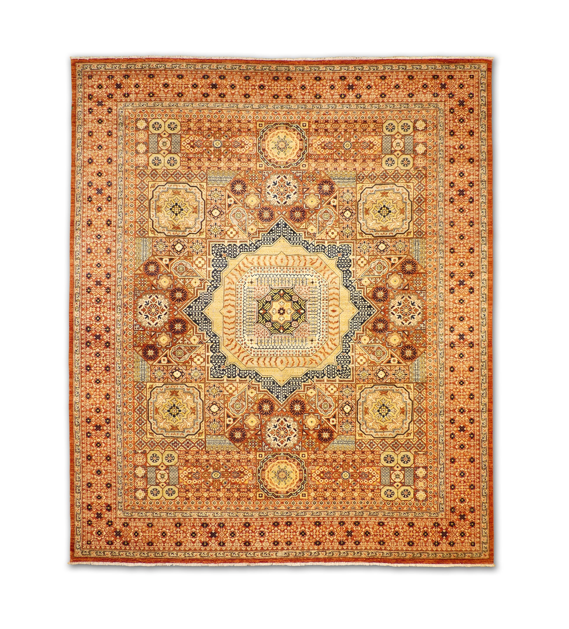 - Design: Central medallion with rosettes, starbursts, and intricate geometric borders