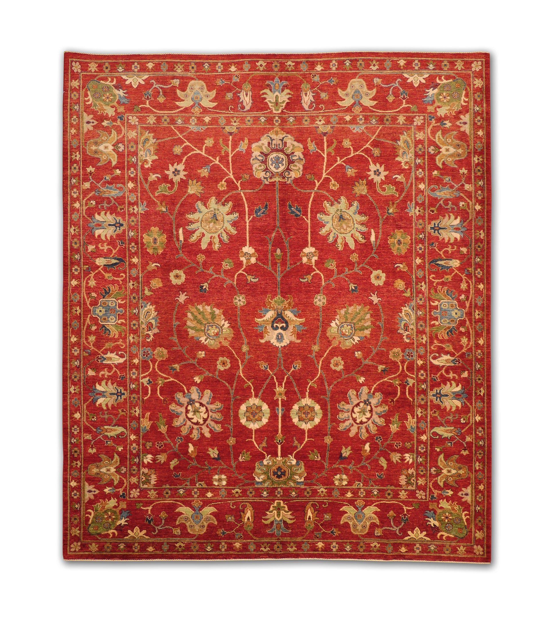This rug radiates warmth and elegance with its rich crimson field, adorned by sweeping vines and large-scale floral motifs. The blossoms in ivory, green, and soft blue create a striking contrast against the deep red background, bringing both vibrancy and balance. Framed by a detailed border of scrolling palmettes and floral elements, the design captures a timeless sophistication perfect for enhancing both traditional and transitional interiors.