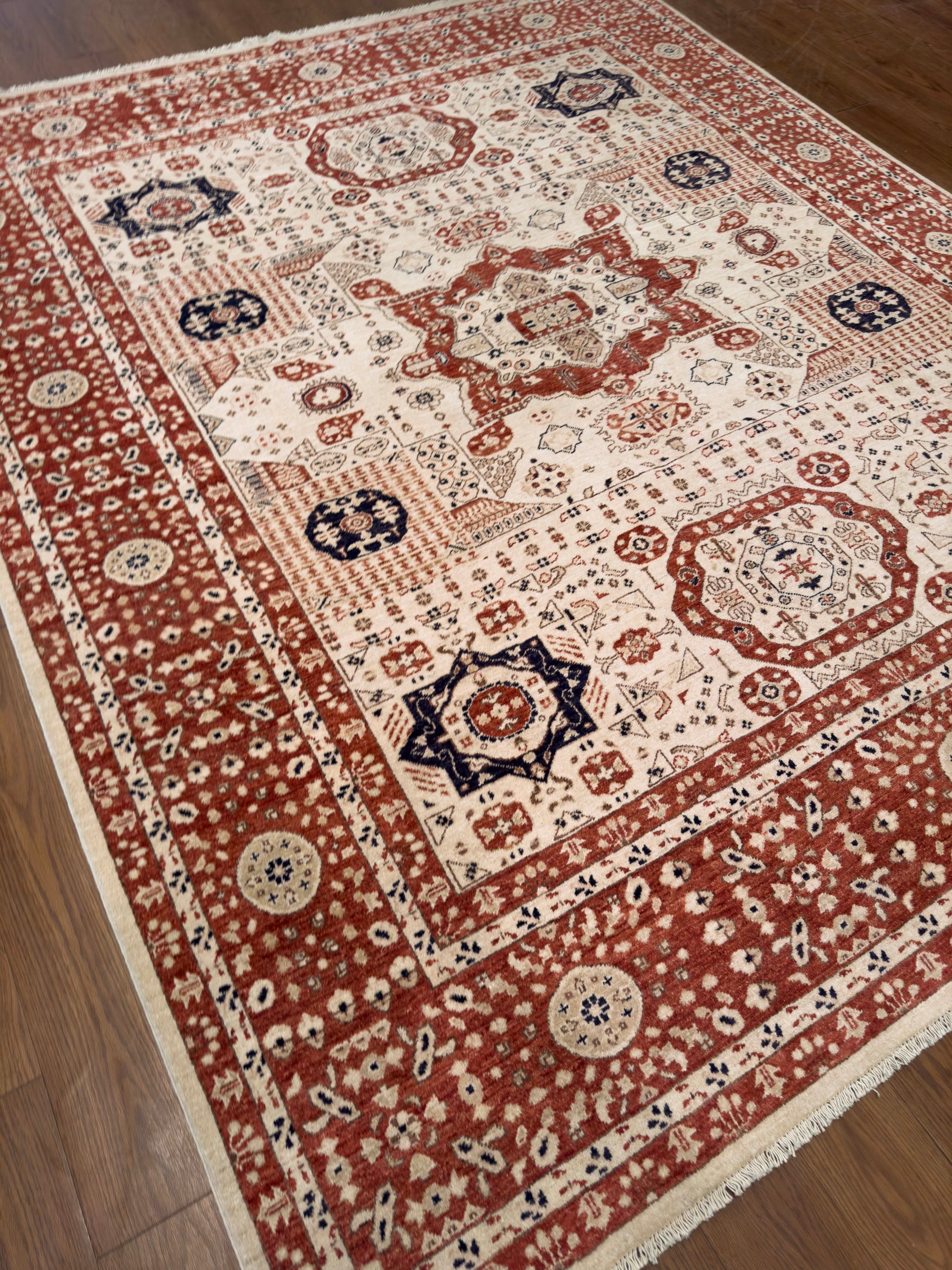 This rug features a striking blend of symmetry and geometry, with layered medallions and star-like motifs radiating across an ivory and rust-toned field. Accents of deep navy and subtle detailing add richness, while the balance of bold shapes and fine ornamentation creates both movement and harmony. A powerful yet refined piece, it brings a timeless presence to any room.