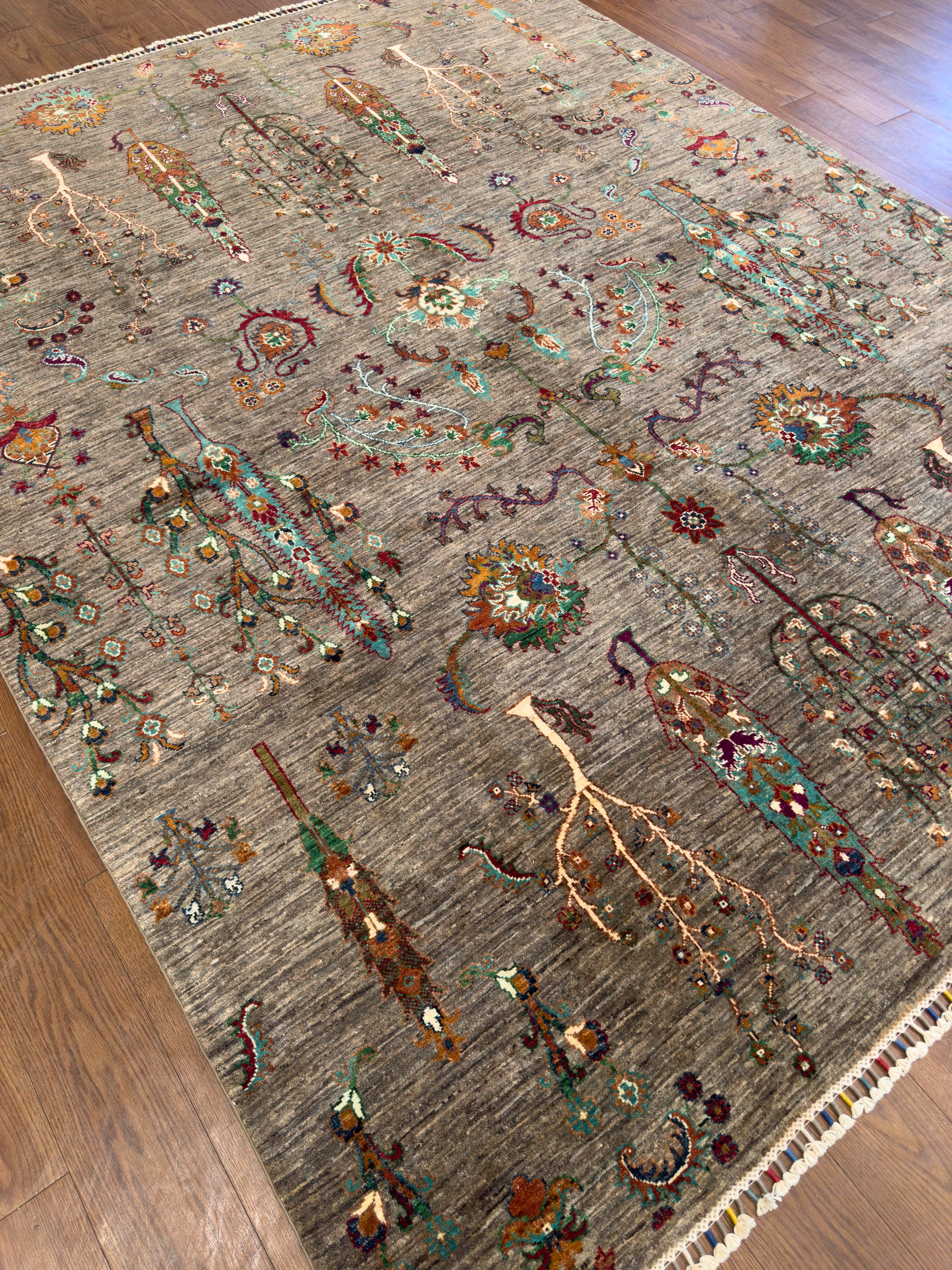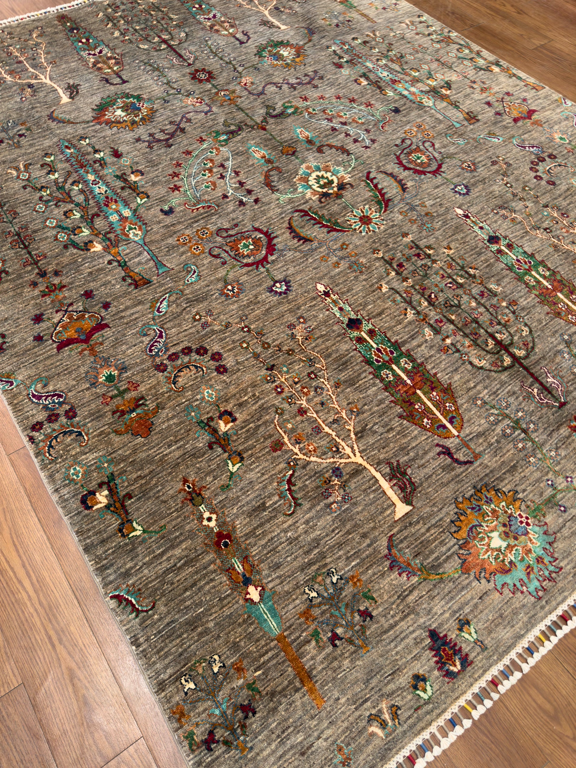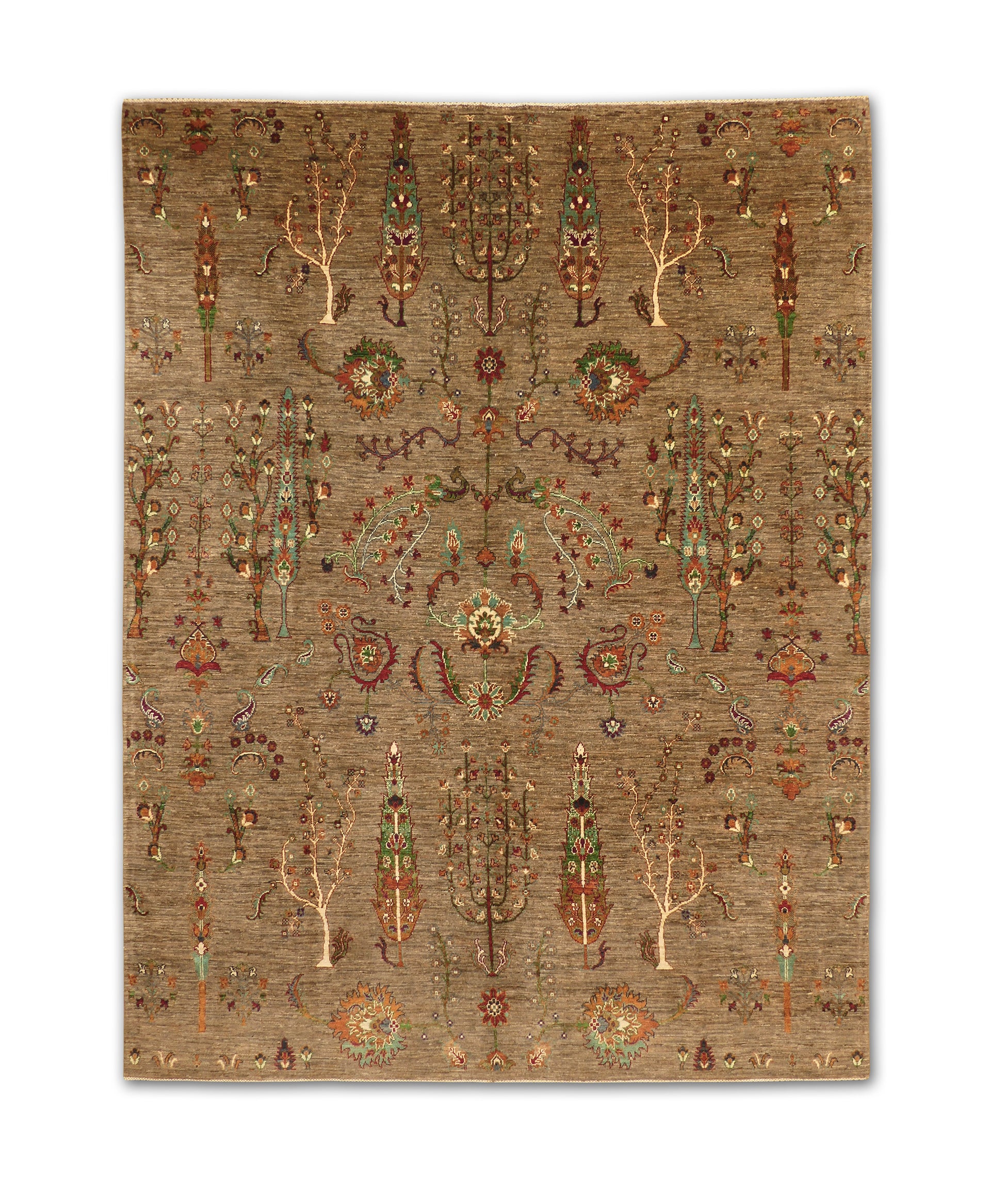 This captivating rug displays a garden-like composition with flowing vines, stylized trees, and intricate floral motifs arranged with rhythmic balance. The earthy brown-gray field provides a grounding backdrop, while the accents of teal, burgundy, gold, and ivory bring vivid contrast and life to the design. Its artistry evokes the feeling of a flourishing orchard, adding elegance and natural charm to any space.