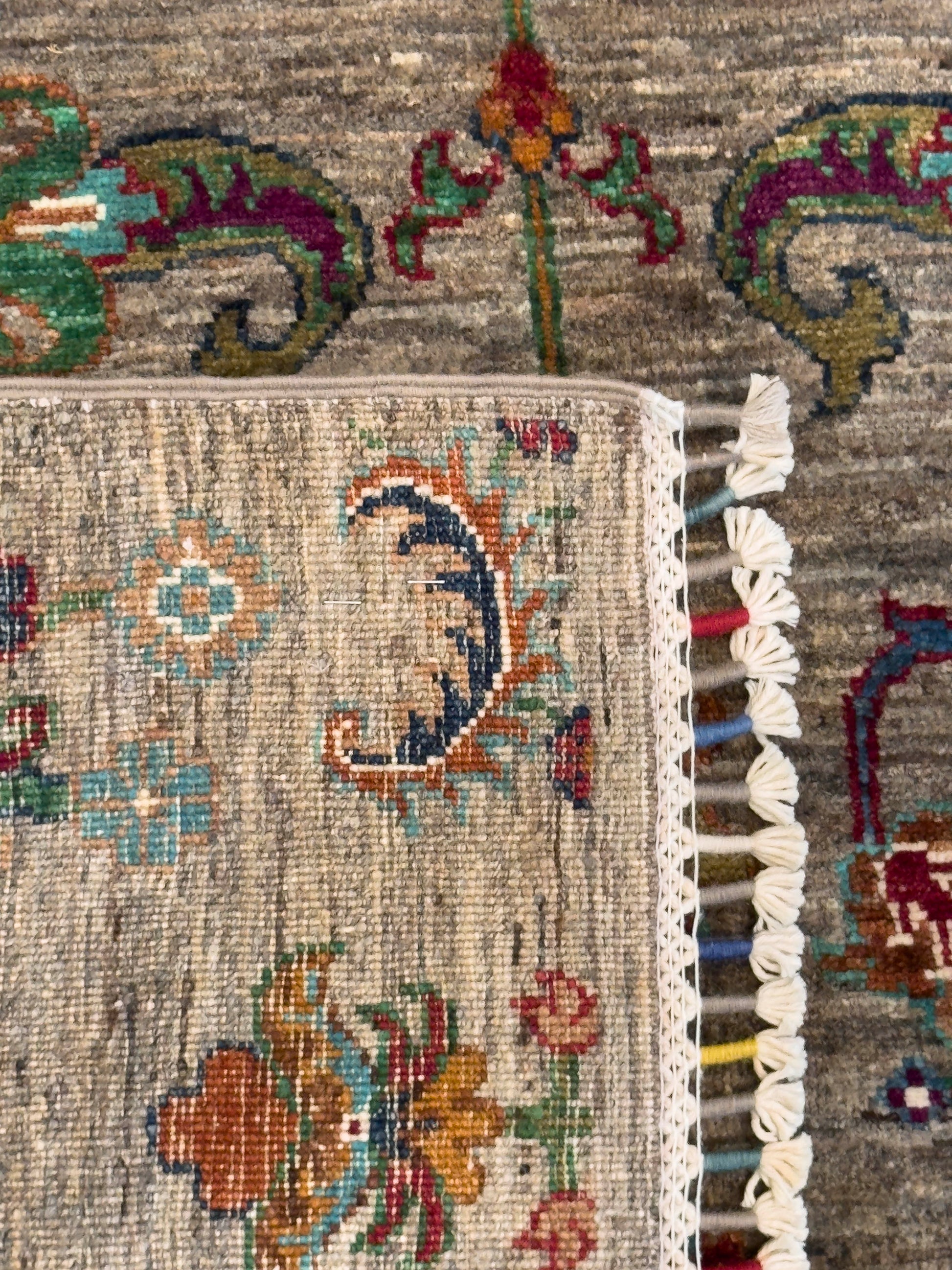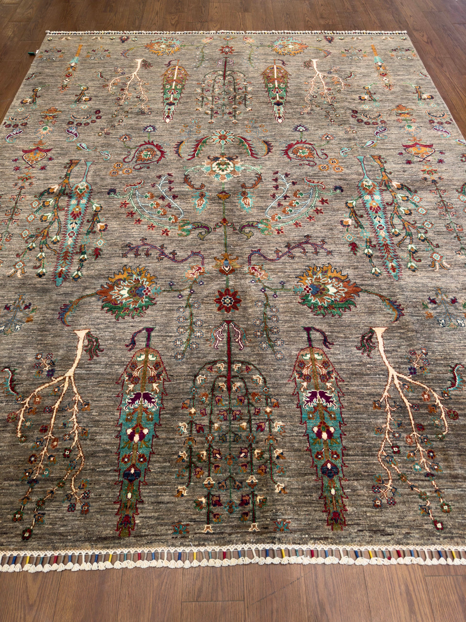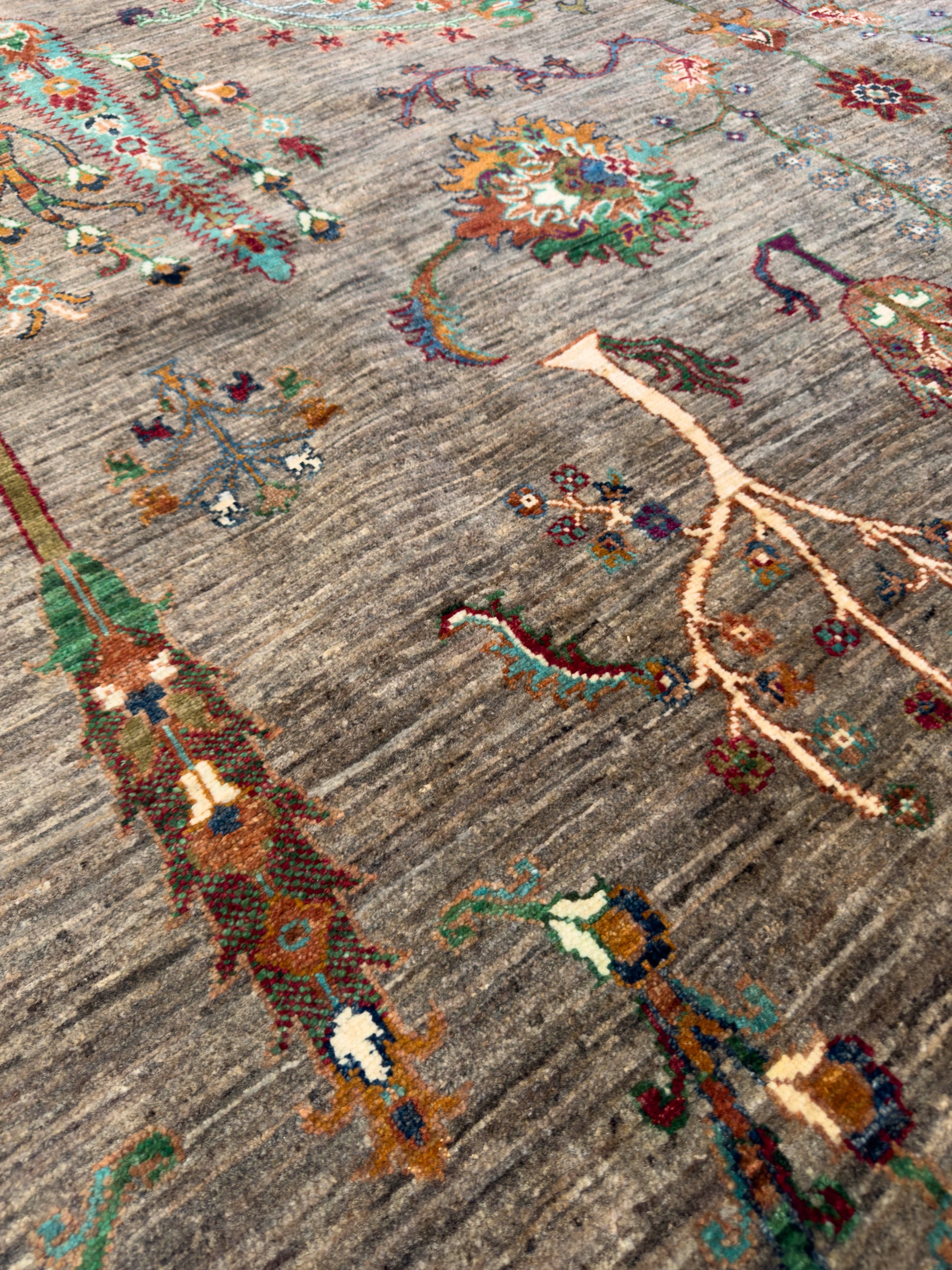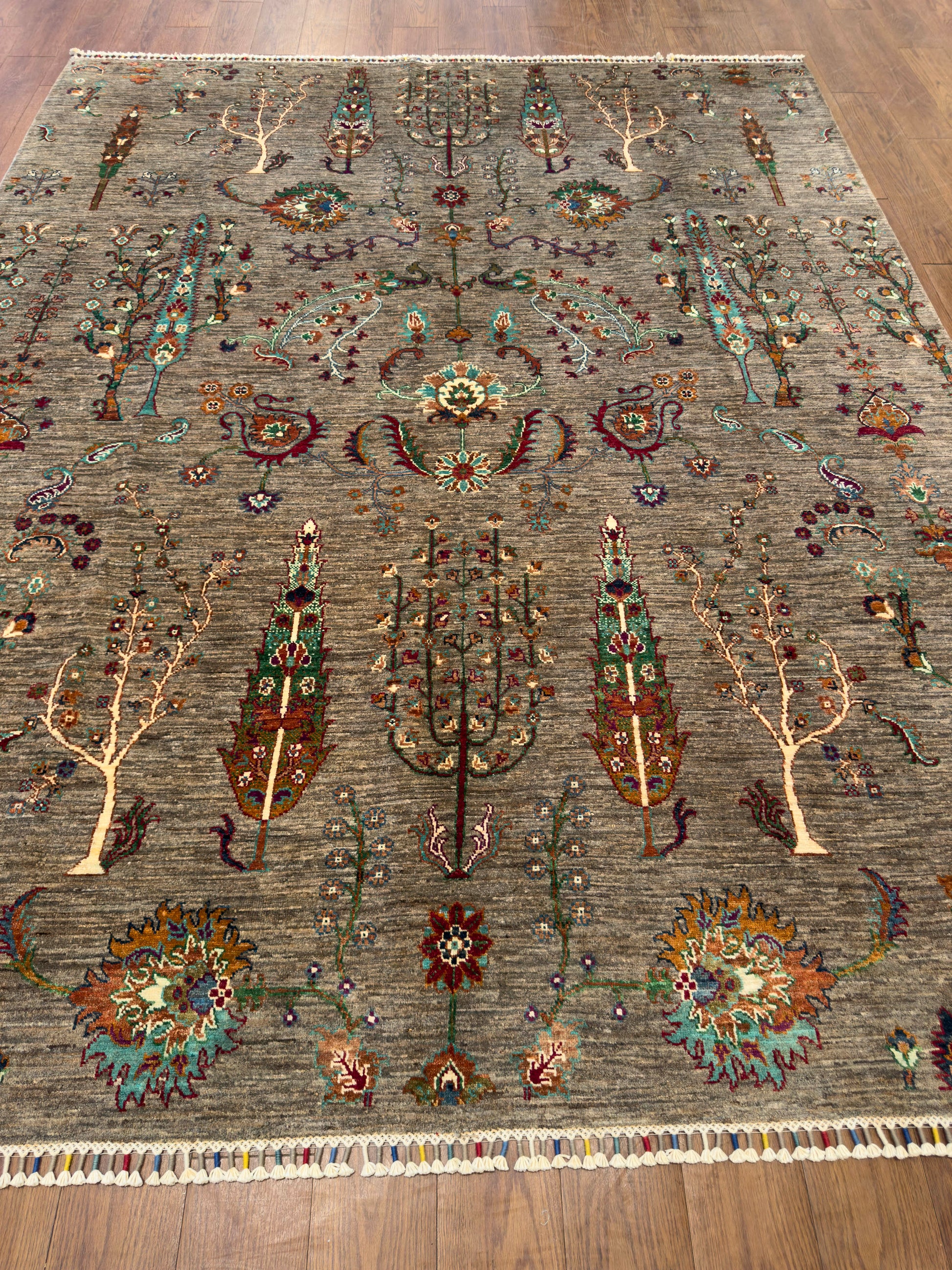 This captivating rug displays a garden-like composition with flowing vines, stylized trees, and intricate floral motifs arranged with rhythmic balance. The earthy brown-gray field provides a grounding backdrop, while the accents of teal, burgundy, gold, and ivory bring vivid contrast and life to the design. Its artistry evokes the feeling of a flourishing orchard, adding elegance and natural charm to any space.