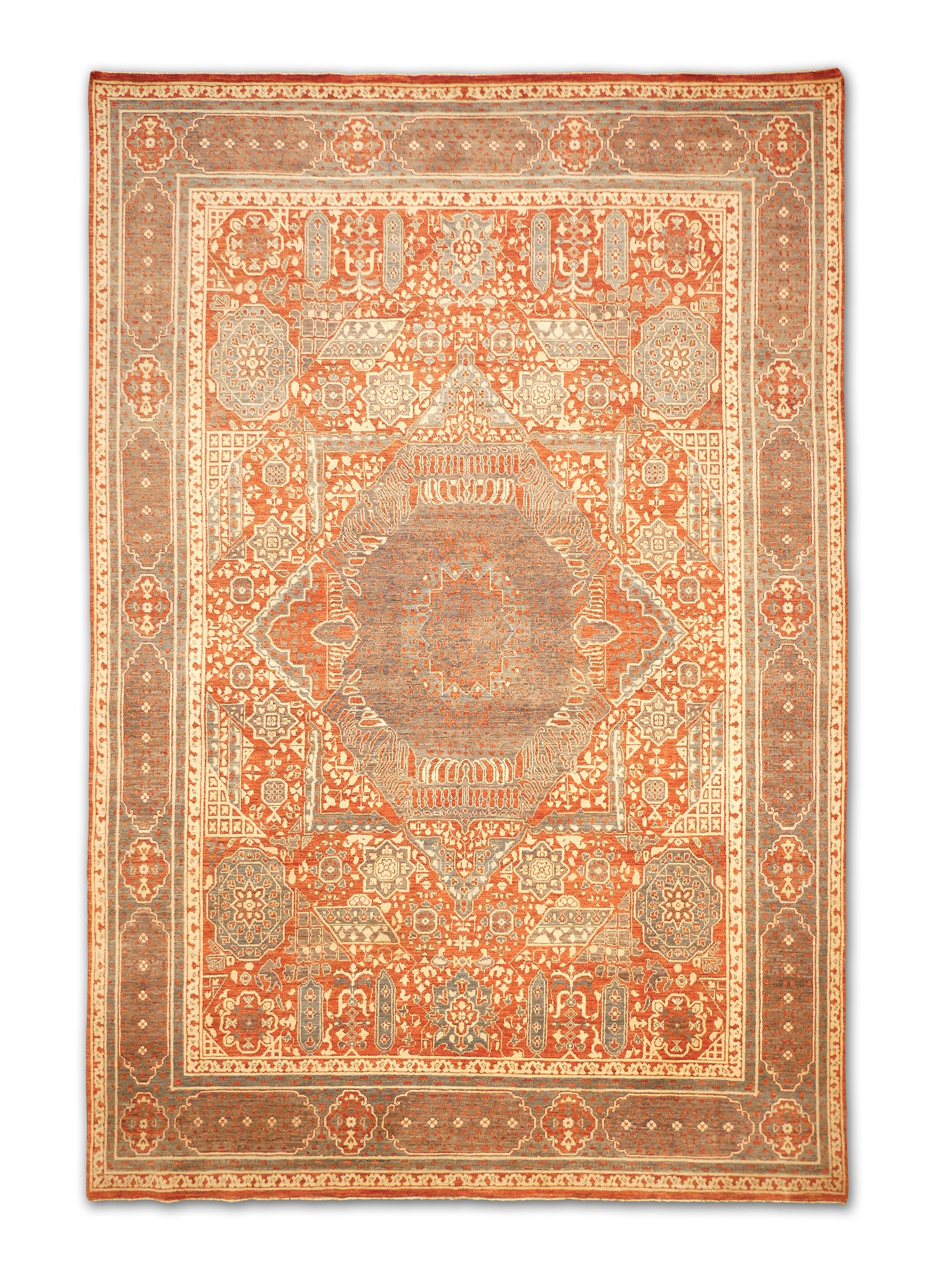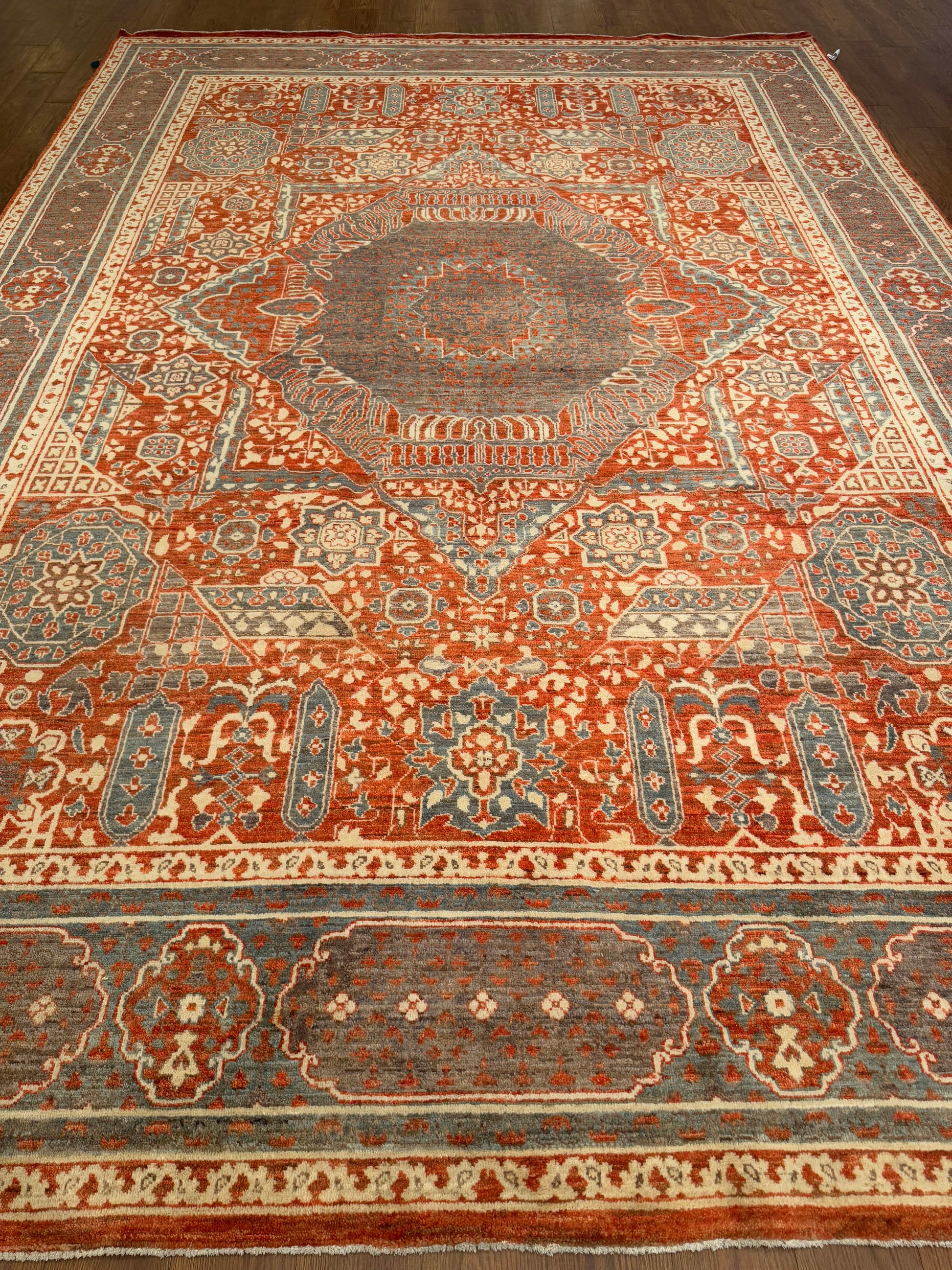 This magnificent handwoven rug features a bold central medallion framed by layers of intricate geometric motifs and stylized floral accents. The palette is dominated by rich terracotta red and muted slate blue, softened with ivory highlights that bring balance and contrast. Its detailed border frames the composition with symmetry, enhancing the sense of grandeur and structure. The large scale and commanding design make it an ideal statement piece for expansive living rooms, dining spaces, or formal interiors.