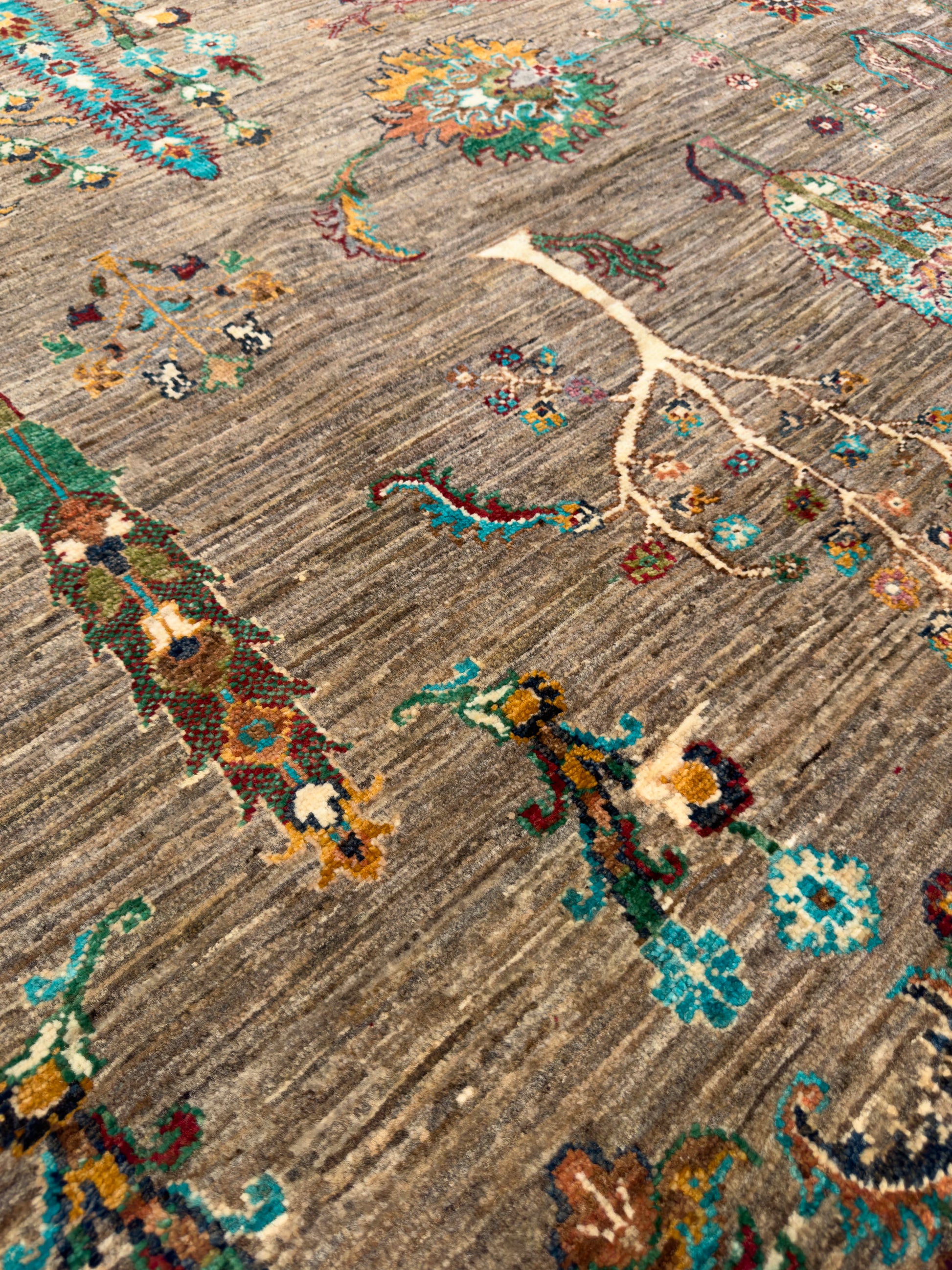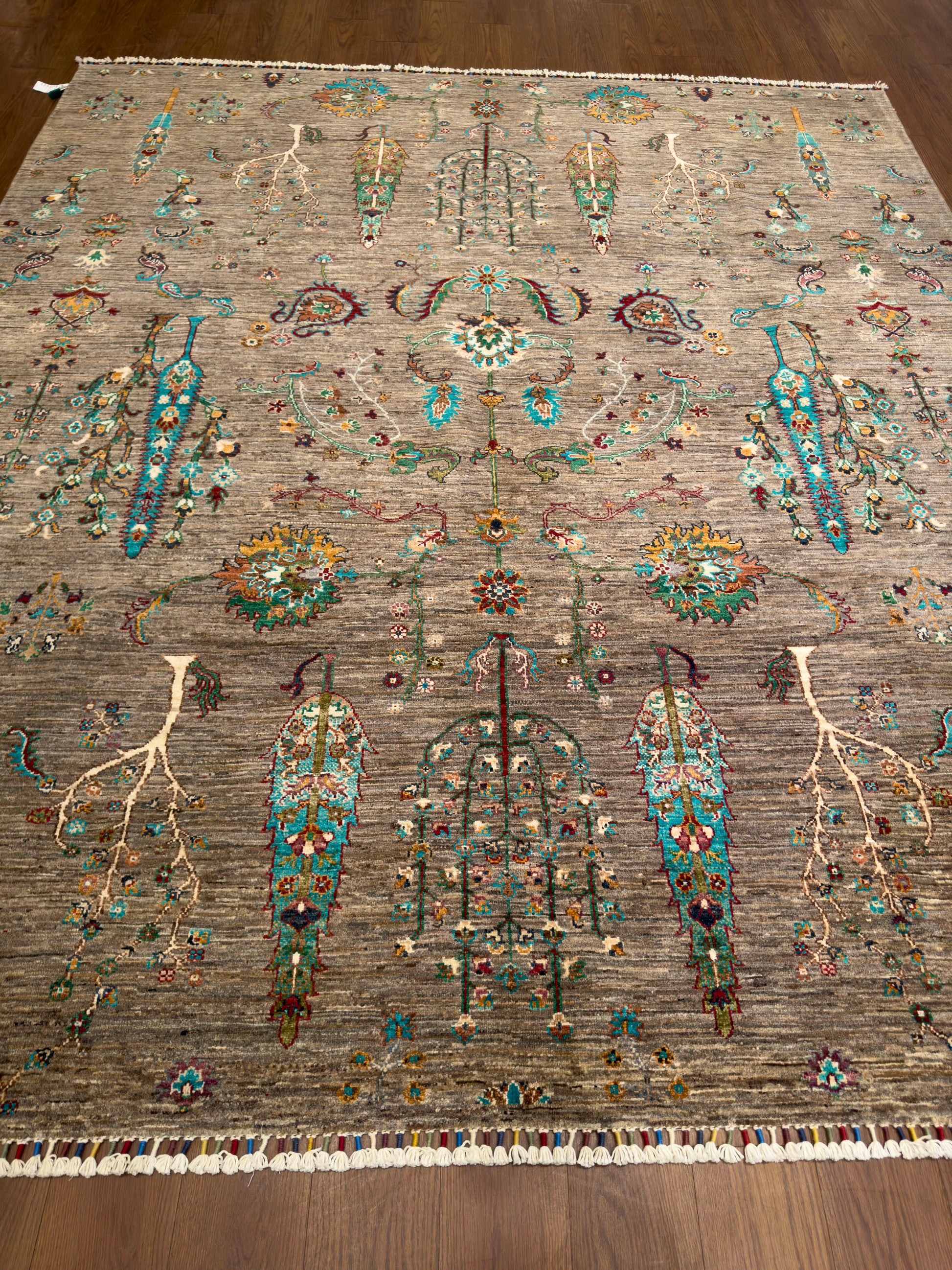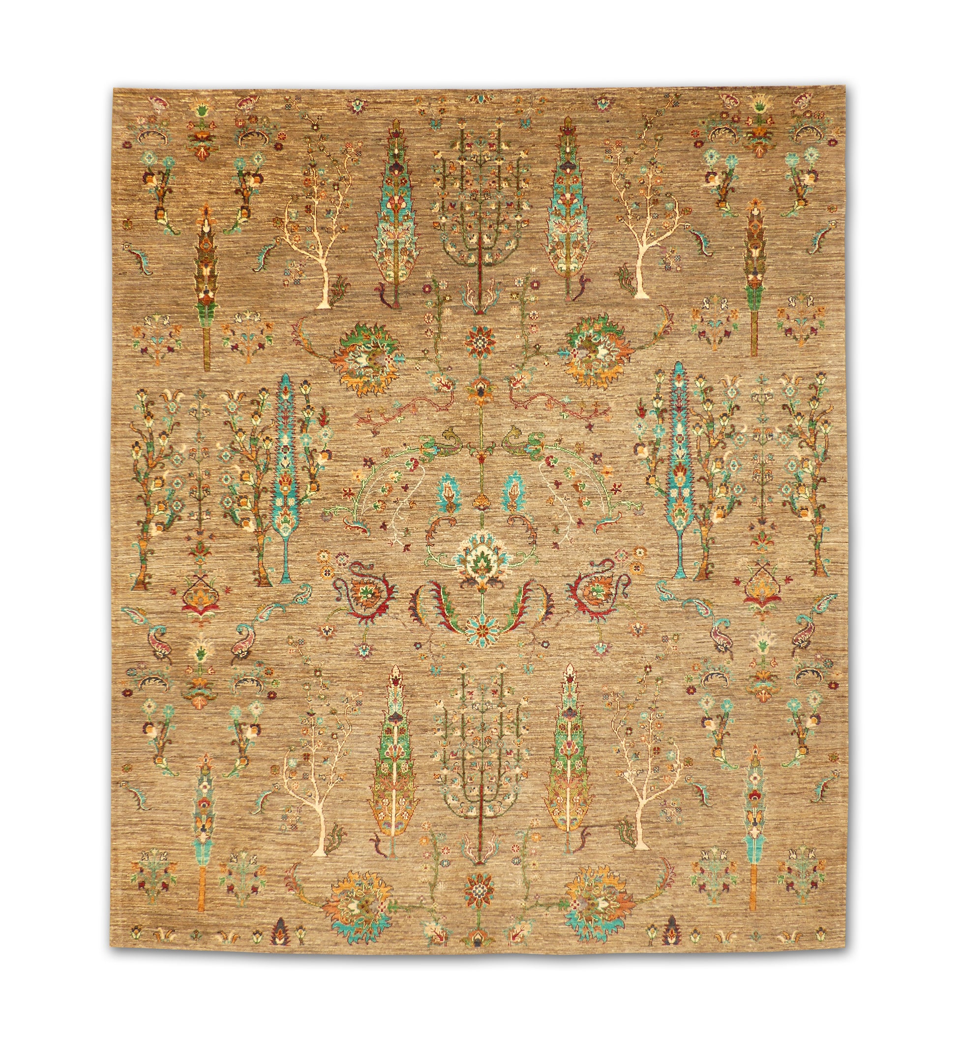 This rug showcases an elegant arrangement of branching motifs, blossoms, and stylized foliage that flow upward in a balanced, symmetrical design. The taupe-brown ground creates a warm and grounding base, while shades of teal, turquoise, ivory, gold, and burgundy add vibrancy and depth. The intricate botanical patterns suggest growth and harmony, making this piece both timeless and captivating.