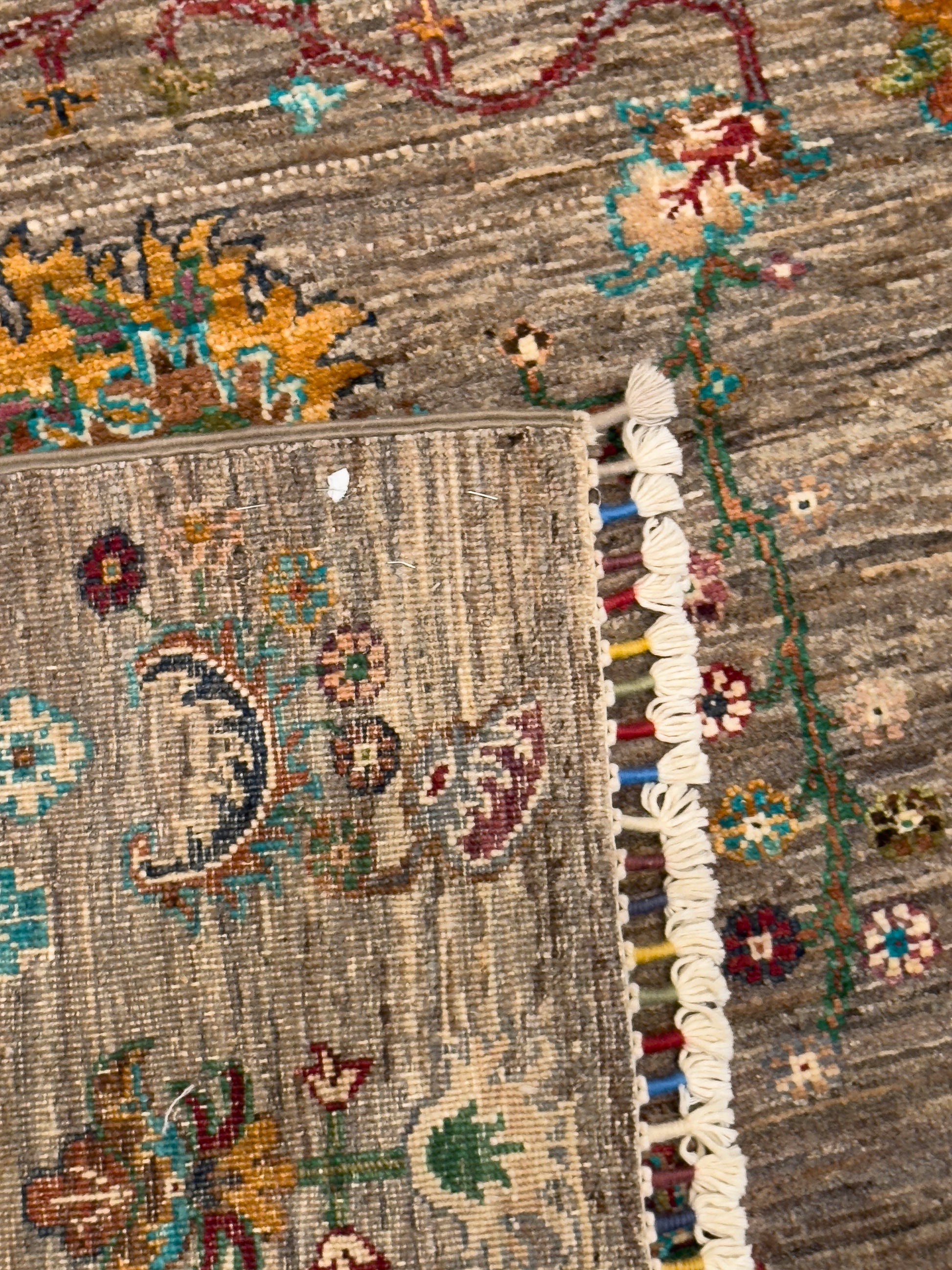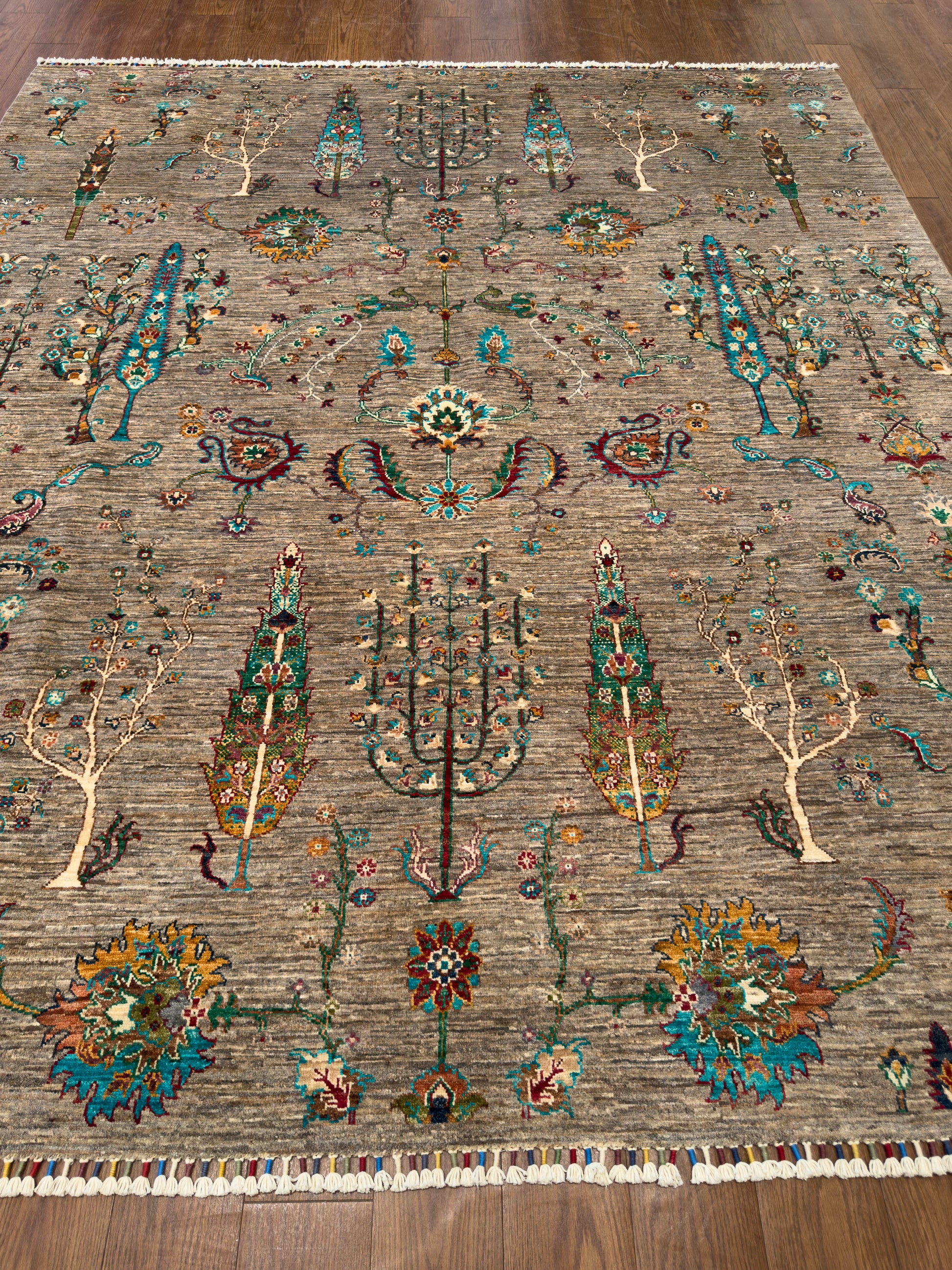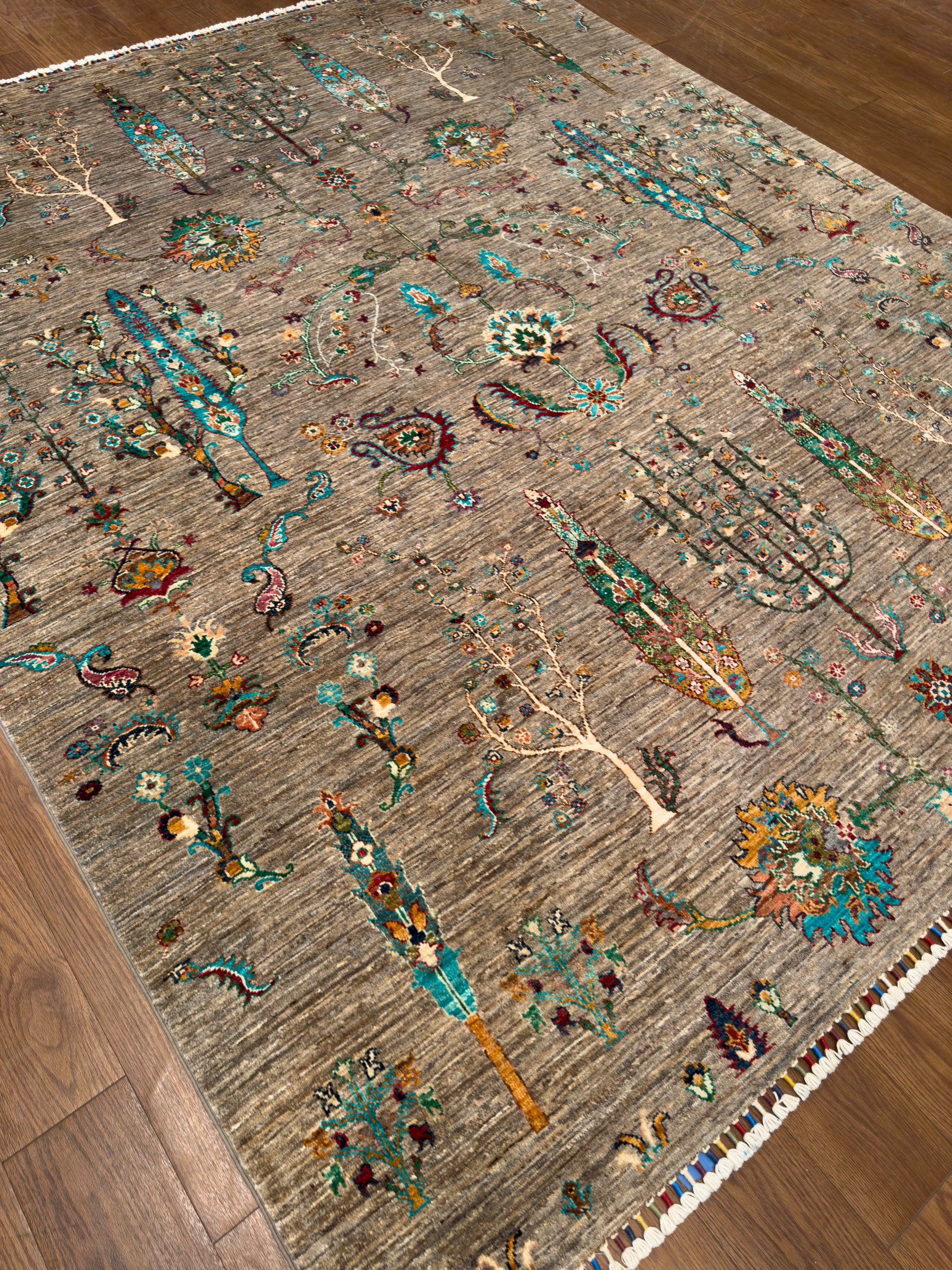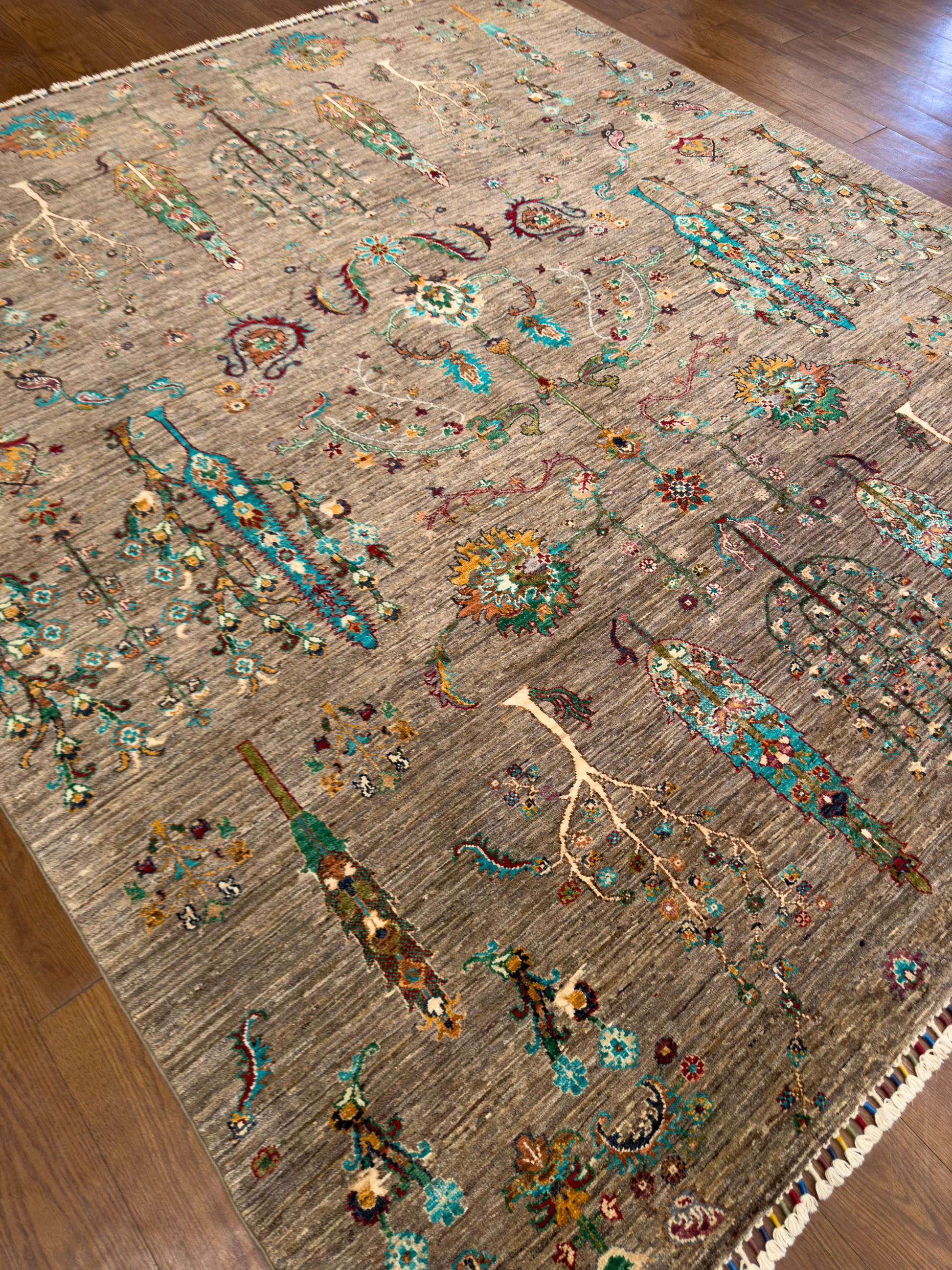 This rug showcases an elegant arrangement of branching motifs, blossoms, and stylized foliage that flow upward in a balanced, symmetrical design. The taupe-brown ground creates a warm and grounding base, while shades of teal, turquoise, ivory, gold, and burgundy add vibrancy and depth. The intricate botanical patterns suggest growth and harmony, making this piece both timeless and captivating.