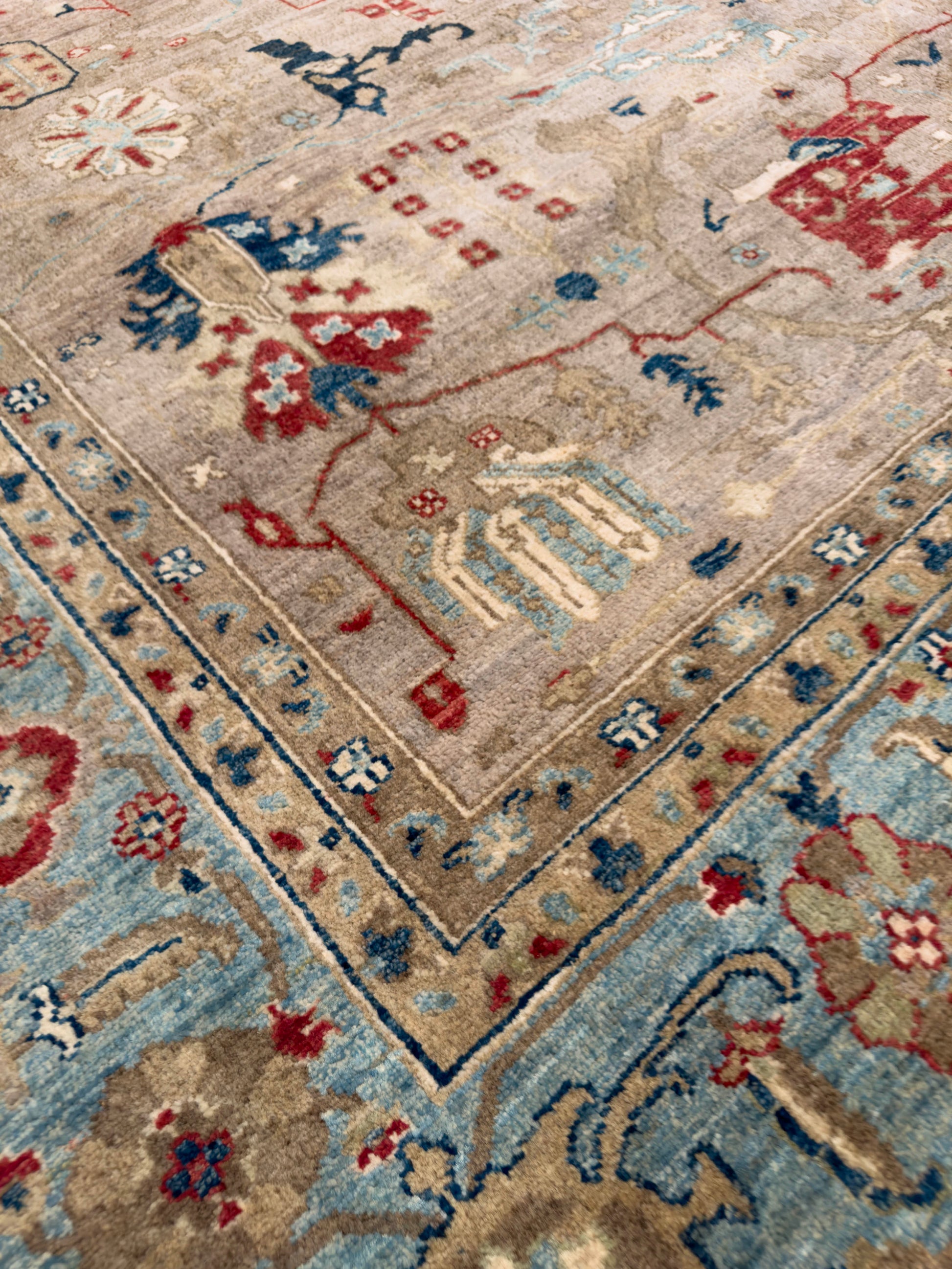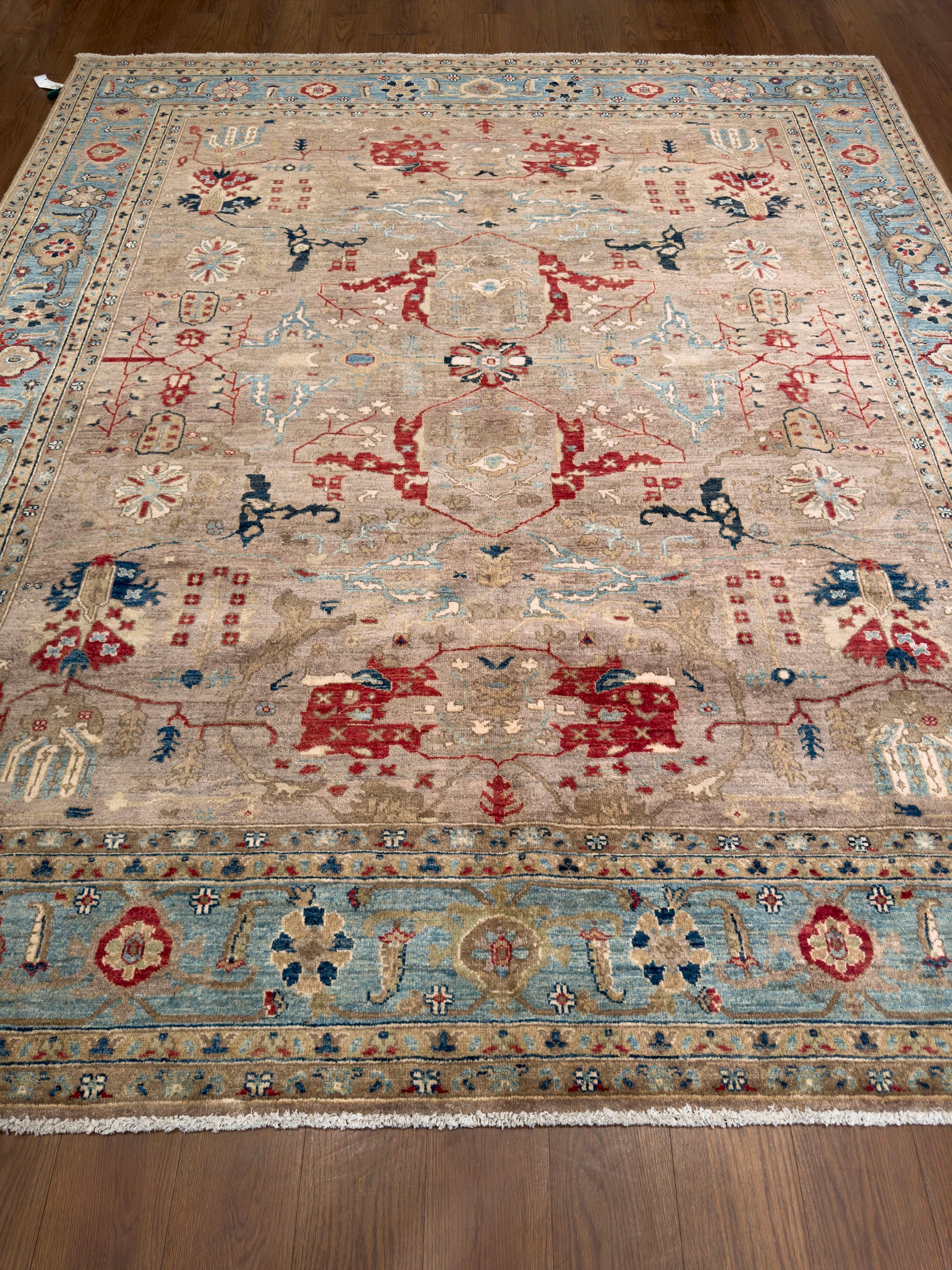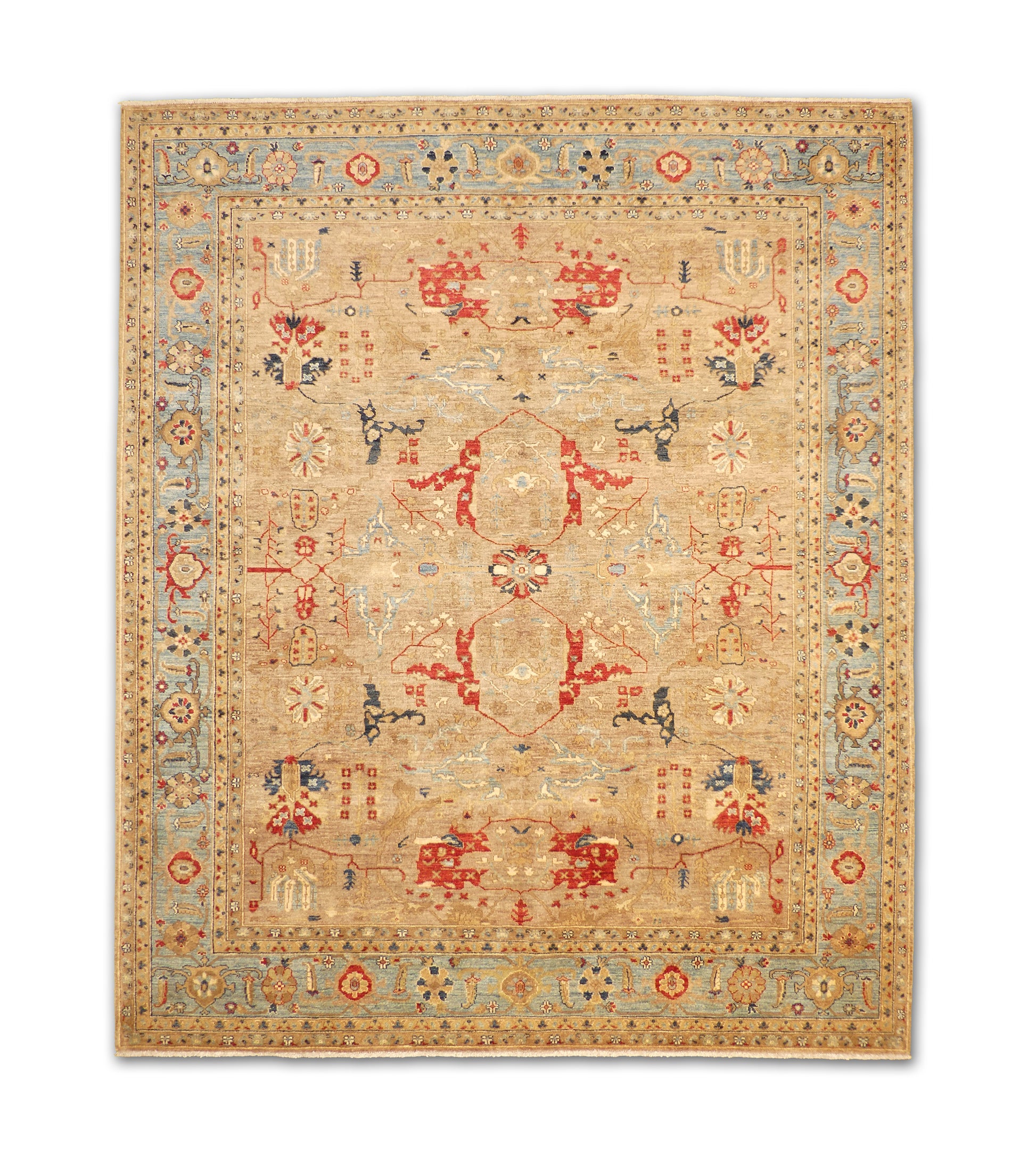 This elegant handwoven rug blends soft beige and taupe tones with striking accents of red and blue. Its design features large-scale geometric medallions complemented by stylized floral and vine motifs, creating a sense of balance and movement. The contrasting blue border with intricate detailing frames the piece beautifully, adding depth and refinement. A versatile rug that merges tradition with timeless appeal.