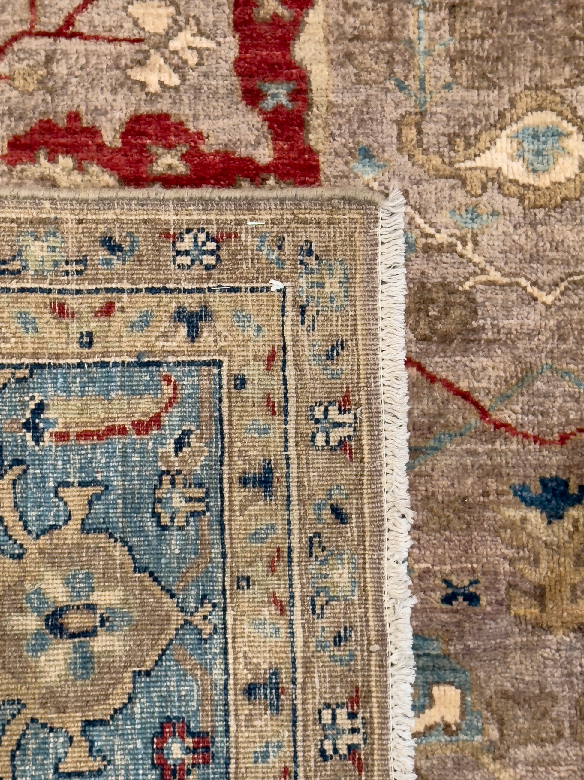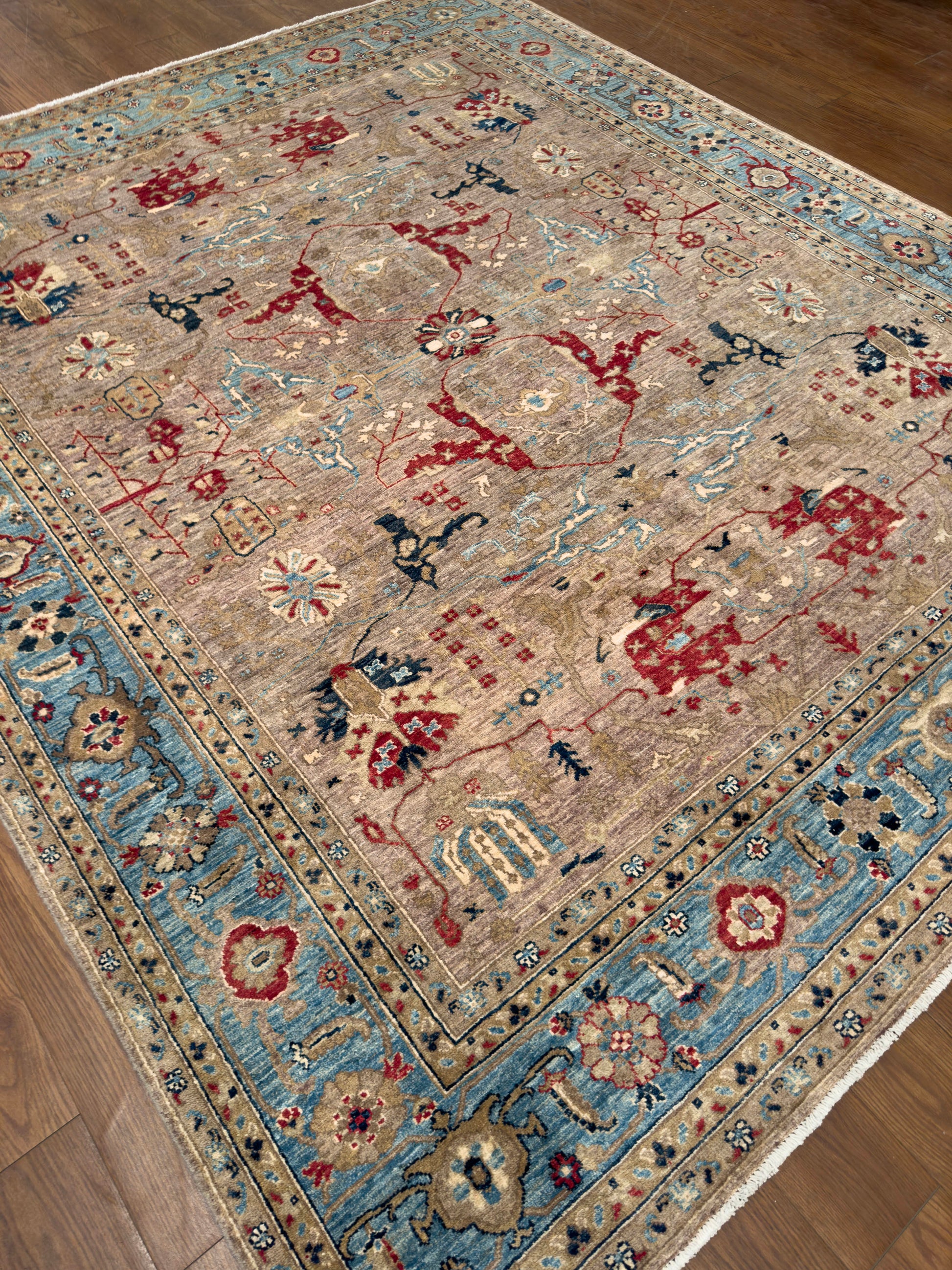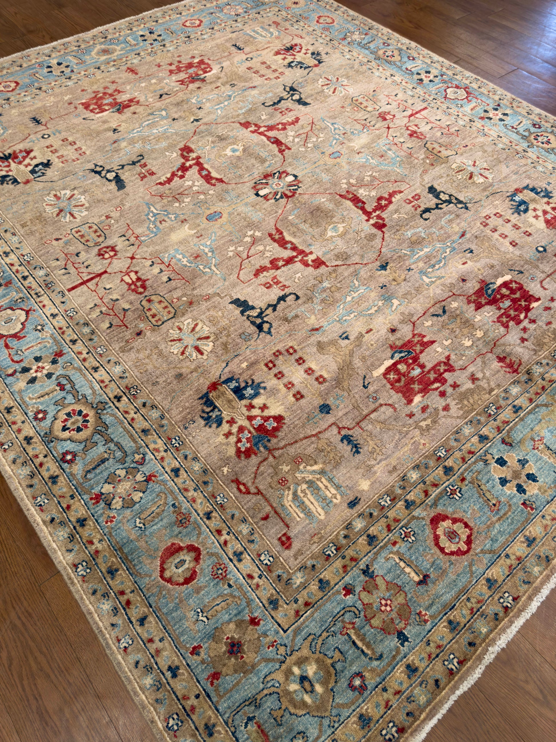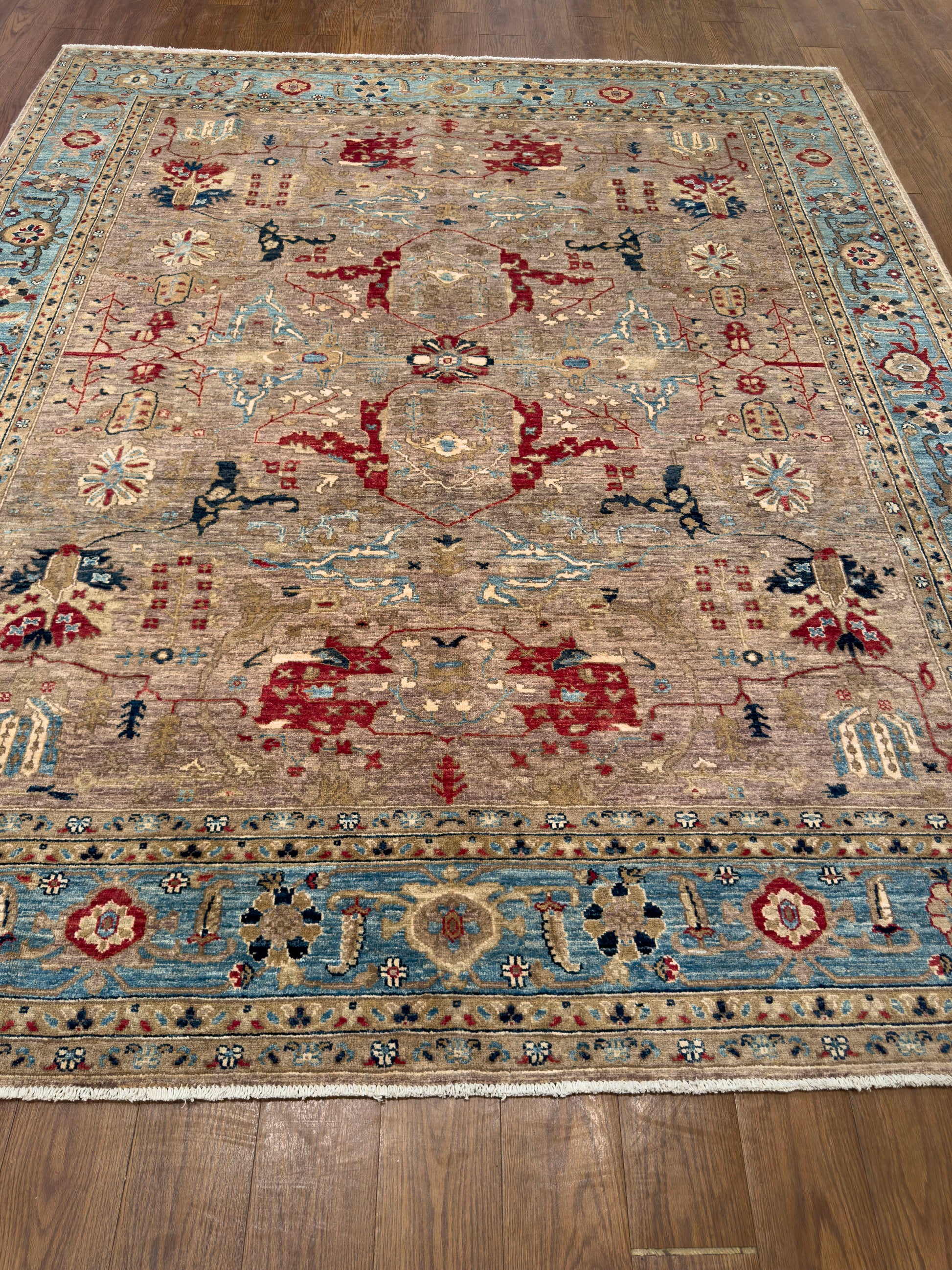 This elegant handwoven rug blends soft beige and taupe tones with striking accents of red and blue. Its design features large-scale geometric medallions complemented by stylized floral and vine motifs, creating a sense of balance and movement. The contrasting blue border with intricate detailing frames the piece beautifully, adding depth and refinement. A versatile rug that merges tradition with timeless appeal.