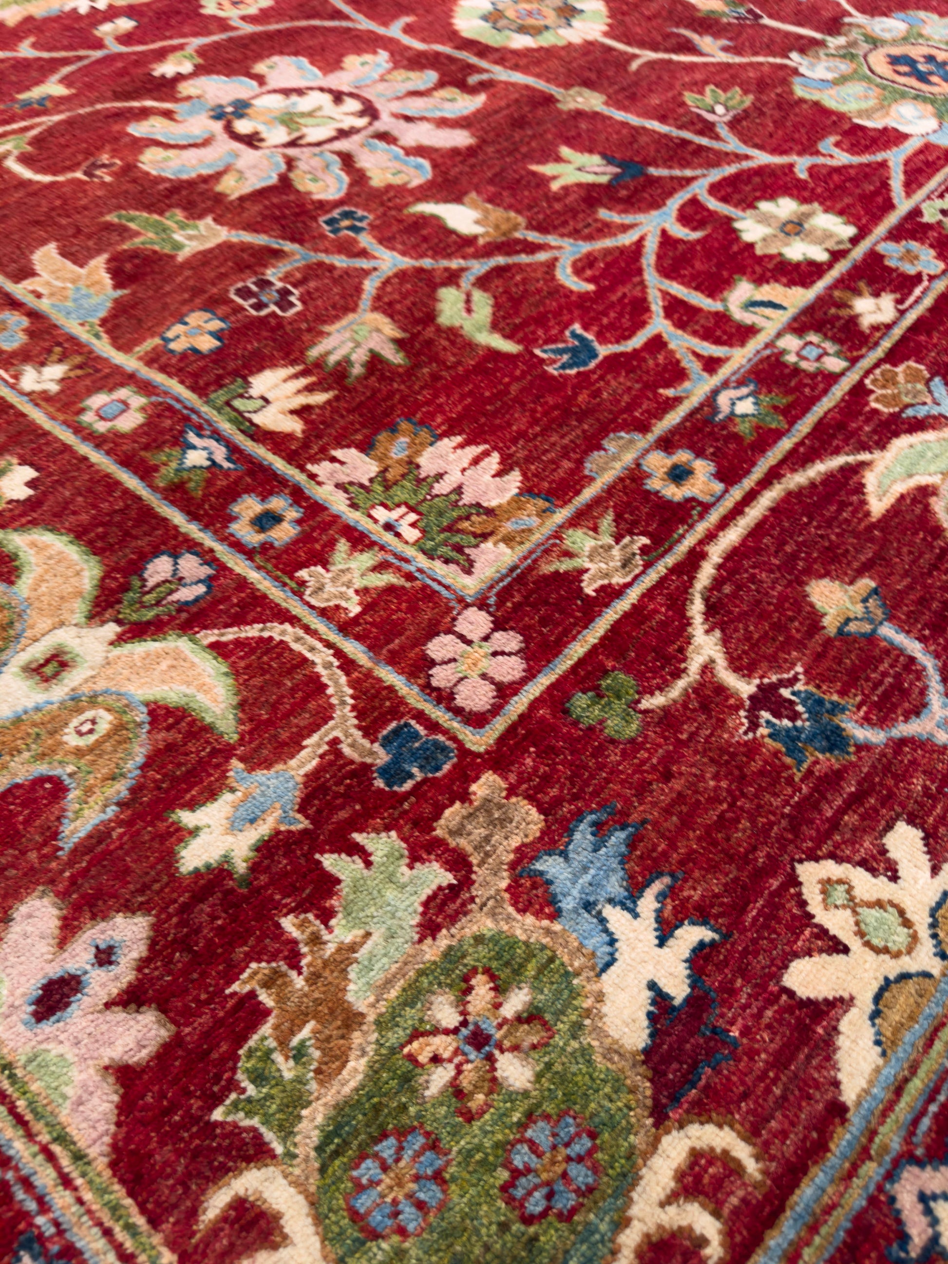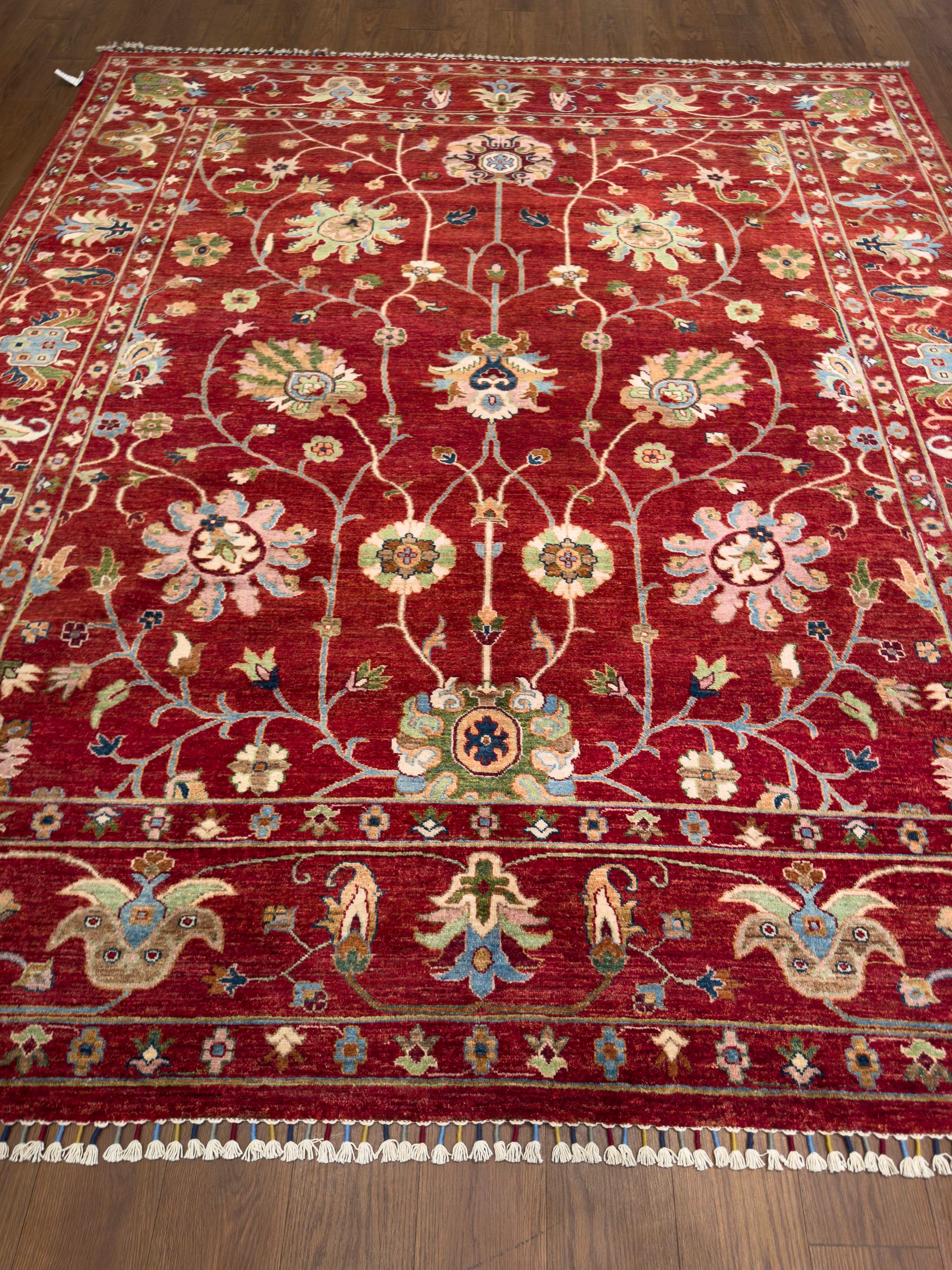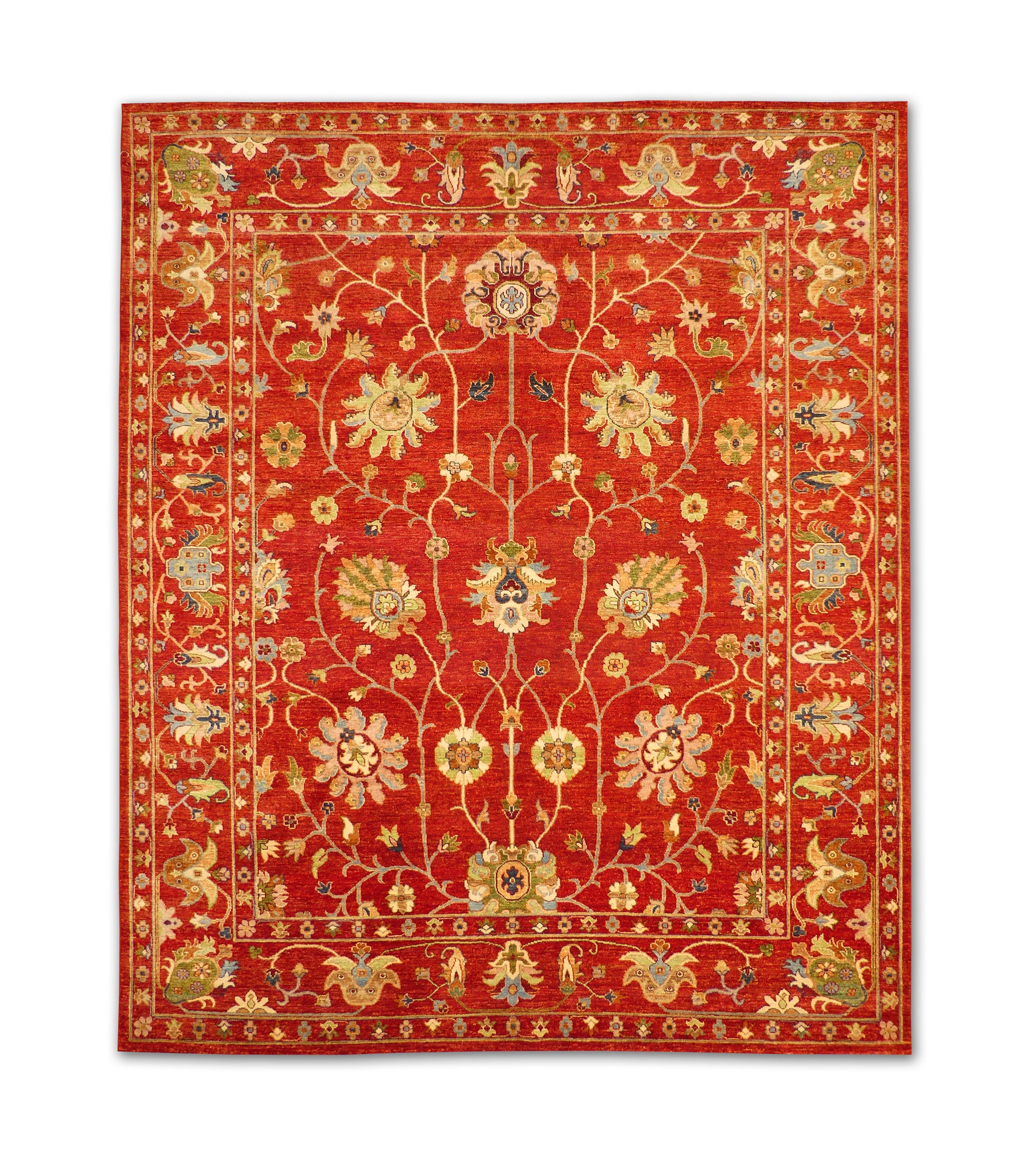 This handwoven rug radiates elegance with its vivid red field, adorned by gracefully curving vines and large floral motifs. The harmonious interplay of ivory, blue, green, and gold accents creates a balanced and timeless aesthetic. Framed with a finely detailed border, this piece brings warmth and sophistication to both traditional and transitional interiors.