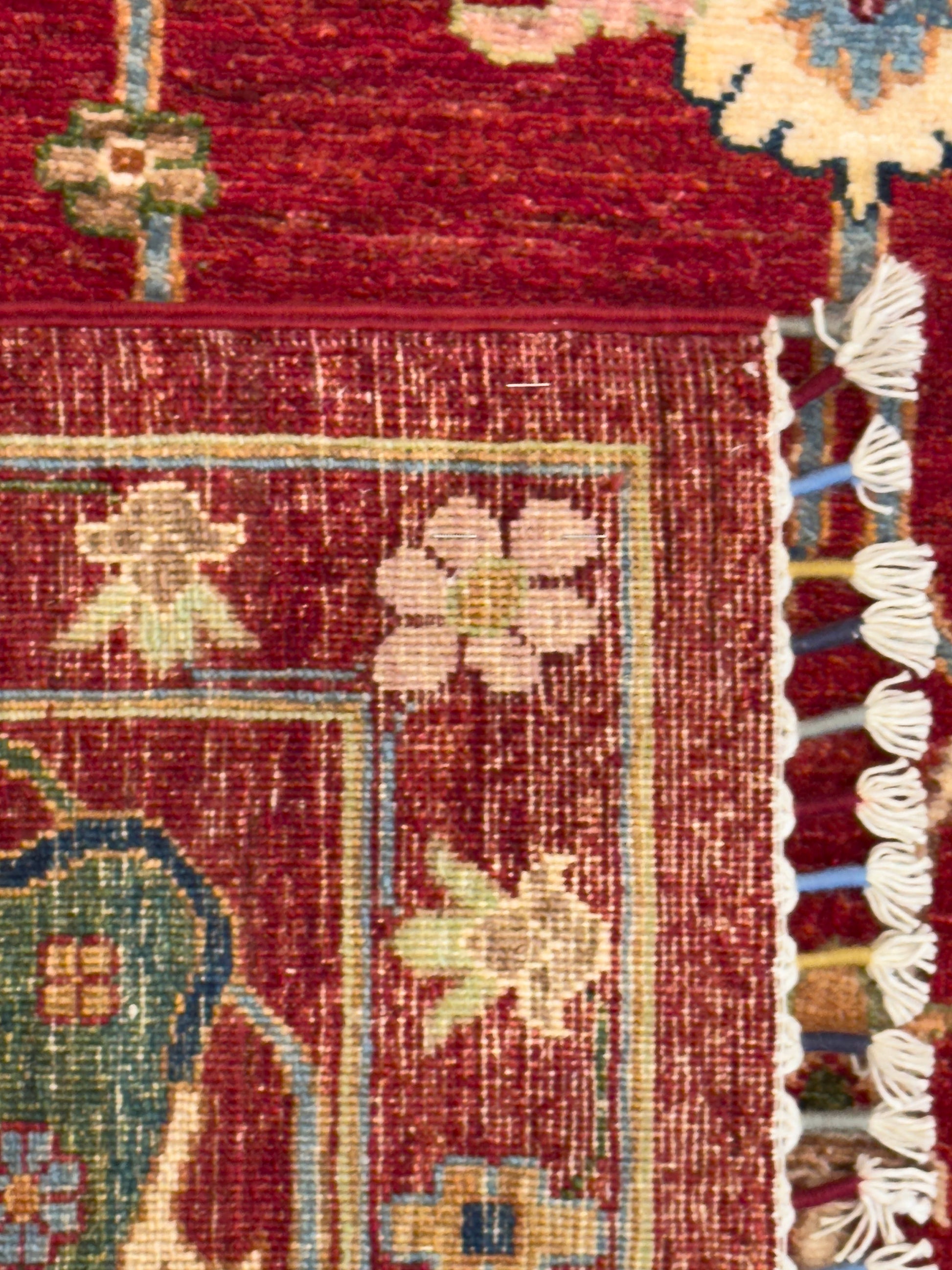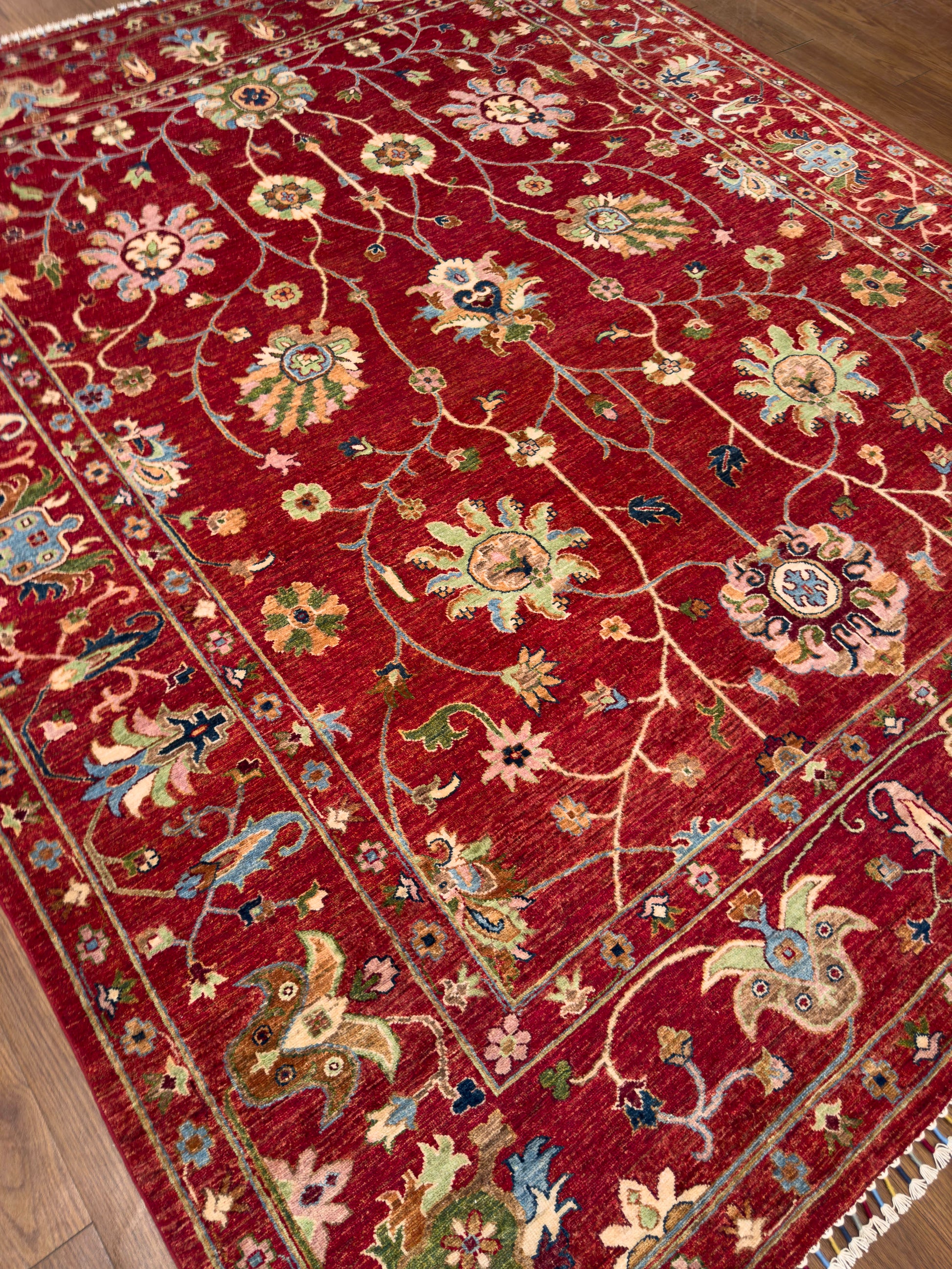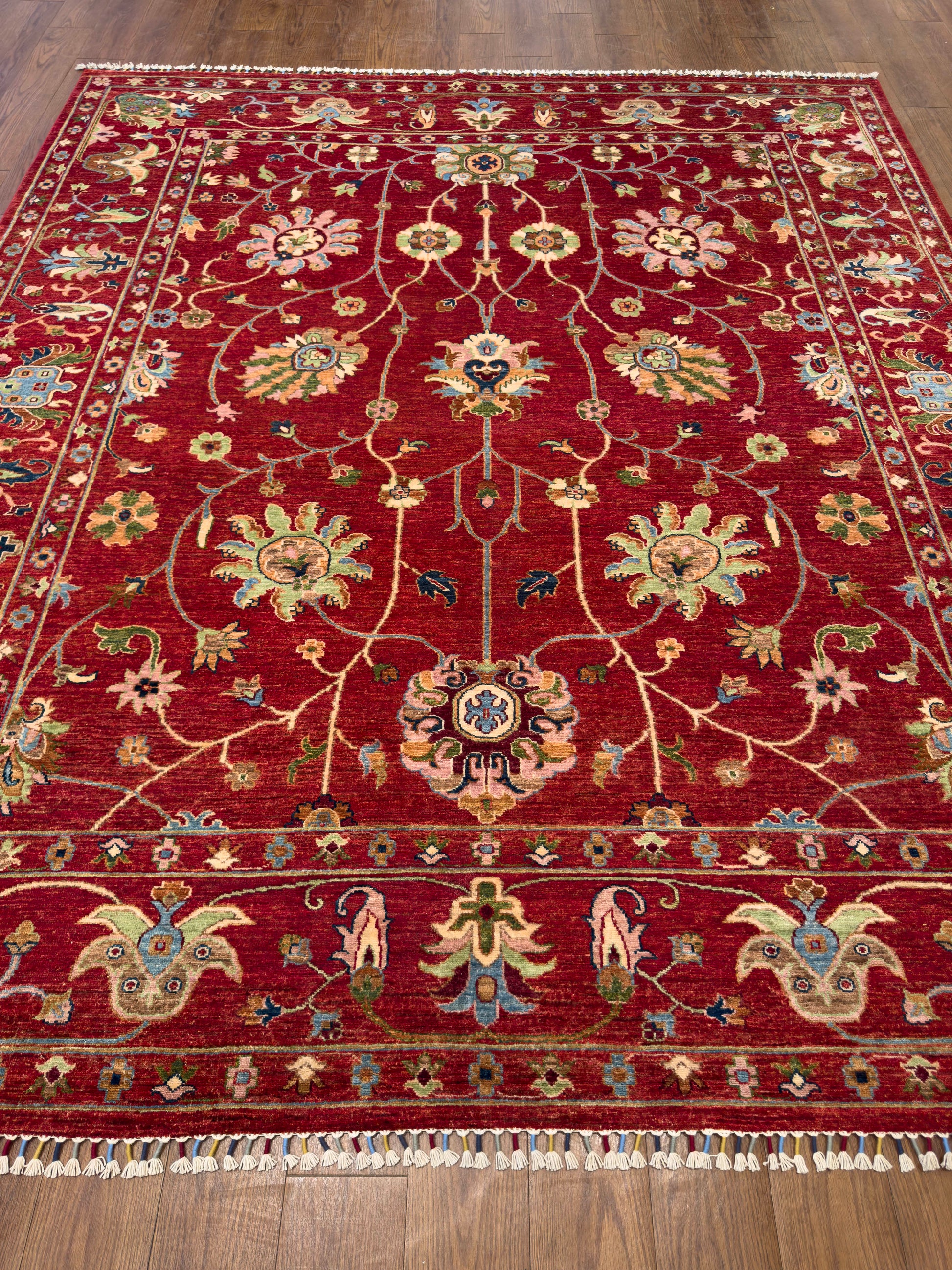 This handwoven rug radiates elegance with its vivid red field, adorned by gracefully curving vines and large floral motifs. The harmonious interplay of ivory, blue, green, and gold accents creates a balanced and timeless aesthetic. Framed with a finely detailed border, this piece brings warmth and sophistication to both traditional and transitional interiors.
