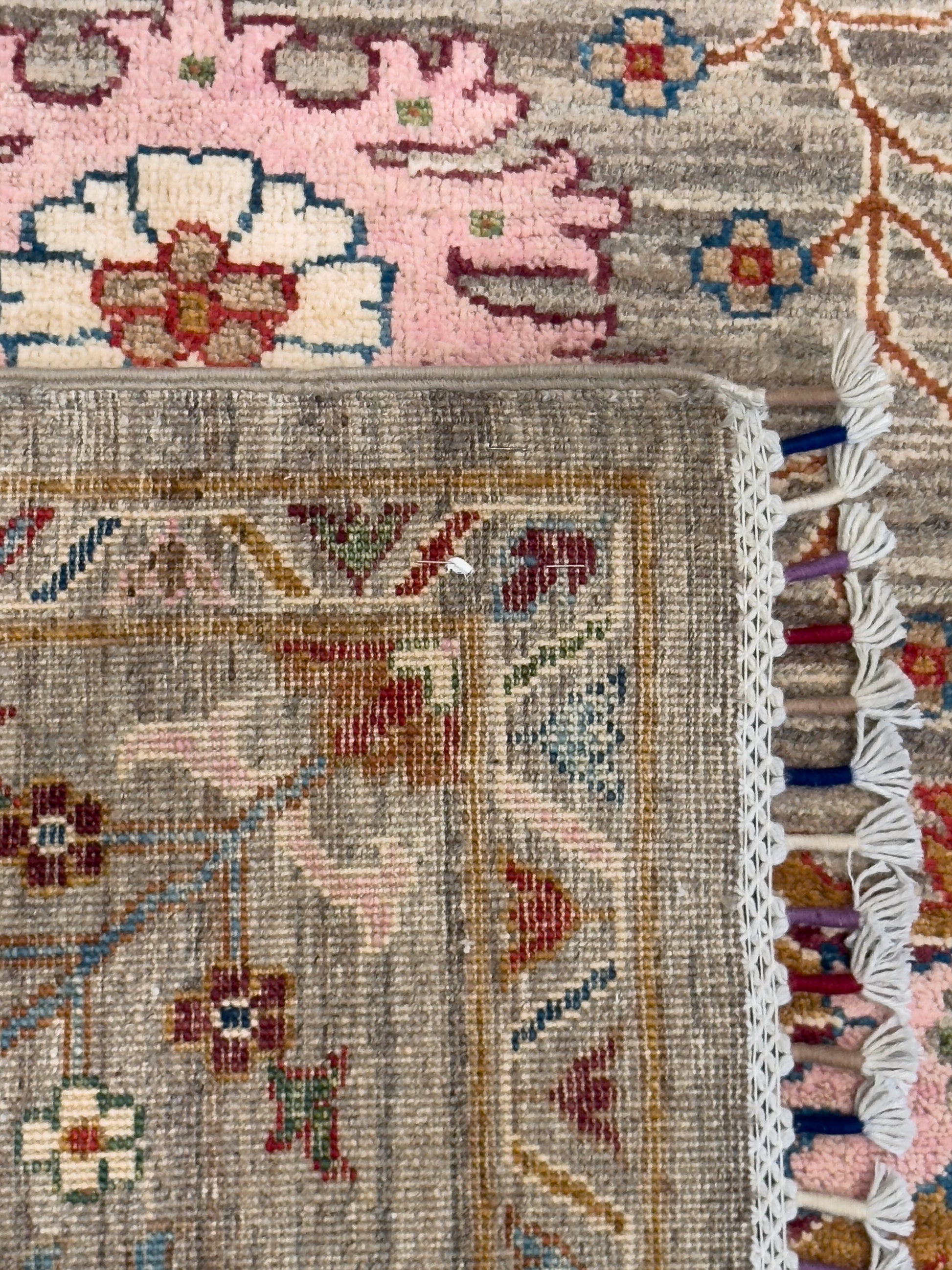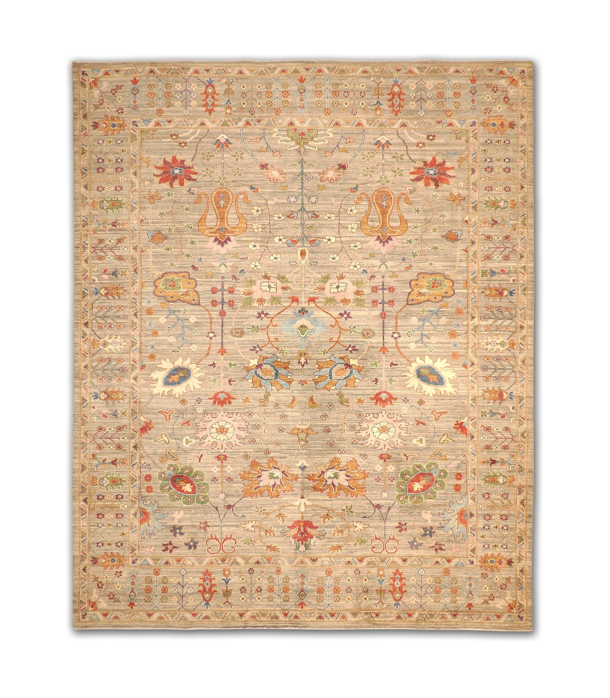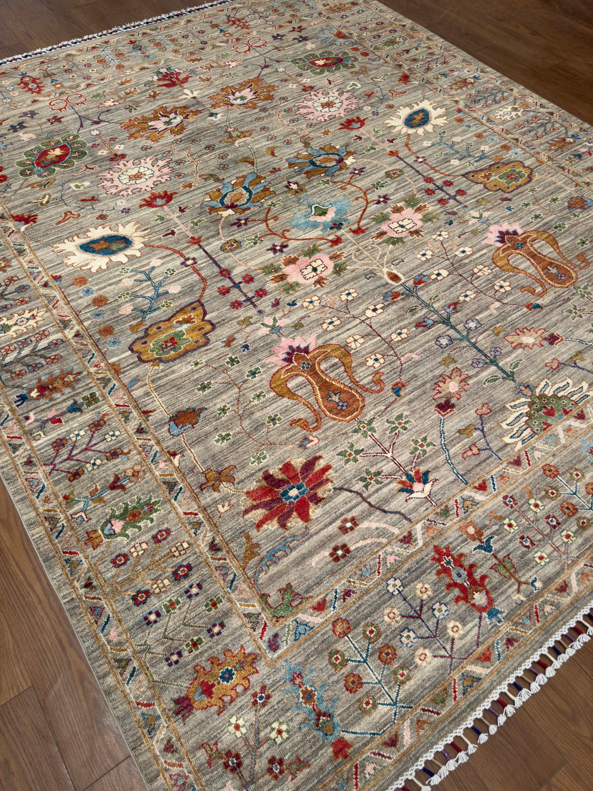 This beautiful handwoven rug features a soft gray background, brought to life by colorful floral and vine motifs in shades of red, blue, green, gold, and ivory. The intricate detailing and balanced symmetry create a sense of harmony and refinement. Perfect for adding elegance and warmth, it complements both traditional and transitional interiors.