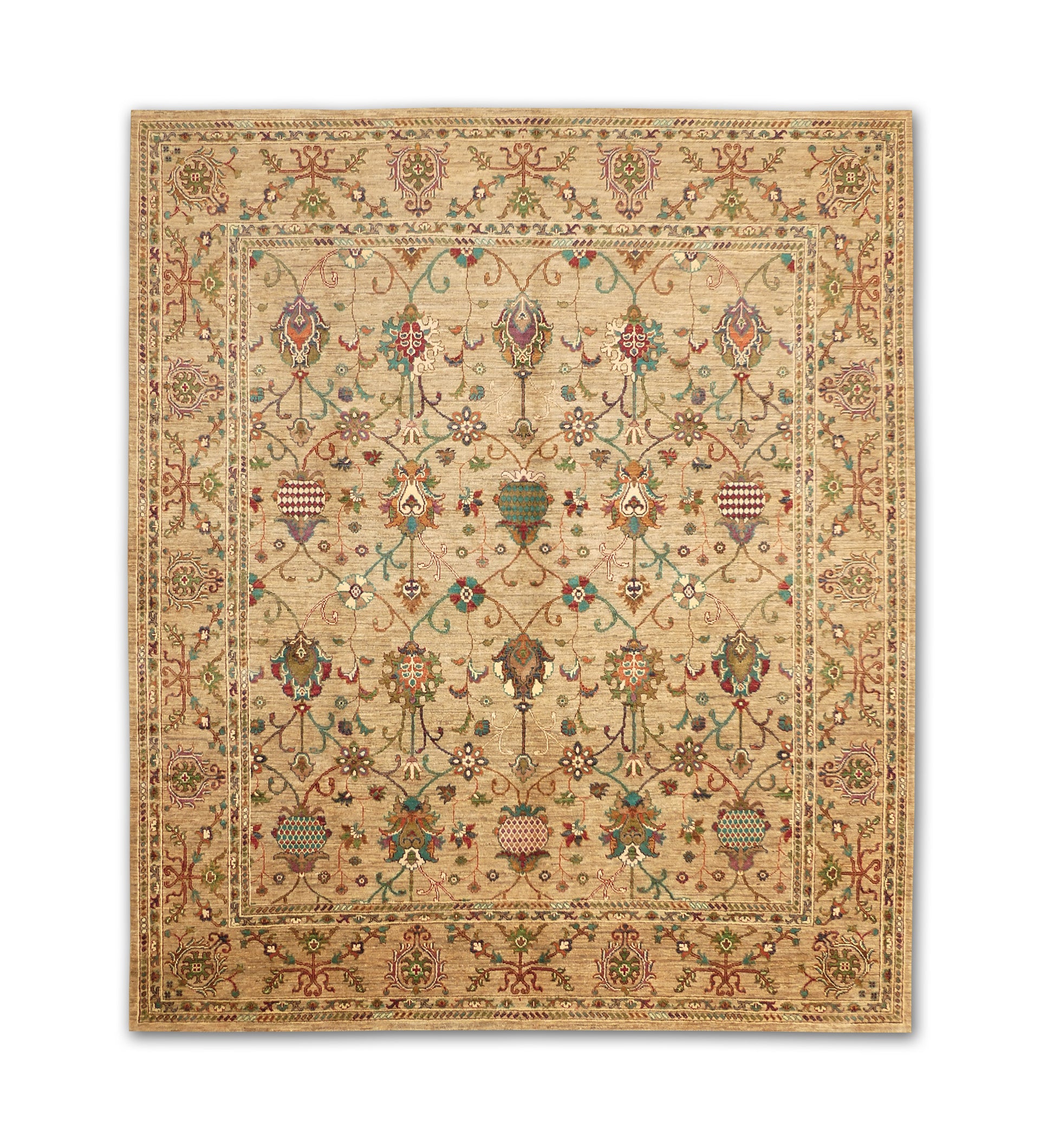 This elegant handwoven rug features a warm beige background adorned with finely detailed floral and lattice motifs in shades of teal, burgundy, ivory, and soft green. The repeating patterns and graceful vines create a sense of symmetry and sophistication. A versatile piece, it brings timeless charm to both formal and transitional interiors.