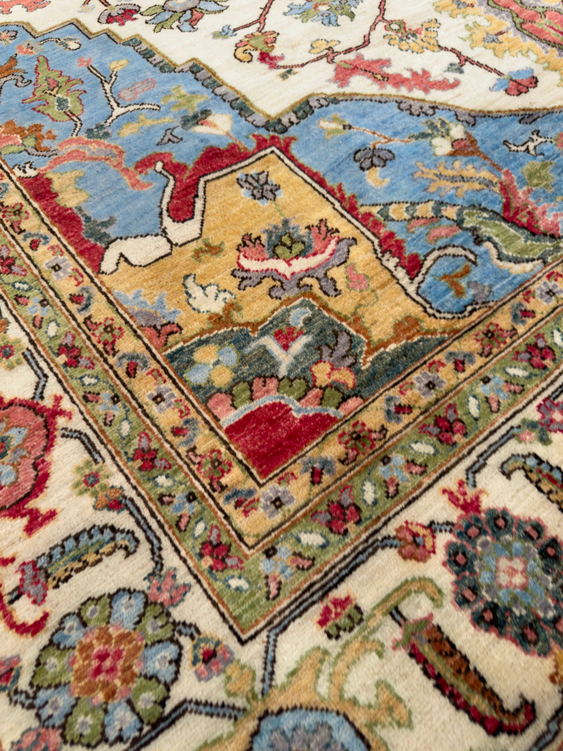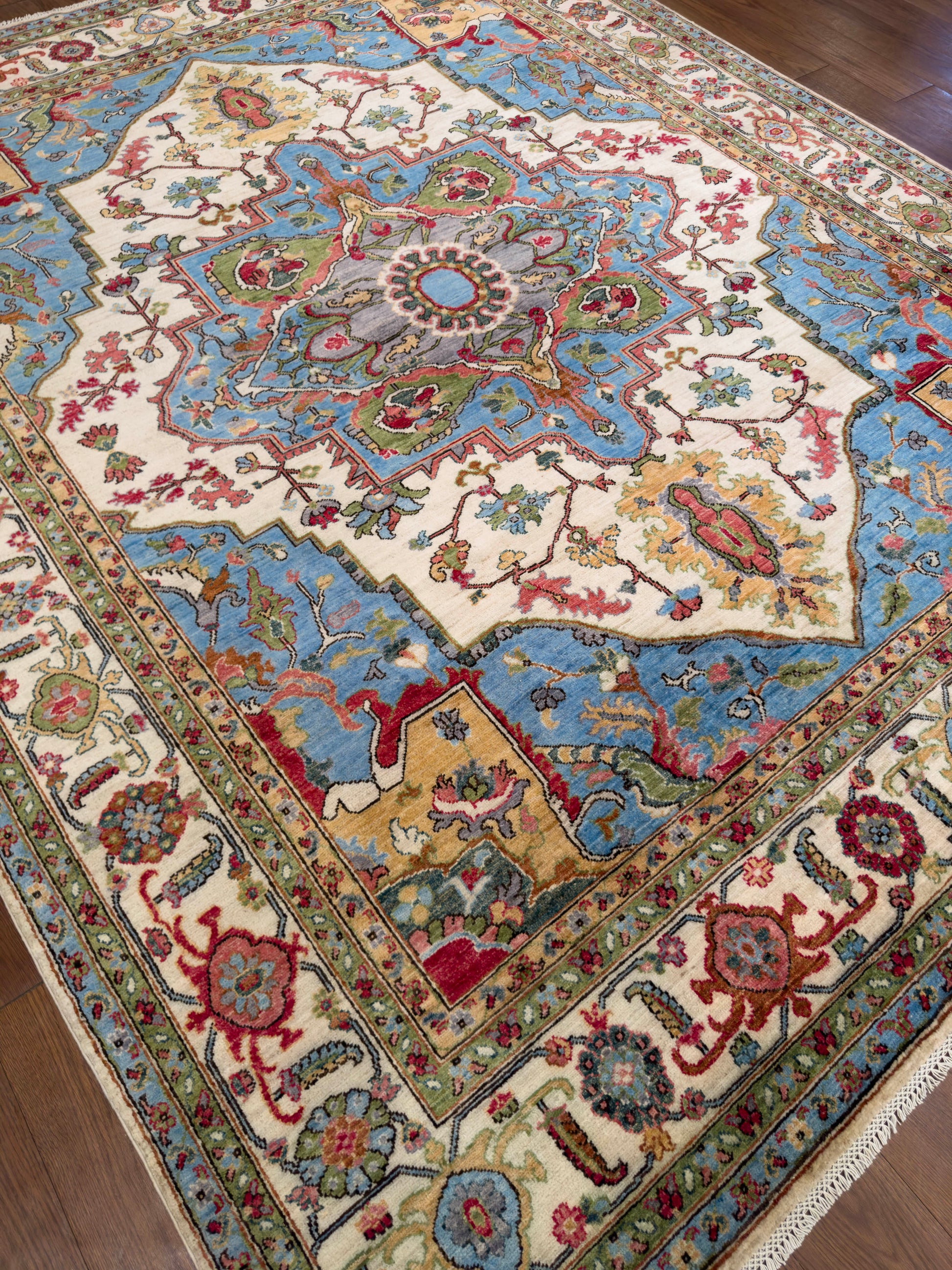 This exquisite handwoven rug highlights a bold central medallion on an ivory field, framed by intricate floral and geometric motifs. Its rich palette of sky blue, sage green, deep red, and golden yellow brings both vibrancy and harmony to the design. Elegant scrolling vines and layered borders complete the piece, offering timeless beauty and lasting craftsmanship.