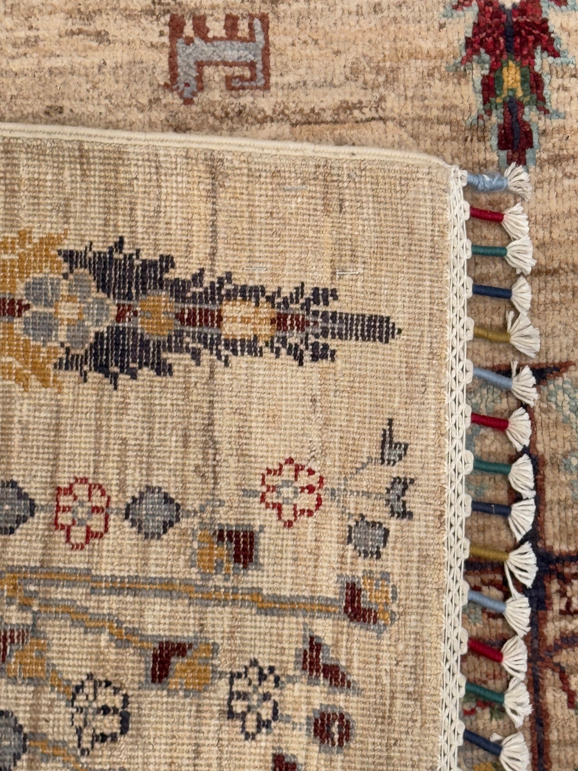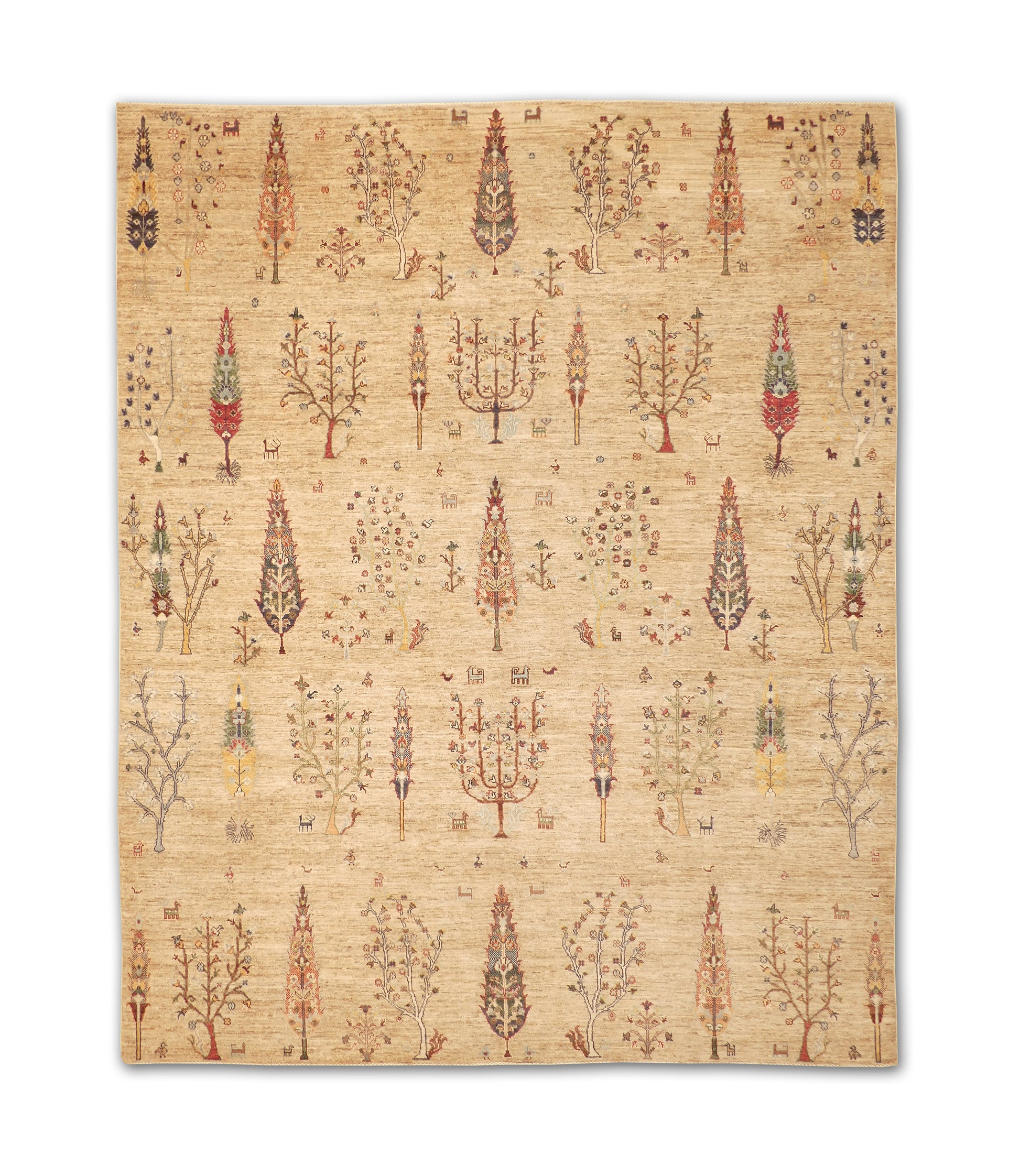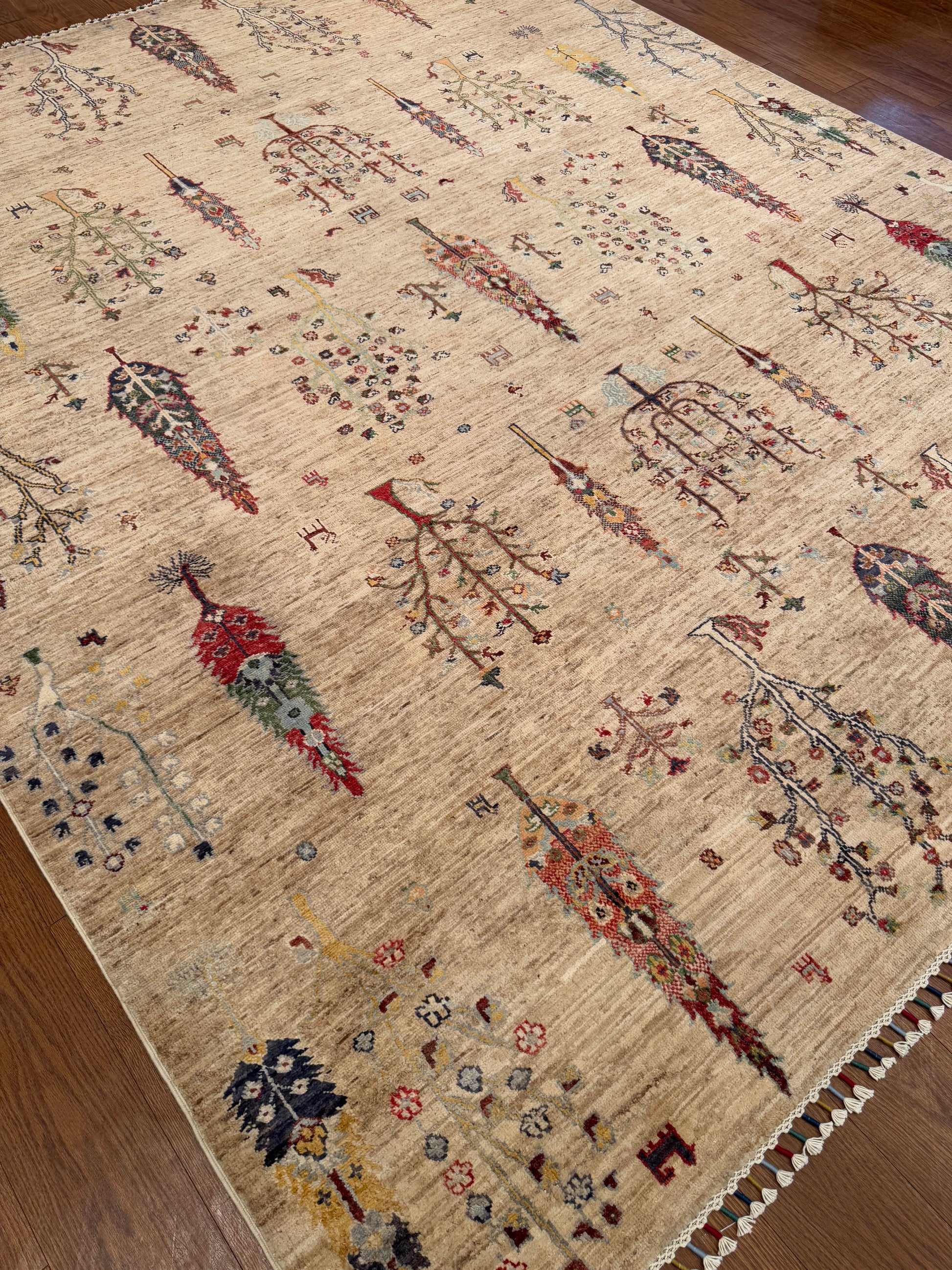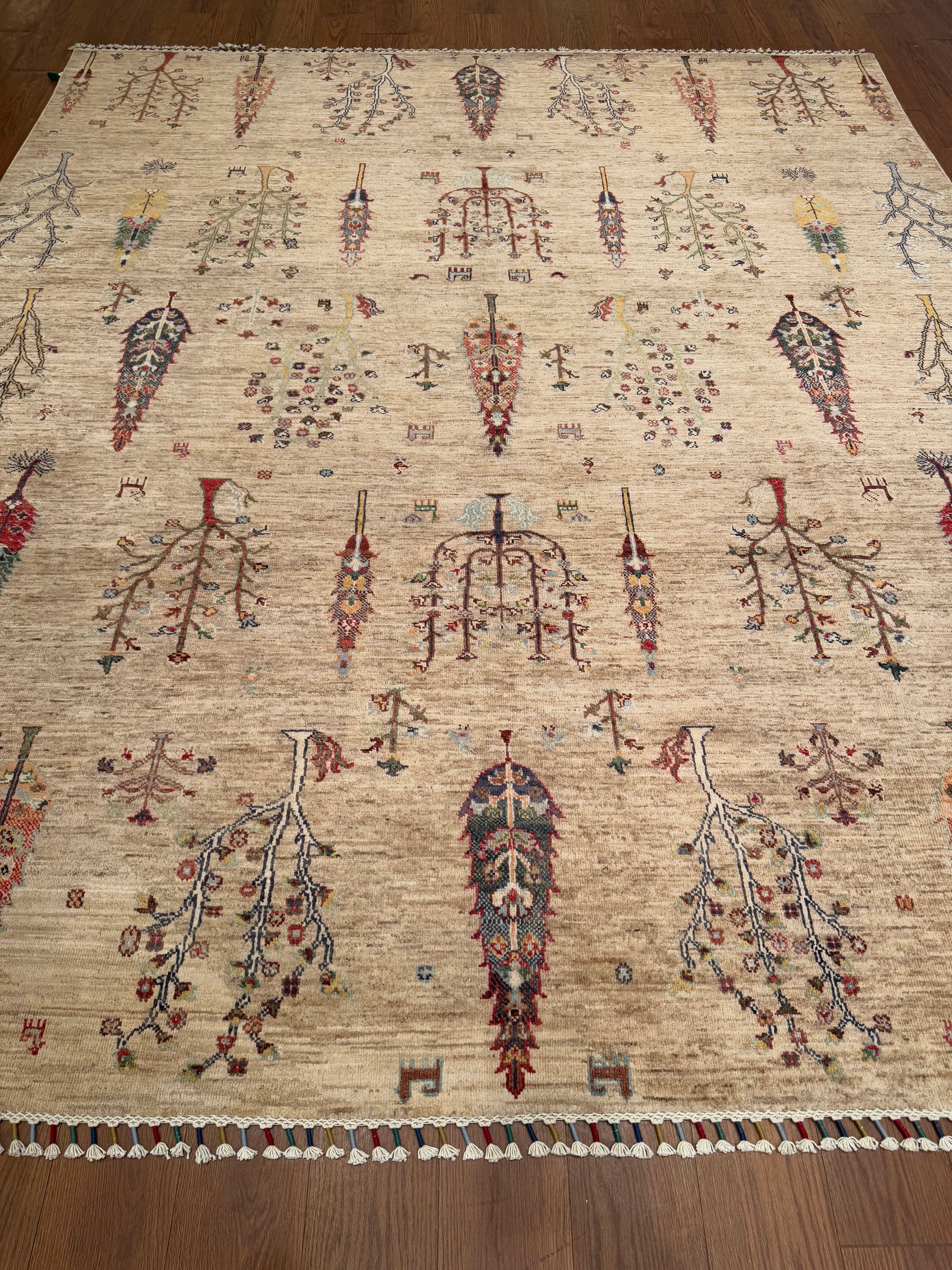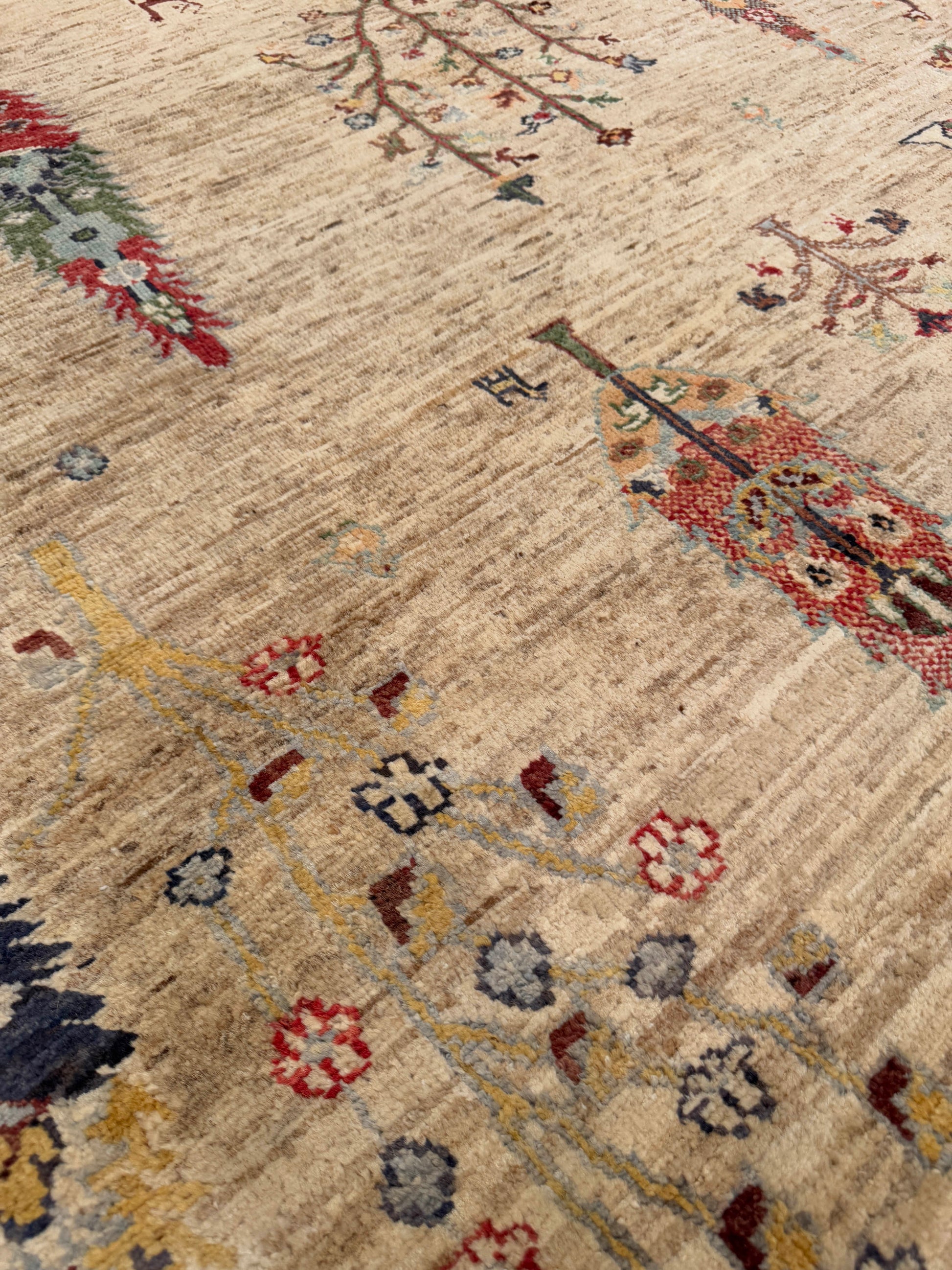This handwoven rug features an elegant arrangement of stylized botanical motifs set against a soft beige ground. The delicate, elongated forms resemble flowering branches and abstracted trees, each rendered in rich tones of red, blue, gold, and green. Its balanced layout and airy spacing give the rug a refined yet organic character, making it a versatile choice for both traditional and modern interiors.