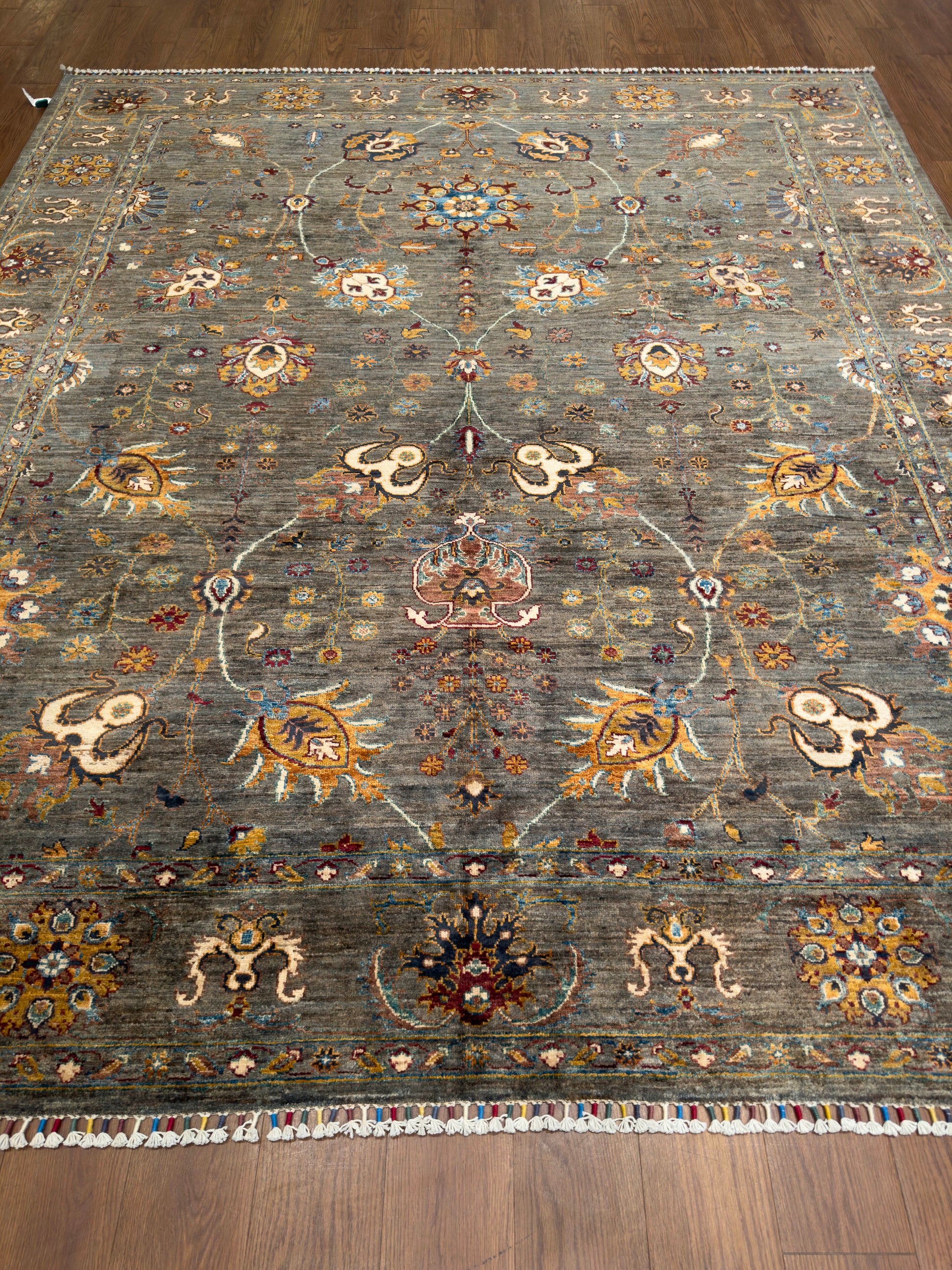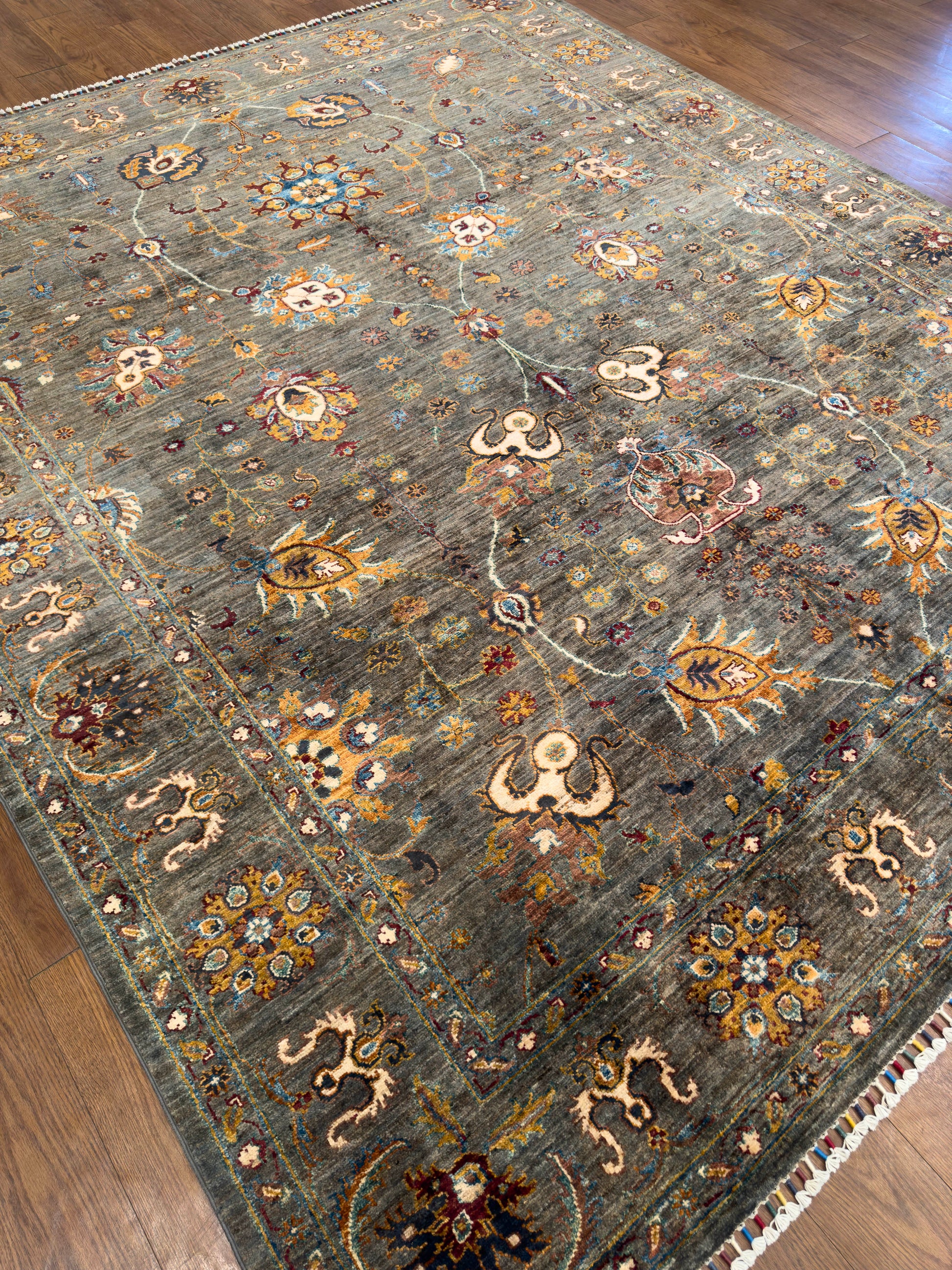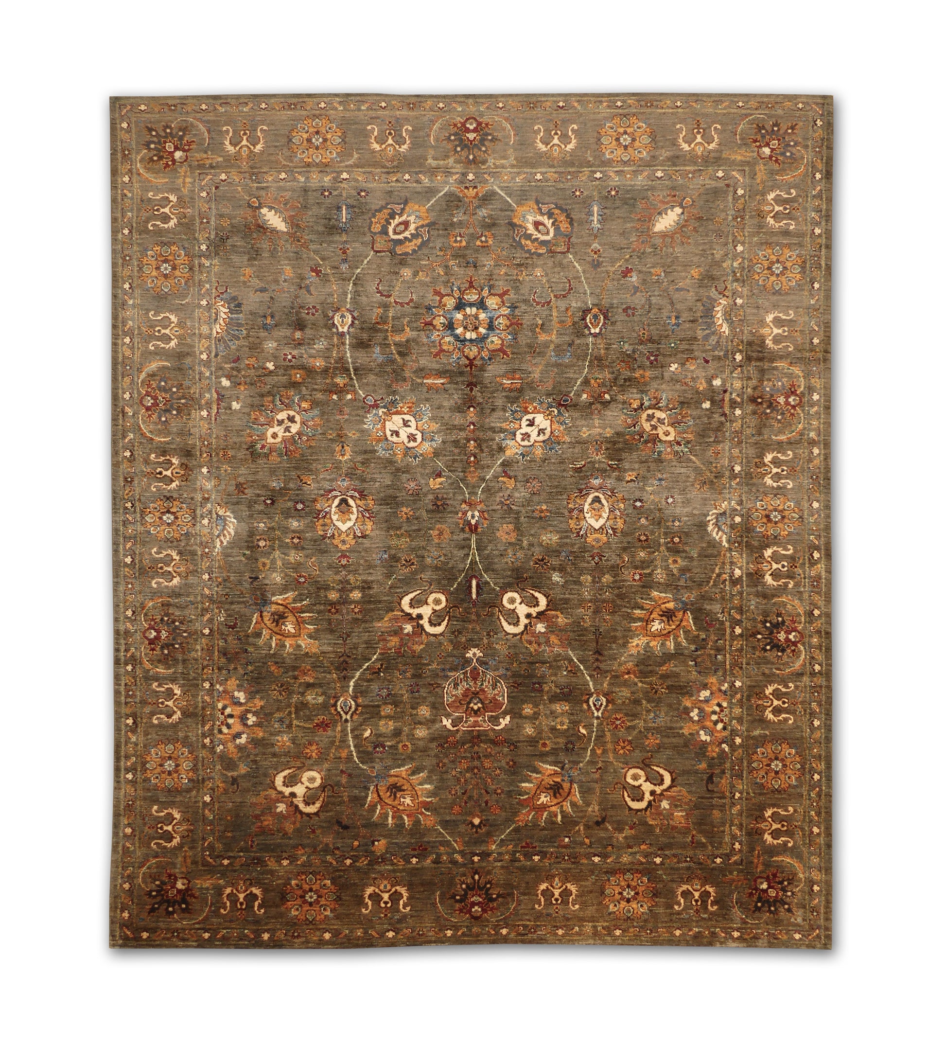 This elegant hand-knotted rug features a rich earthy field highlighted with flowing floral motifs in gold, ivory, and soft blue. Its detailed patterning and balanced symmetry create a refined look, while the subtle striations in the wool give depth and warmth. A timeless piece that blends traditional artistry with versatile sophistication.