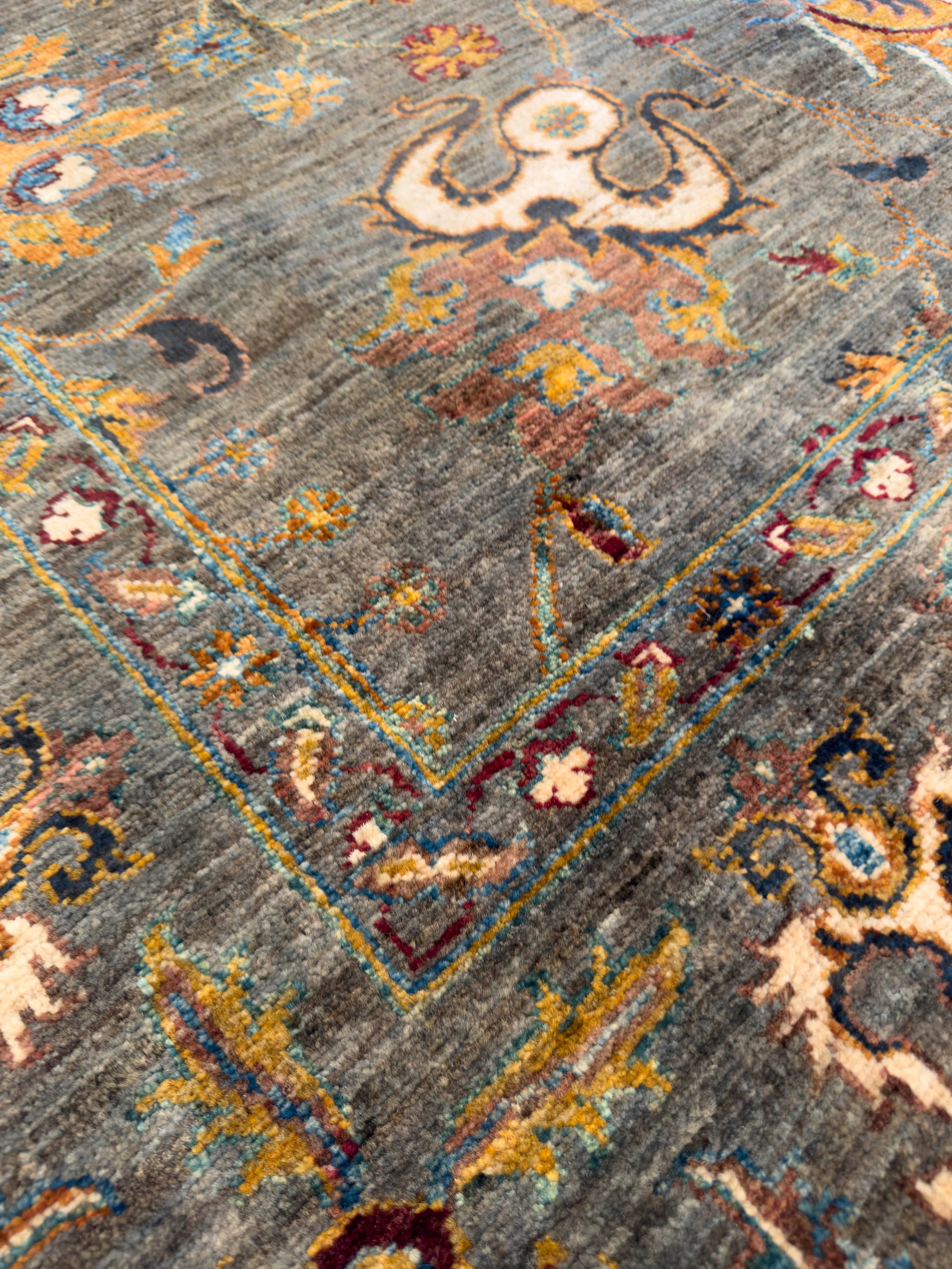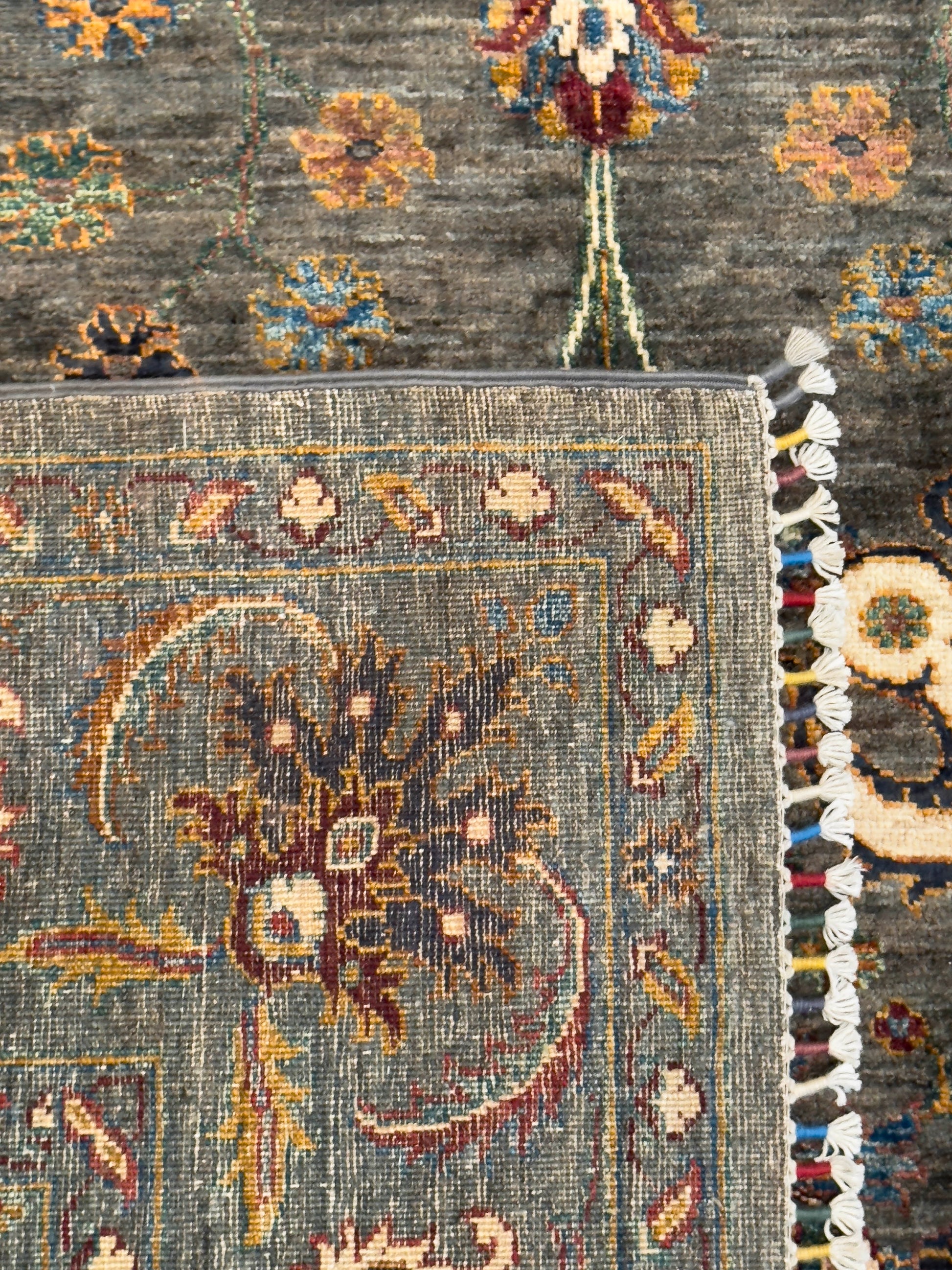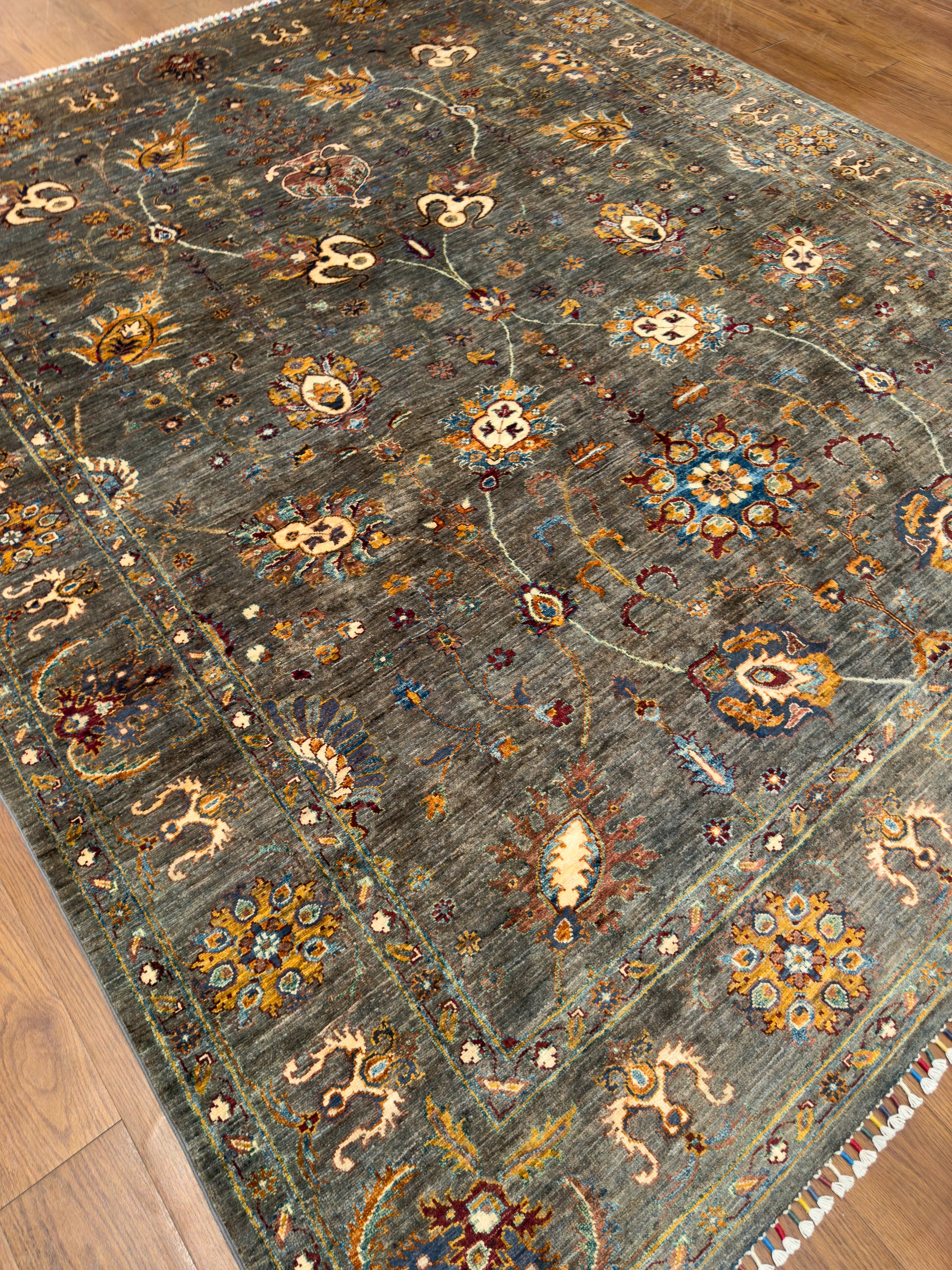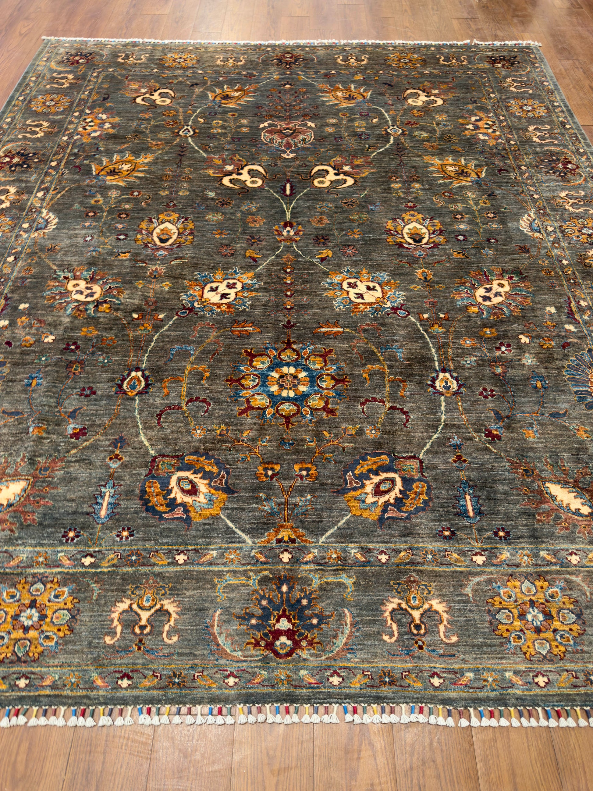 This elegant hand-knotted rug features a rich earthy field highlighted with flowing floral motifs in gold, ivory, and soft blue. Its detailed patterning and balanced symmetry create a refined look, while the subtle striations in the wool give depth and warmth. A timeless piece that blends traditional artistry with versatile sophistication.