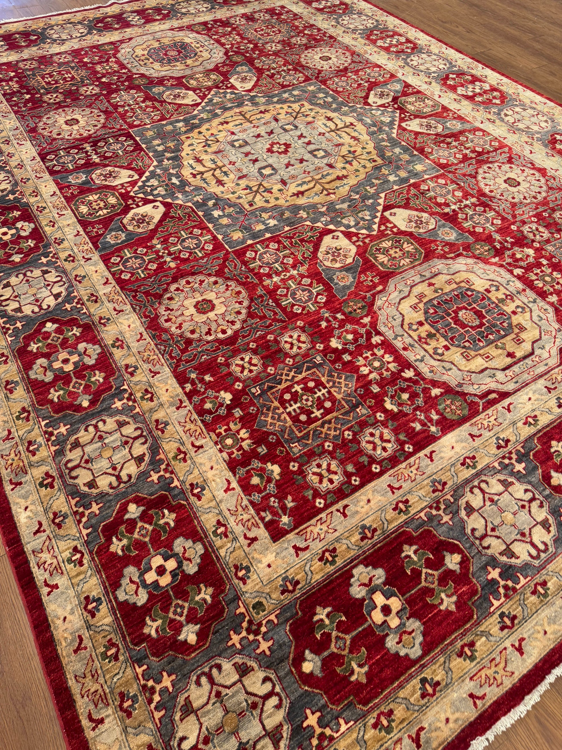 This bold handwoven rug is a striking showcase of geometric artistry, featuring a series of central medallions layered across a rich crimson red field. Golden yellow, slate gray, and ivory accents bring dimension and warmth, while finely detailed motifs fill the spaces with rhythmic balance. The decorative border frames the design with symmetry and elegance, tying the piece together in a timeless display. Its commanding presence and regal palette make it an ideal foundation for any grand interior.