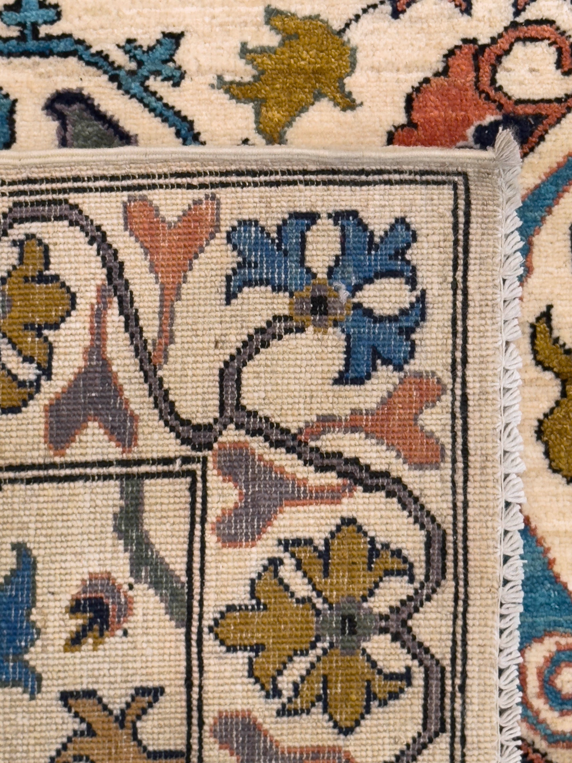 - Colors: Ivory ground with red, gold, teal, and olive accents