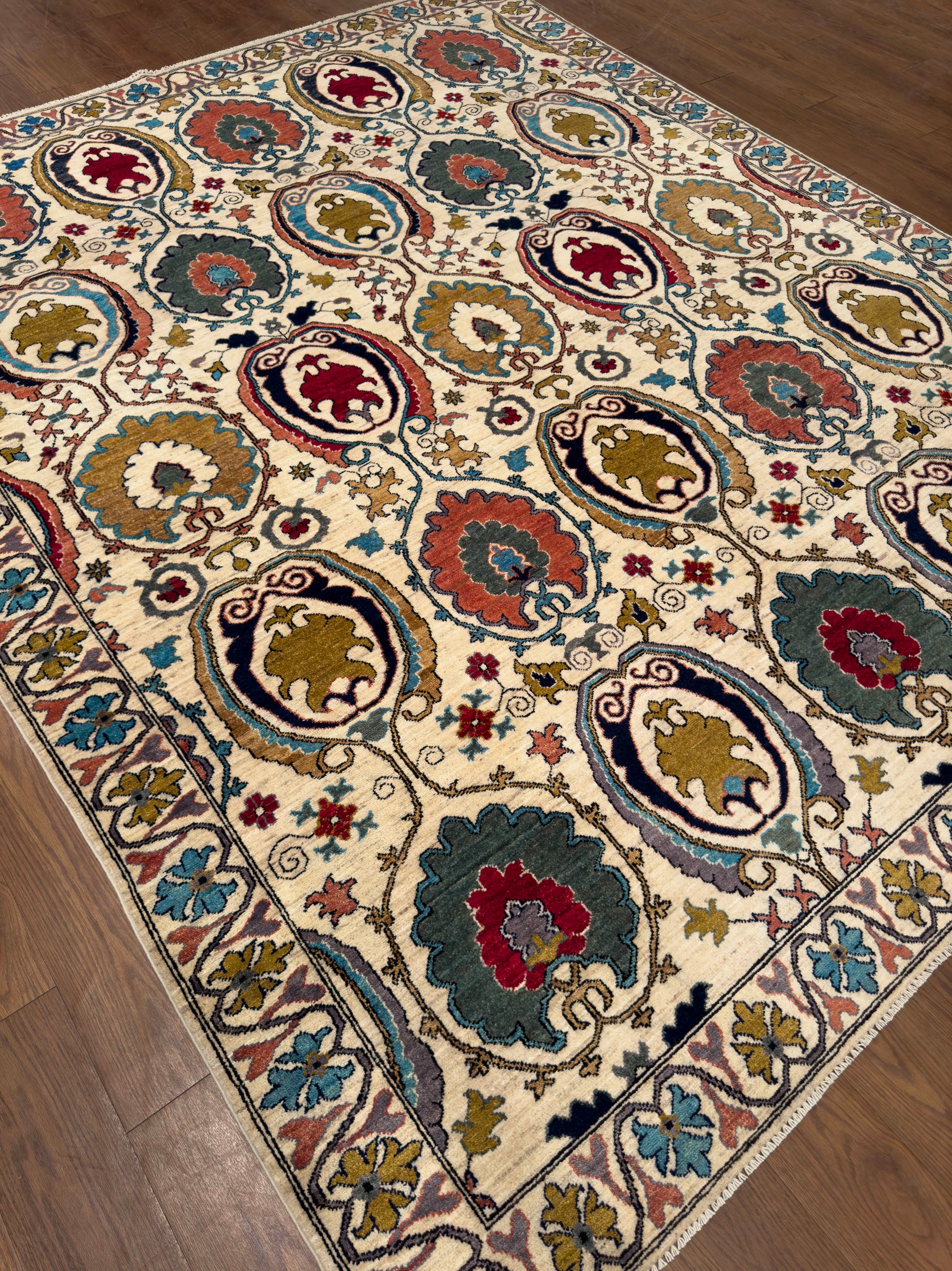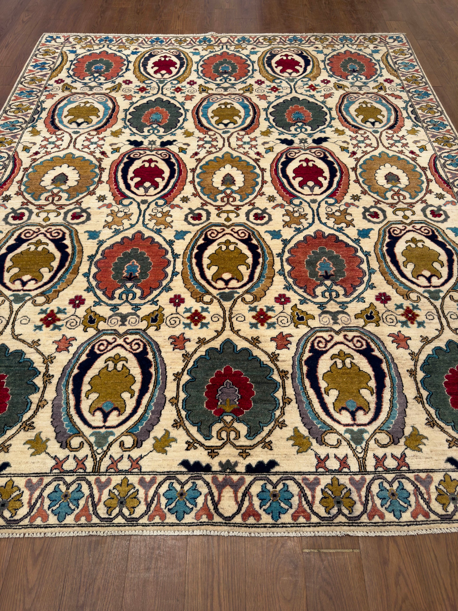 This vibrant handwoven rug features a repeating medallion pattern framed by intricate floral borders, creating a bold yet balanced design. The striking palette of red, gold, teal, and olive against a soft ivory ground brings both warmth and sophistication. Perfect for adding character and elegance, this piece is ideal for living rooms, dining spaces, or eclectic interiors.