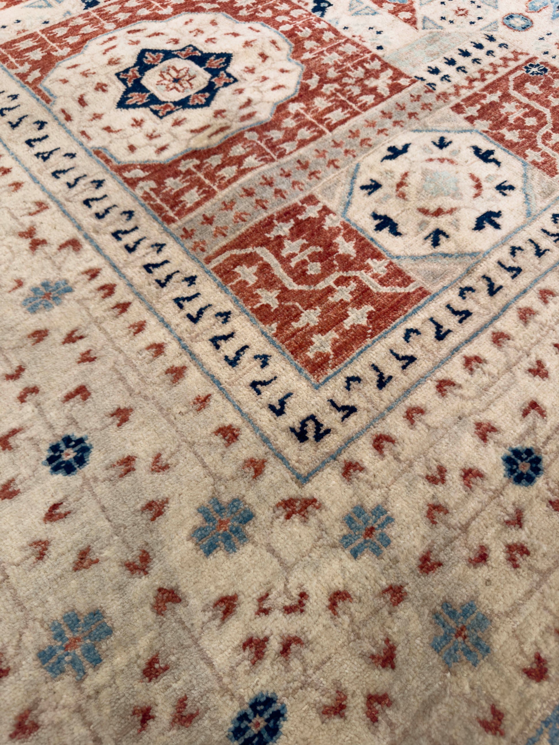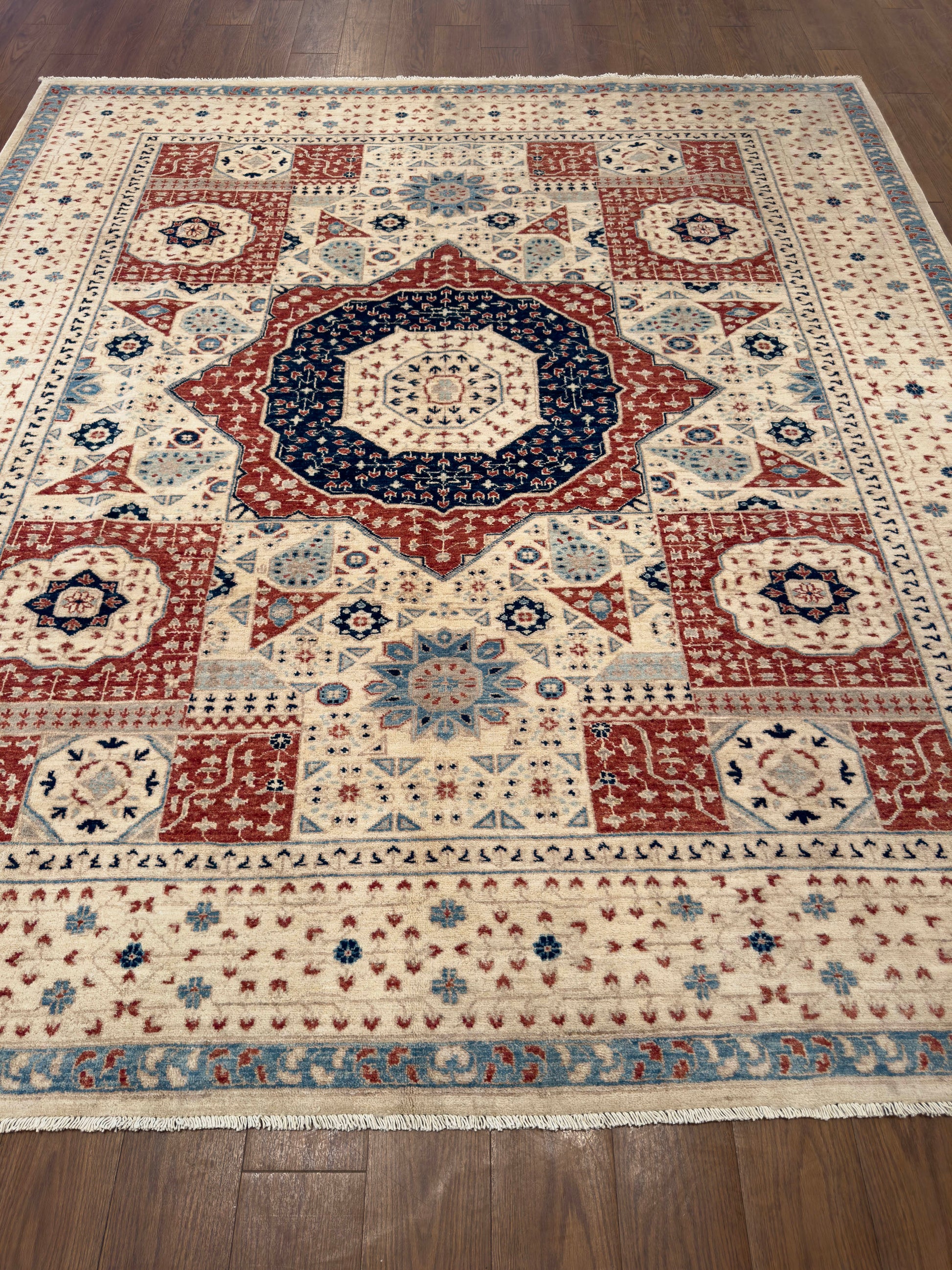 This exquisite rug features a bold central medallion surrounded by layered geometric motifs, creating a harmonious and detailed layout. The palette of deep navy, terracotta, and soft ivory blends beautifully, giving the piece both vibrancy and balance. Its intricate design makes it an eye-catching centerpiece, perfect for traditional or eclectic interiors.