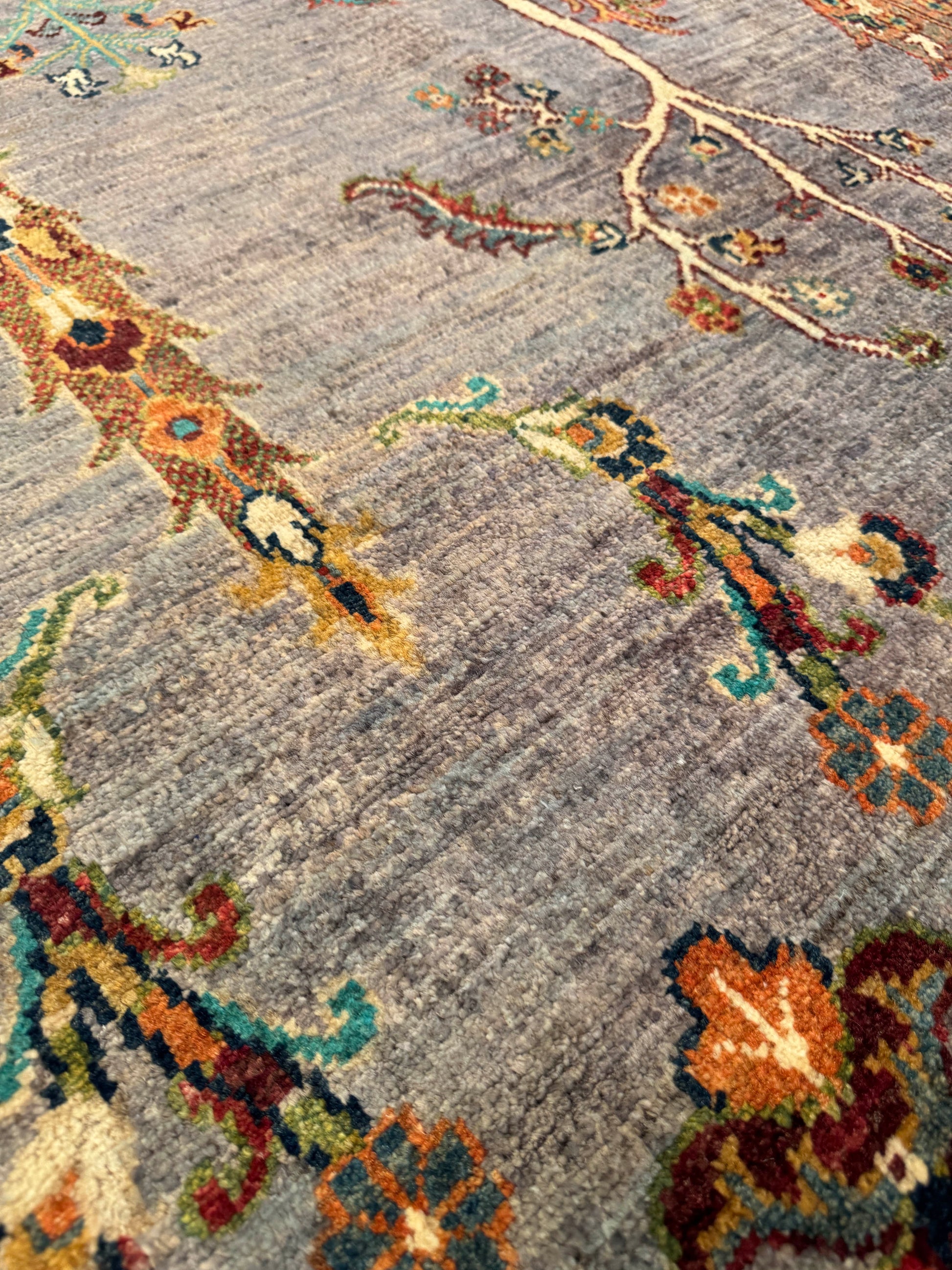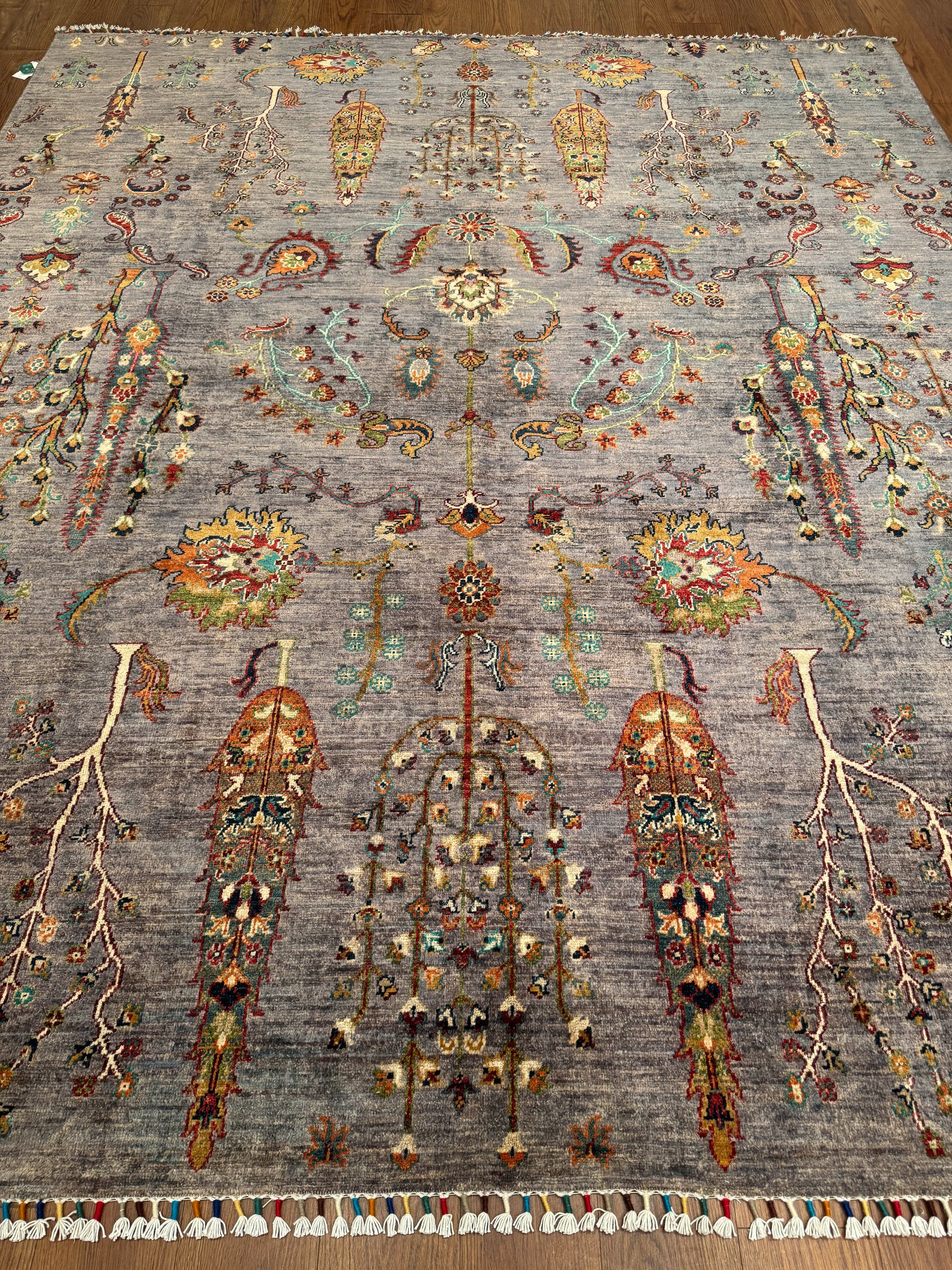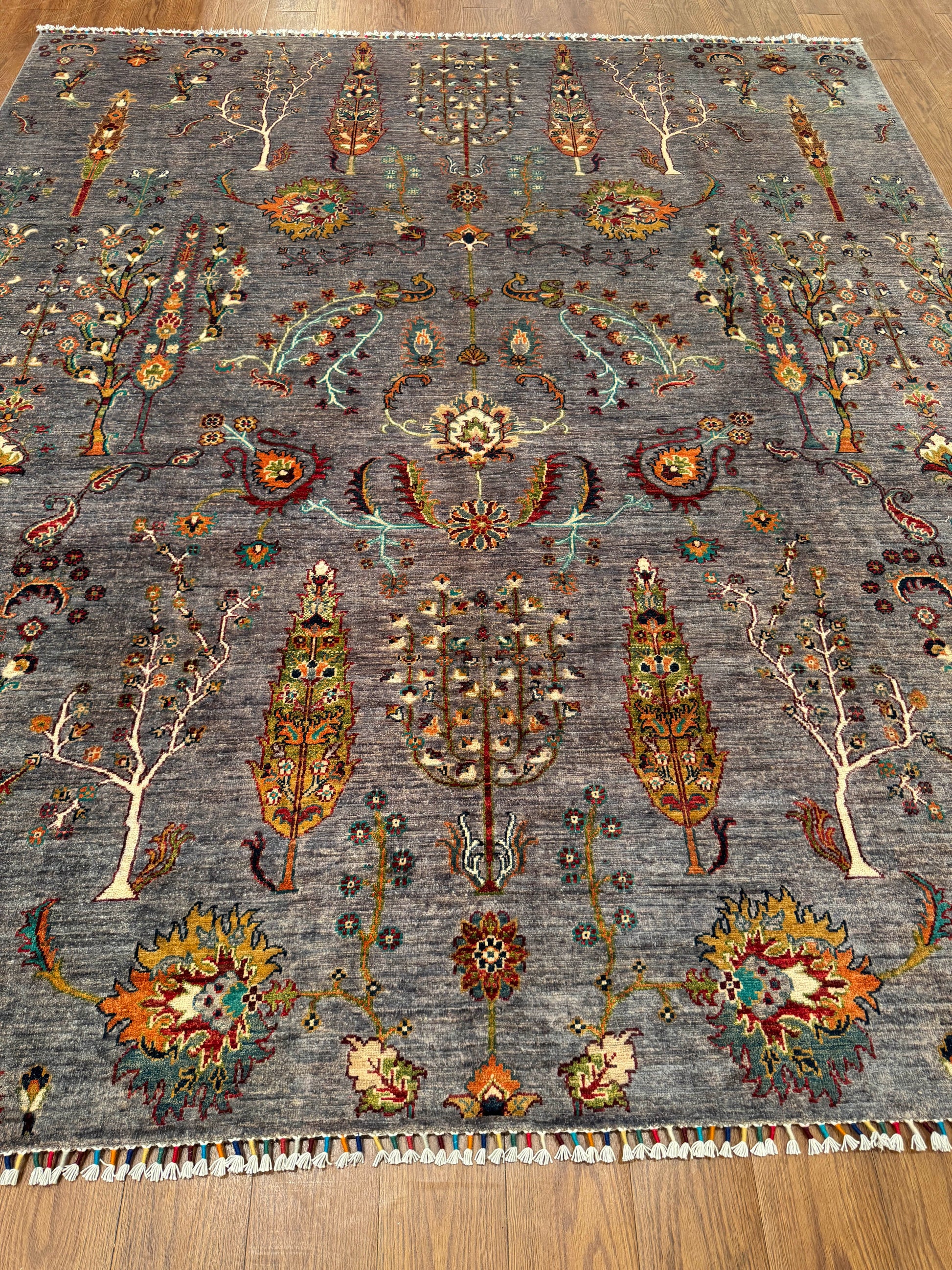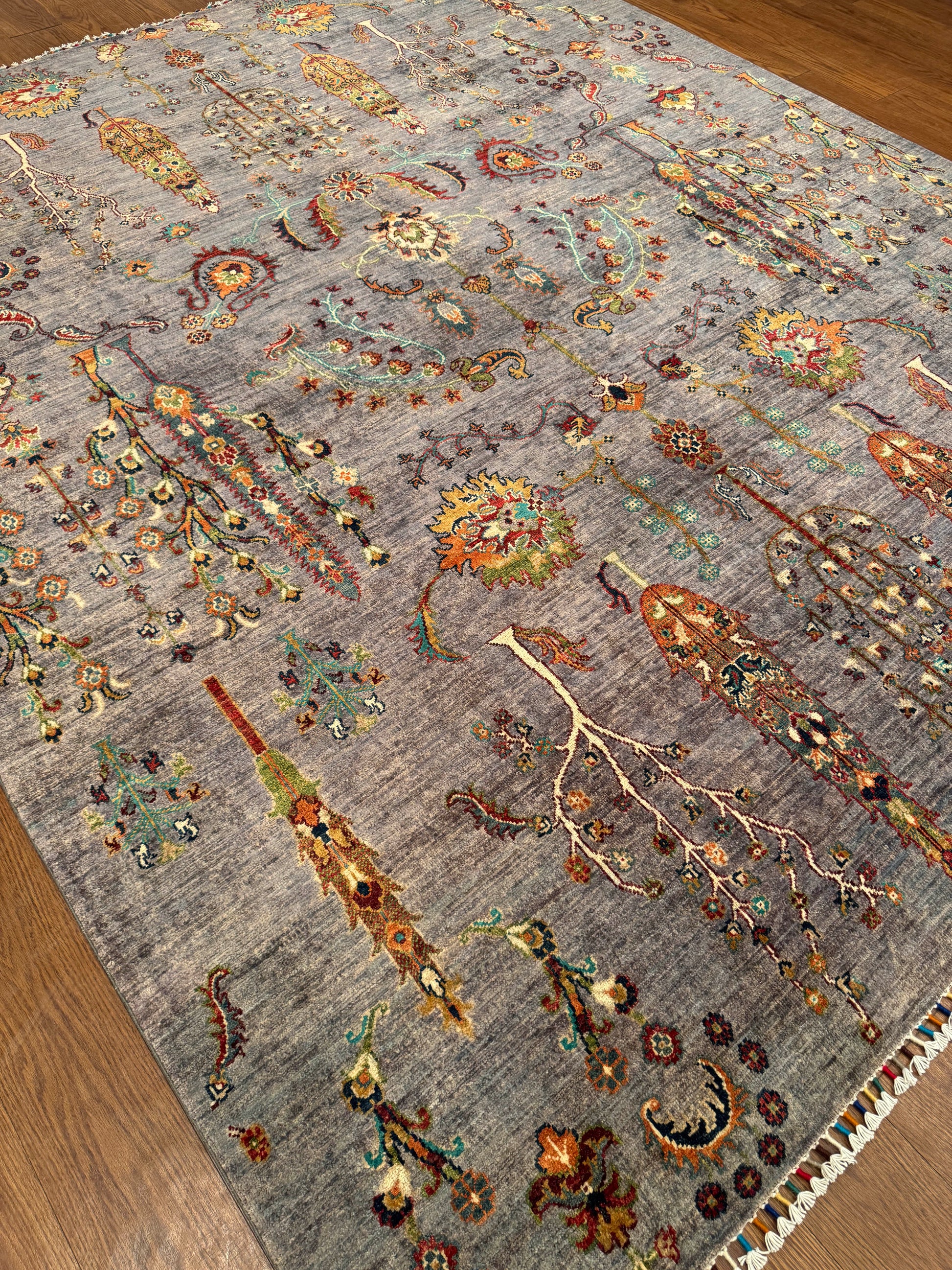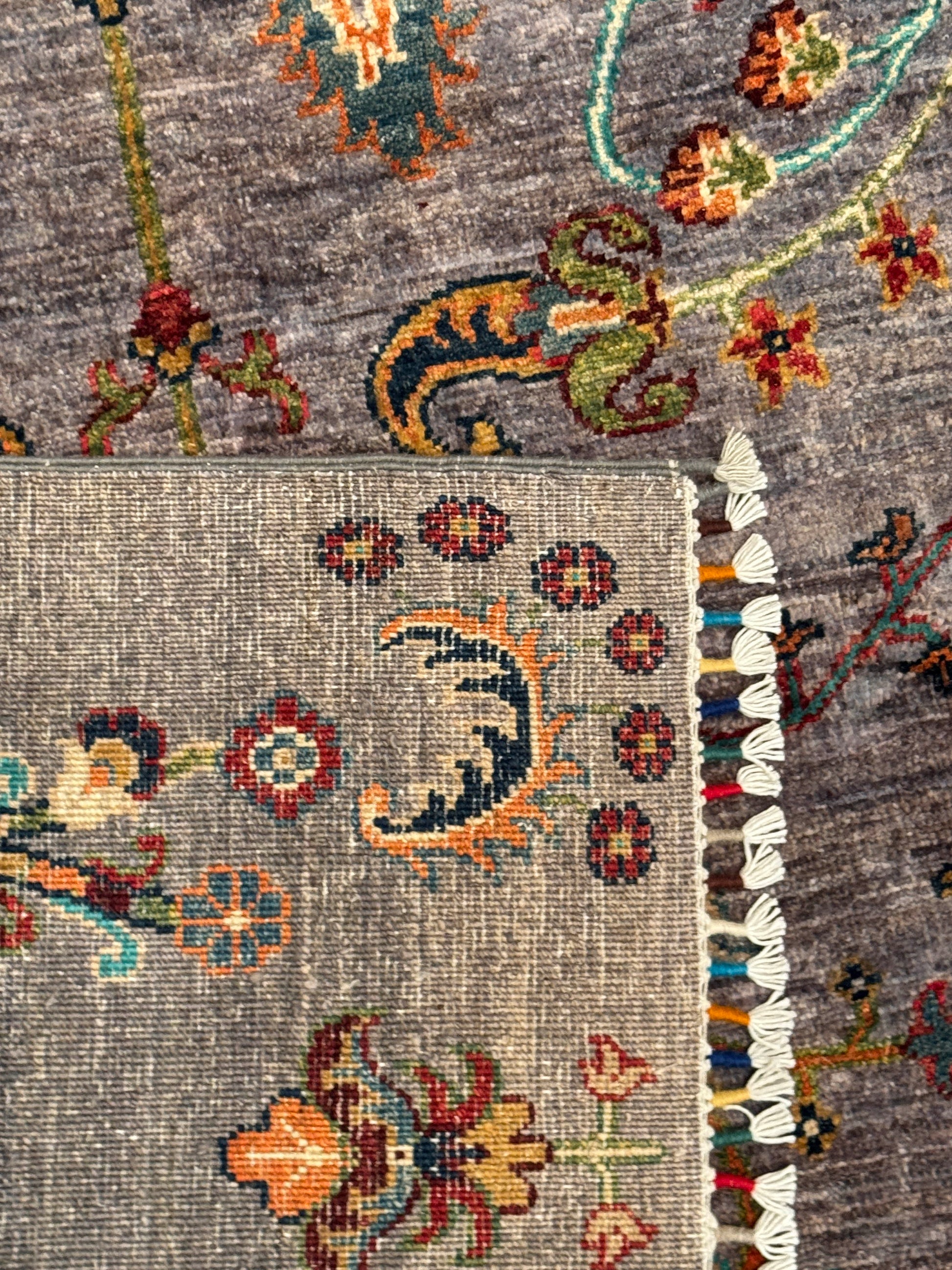 This exquisite handwoven rug features an elegant arrangement of stylized botanical motifs set against a deep charcoal-gray field. The vivid accents of gold, crimson, teal, and ivory bring a striking contrast, creating a design that feels both timeless and full of life. Its balance of earthy tones with colorful highlights makes it a versatile centerpiece for a range of interiors.