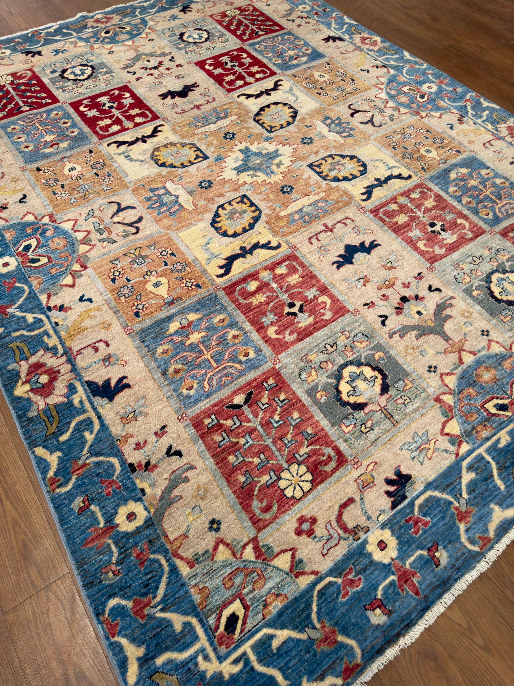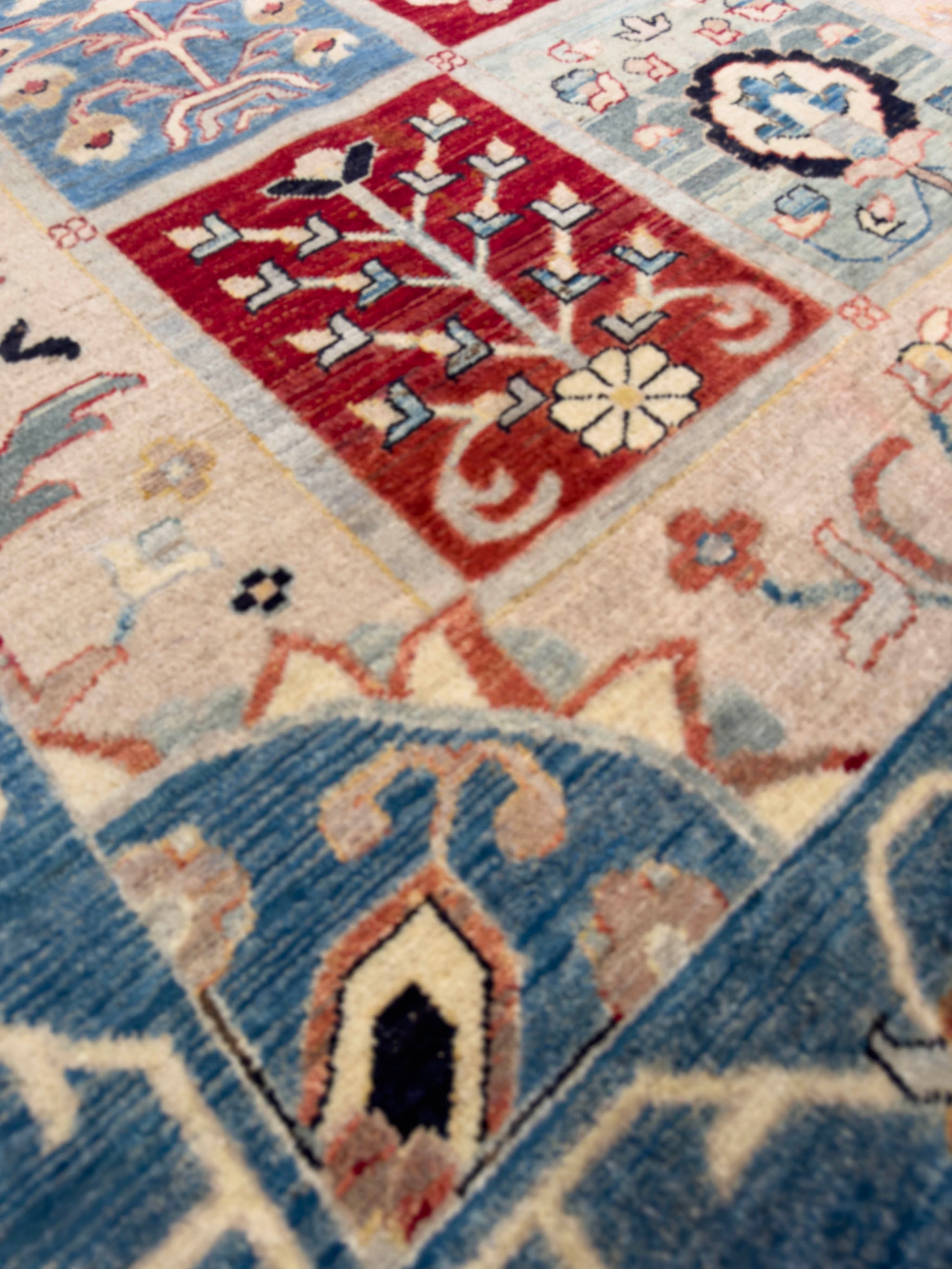 This handwoven rug features a charming panel design, where each square is filled with stylized florals, trees, and geometric motifs. The interplay of soft beige and ivory tones with vibrant red, navy, and sky blue creates a lively yet balanced look. Its patchwork-inspired pattern makes it a versatile centerpiece, adding character and warmth to any interior.
