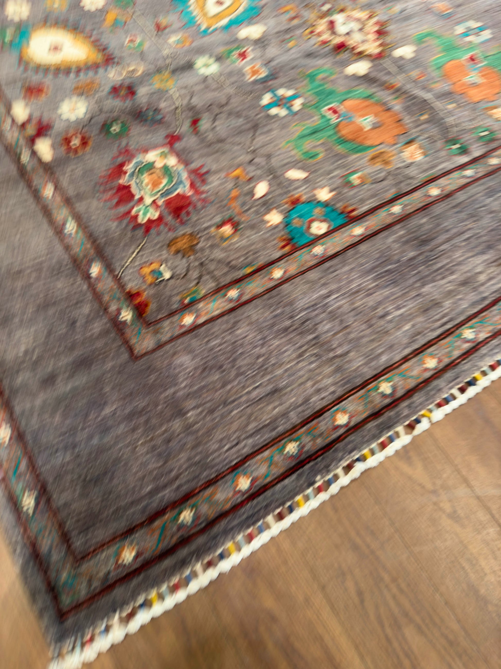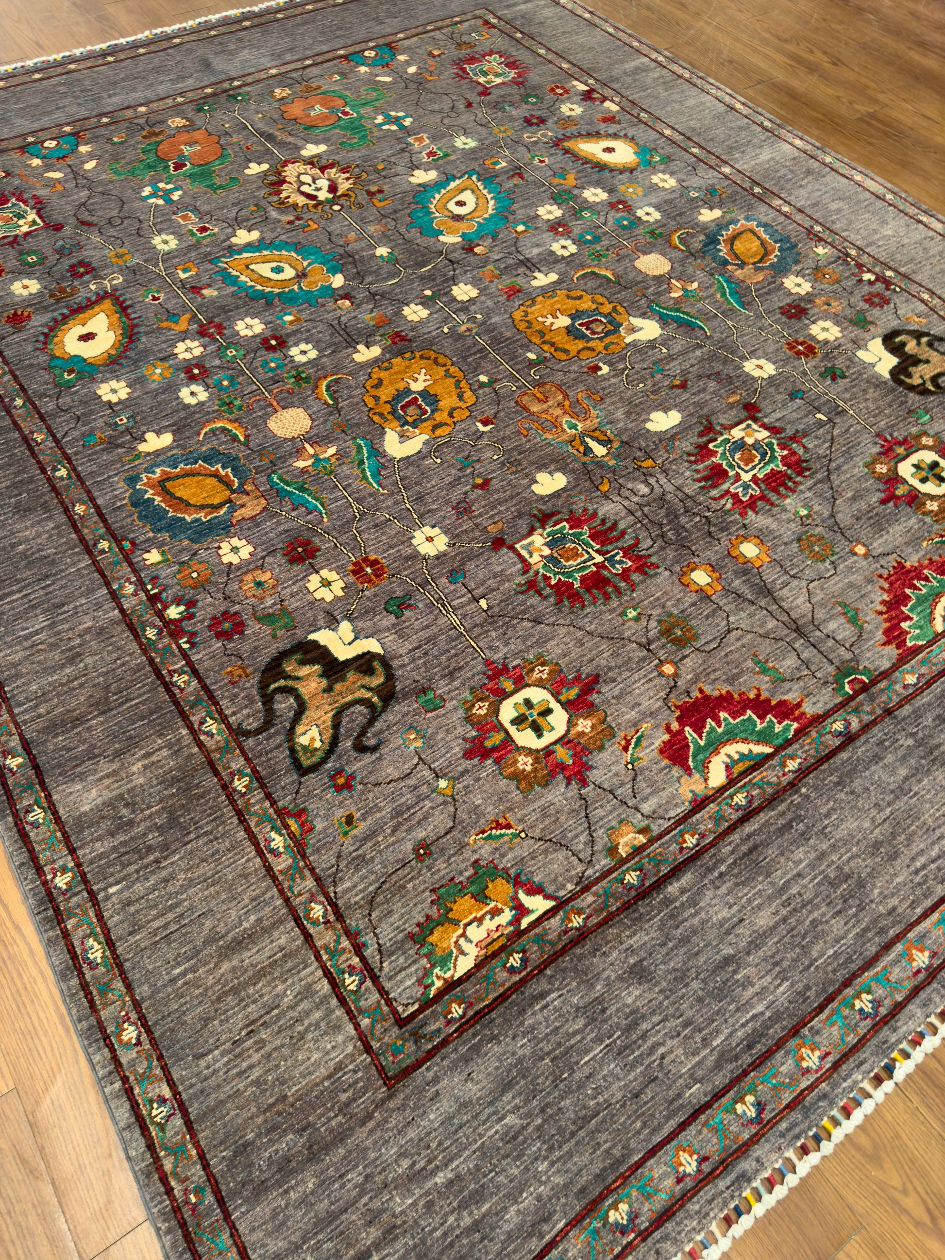 This handwoven rug features a rich gray field adorned with bold, stylized floral motifs in turquoise, gold, and deep red. The balanced symmetry and playful pops of color bring both elegance and vibrancy to its design, while the fine wool texture adds warmth and durability. A versatile piece that bridges traditional charm with modern sophistication.