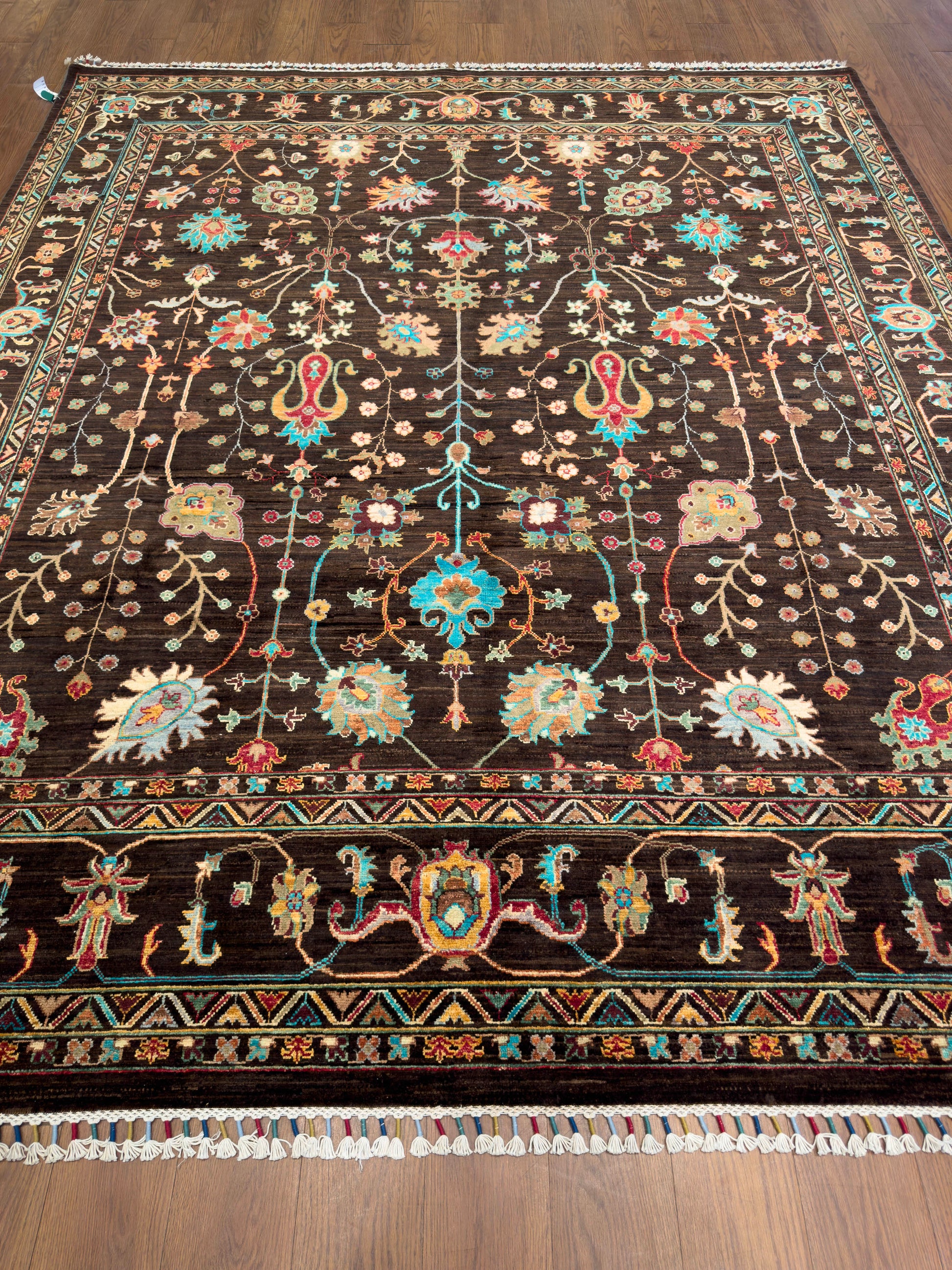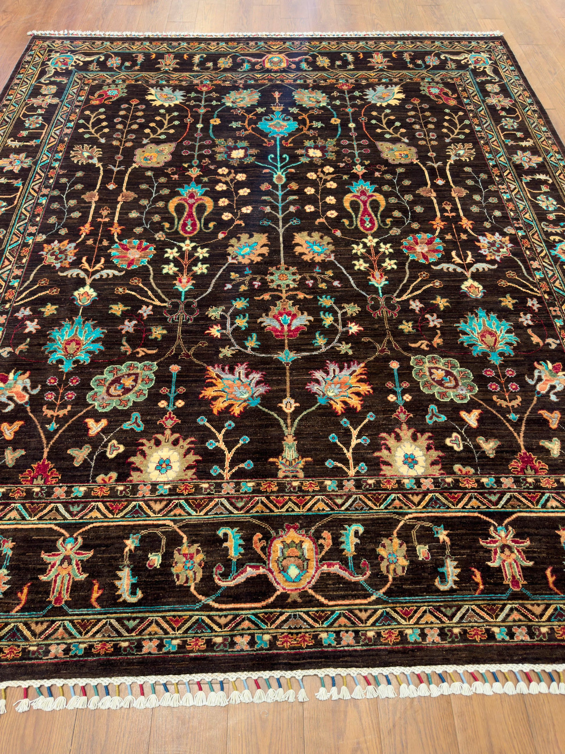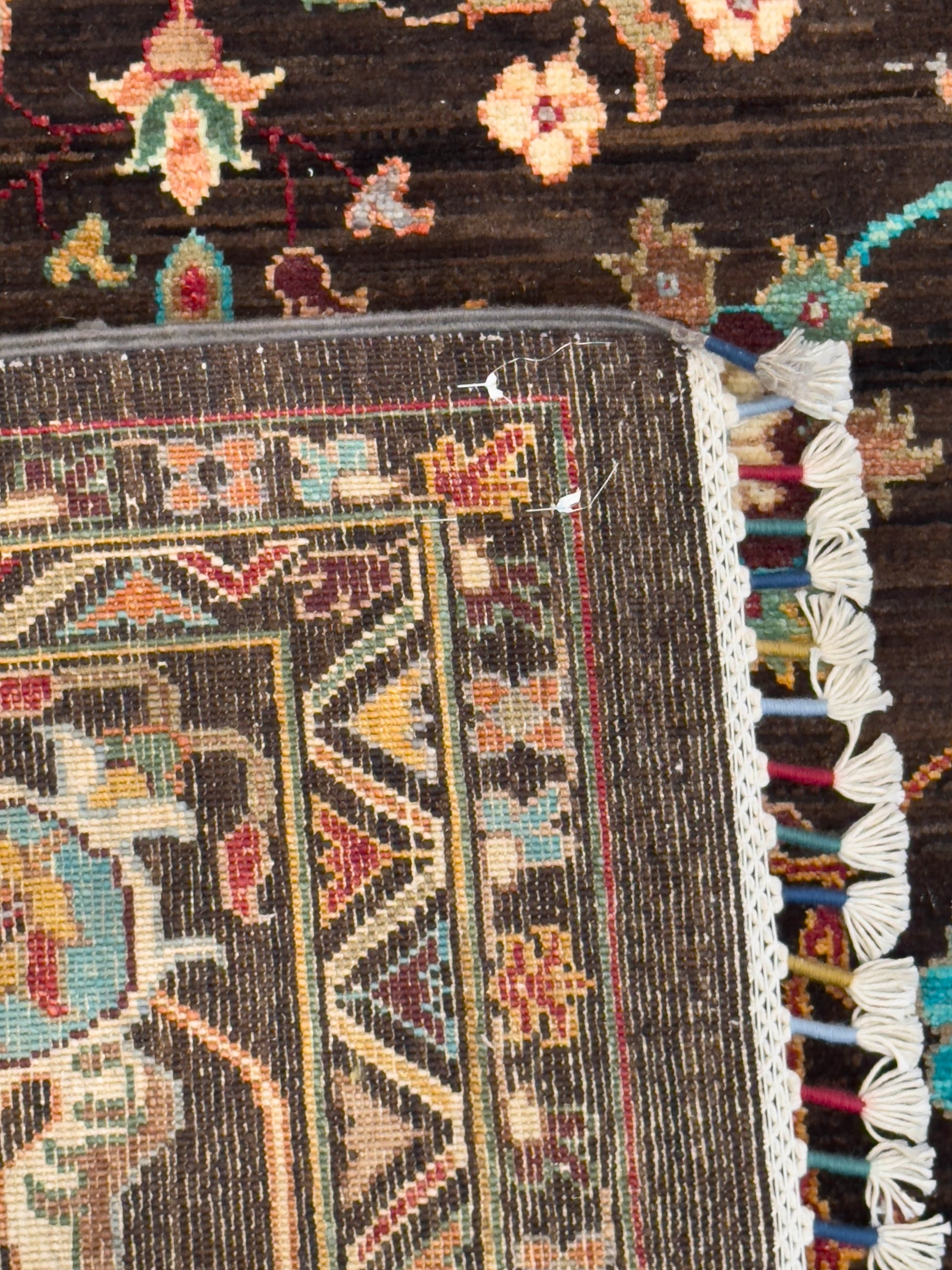 This handwoven rug features a dramatic dark chocolate field brought to life with colorful floral and vine motifs. Delicate blossoms in turquoise, ivory, and coral create a vibrant contrast, while the intricate border frames the design with elegance. Its bold yet graceful aesthetic makes it perfect for adding warmth and sophistication to any interior.