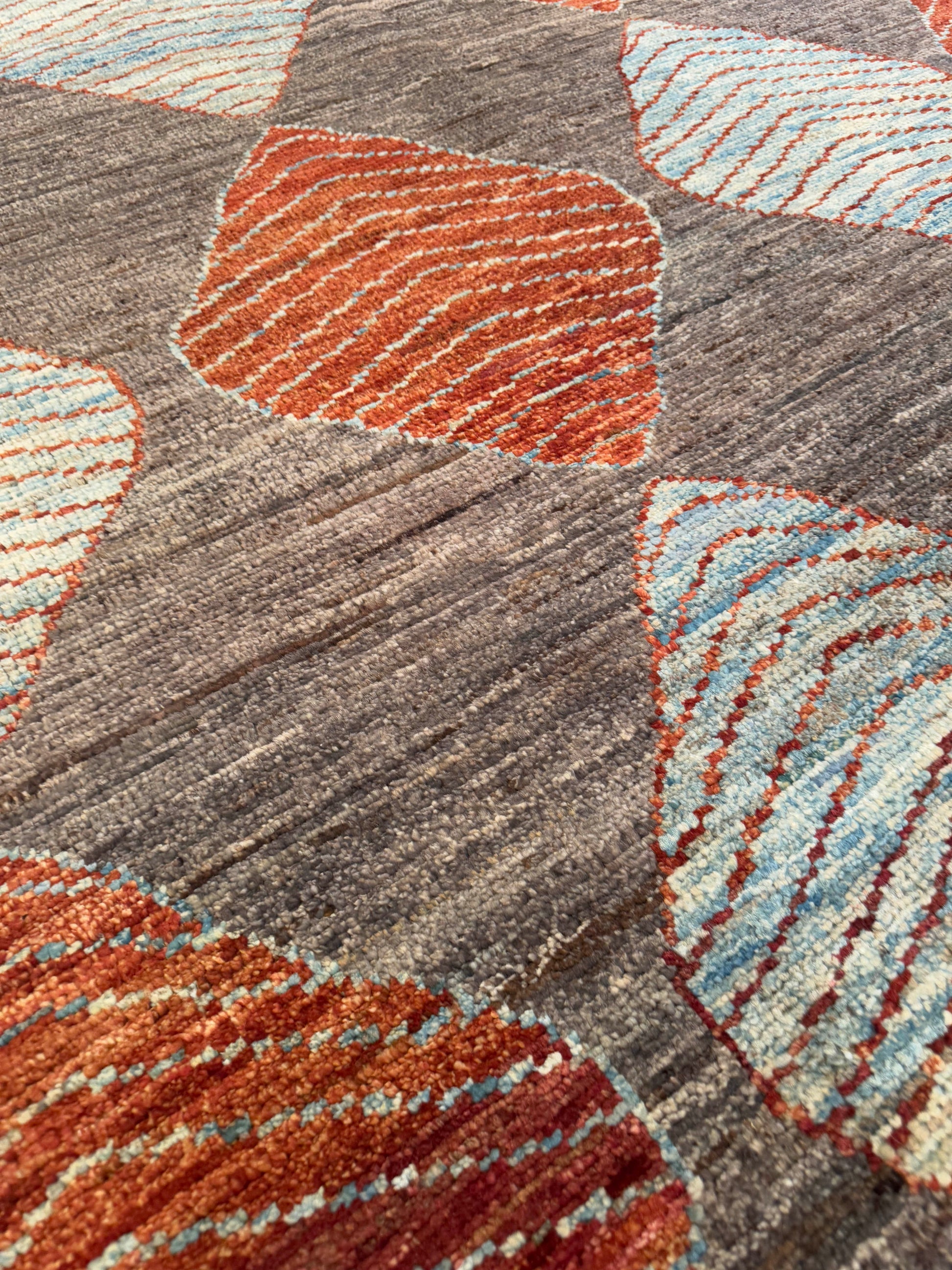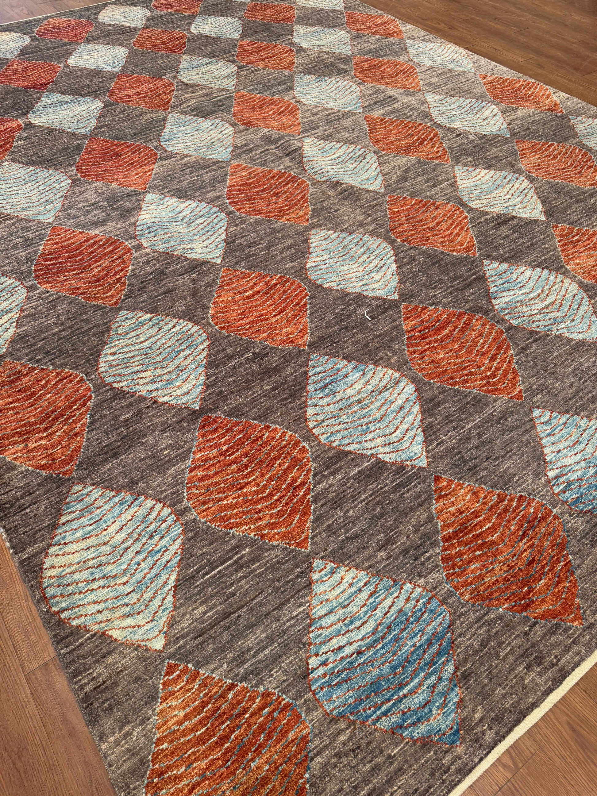 This contemporary handwoven rug features a repeating diamond lattice design, each diamond filled with wavy, layered striations that create a sense of movement and texture. The bold contrast of fiery orange, sky blue, and teal diamonds against a deep brown ground makes for a striking modern aesthetic. Its rhythmic geometry brings energy and dimension to any interior.