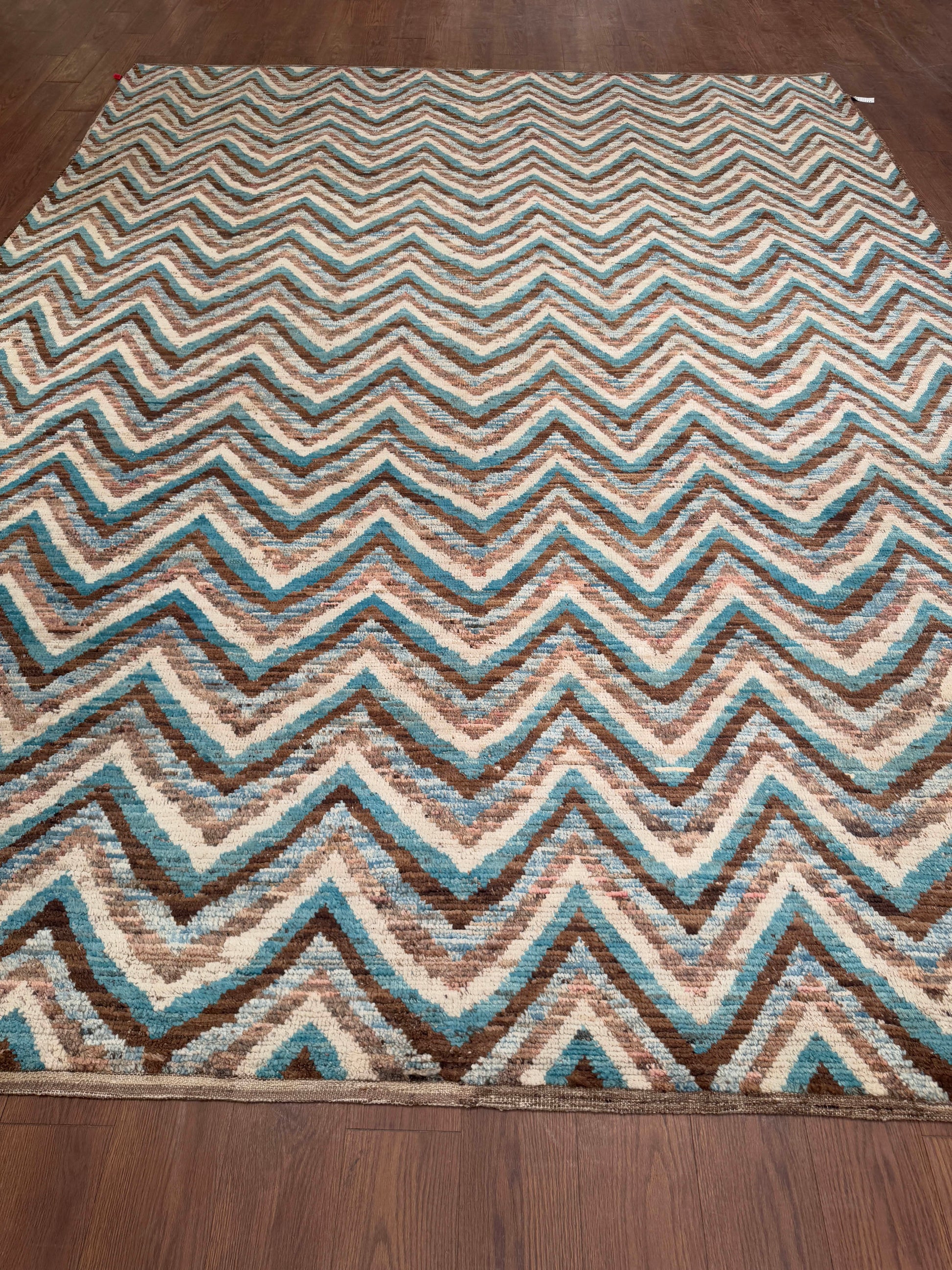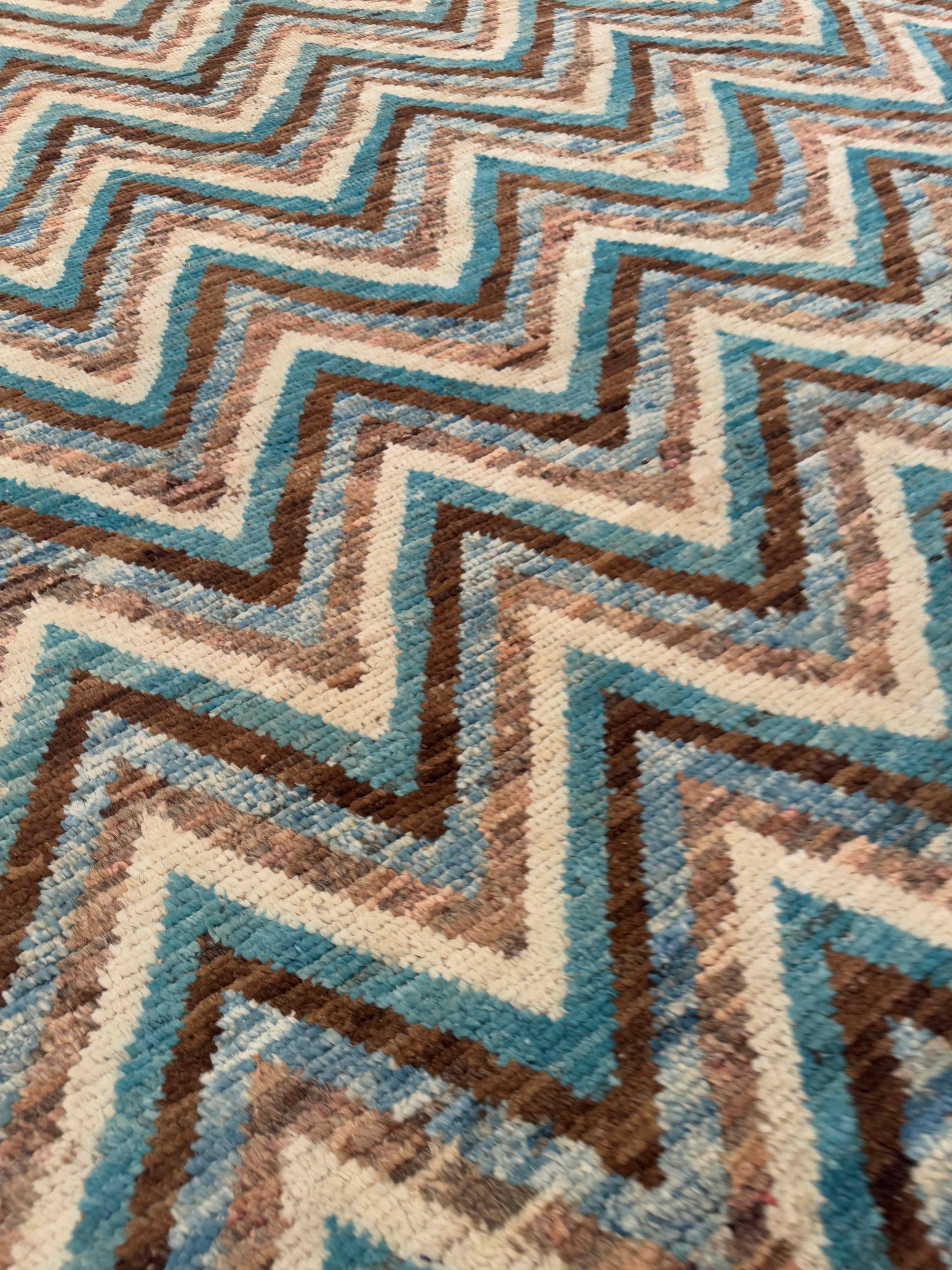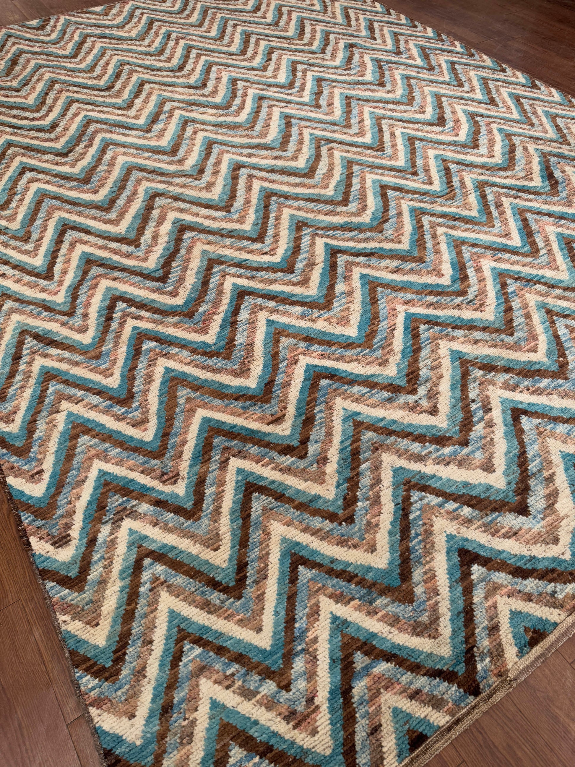 This bold handwoven rug showcases a dynamic chevron pattern that runs seamlessly across the field, creating movement and rhythm. The interplay of earthy browns, ivory, teal, and soft burgundy tones adds depth while maintaining a grounded, natural feel. Its striking zigzag design brings a touch of modern energy balanced with artisanal warmth.