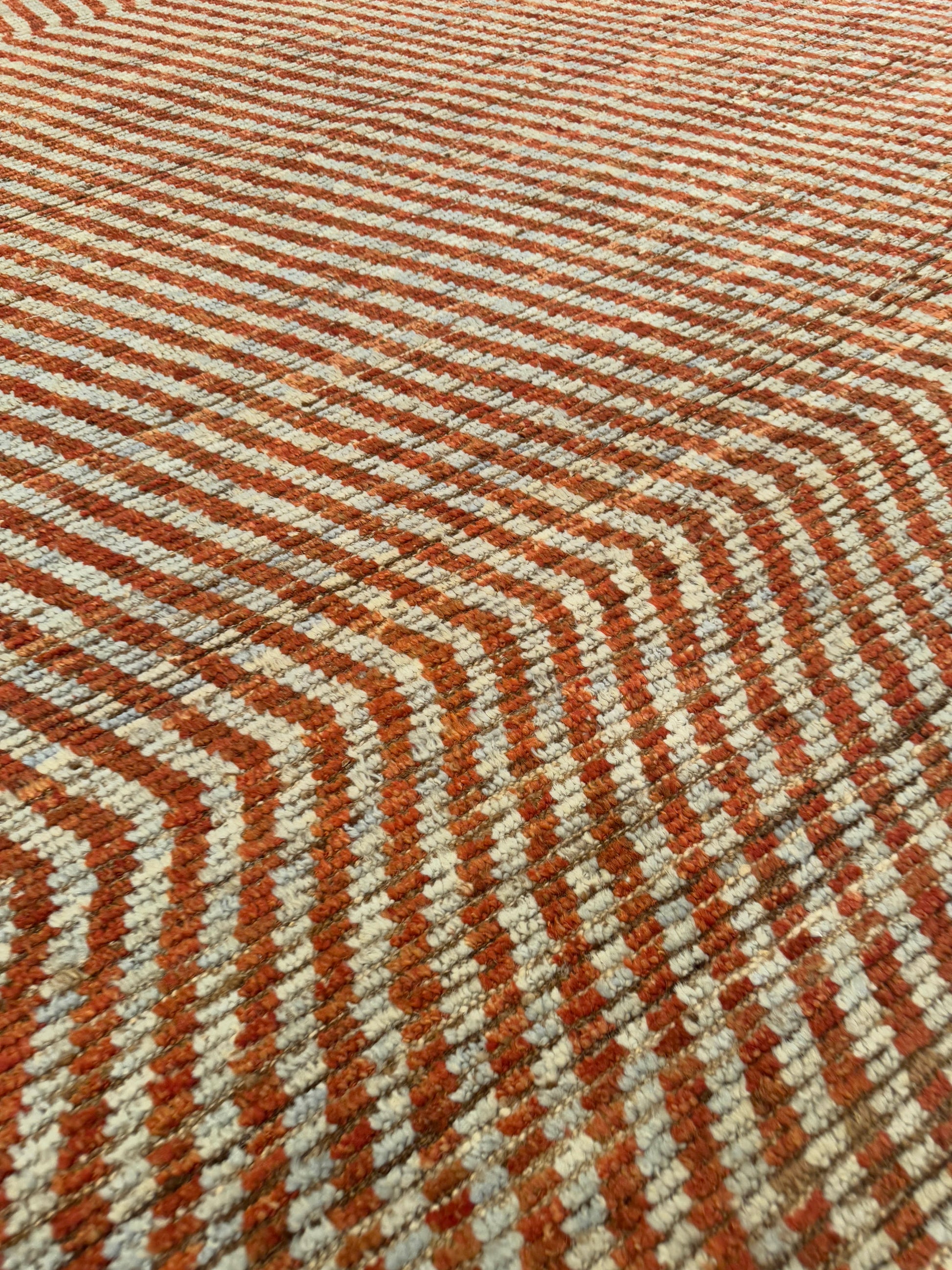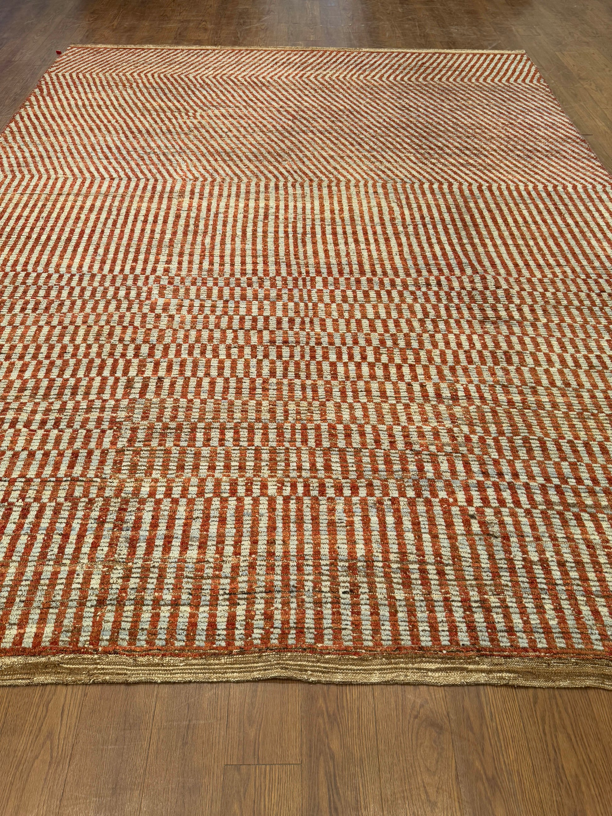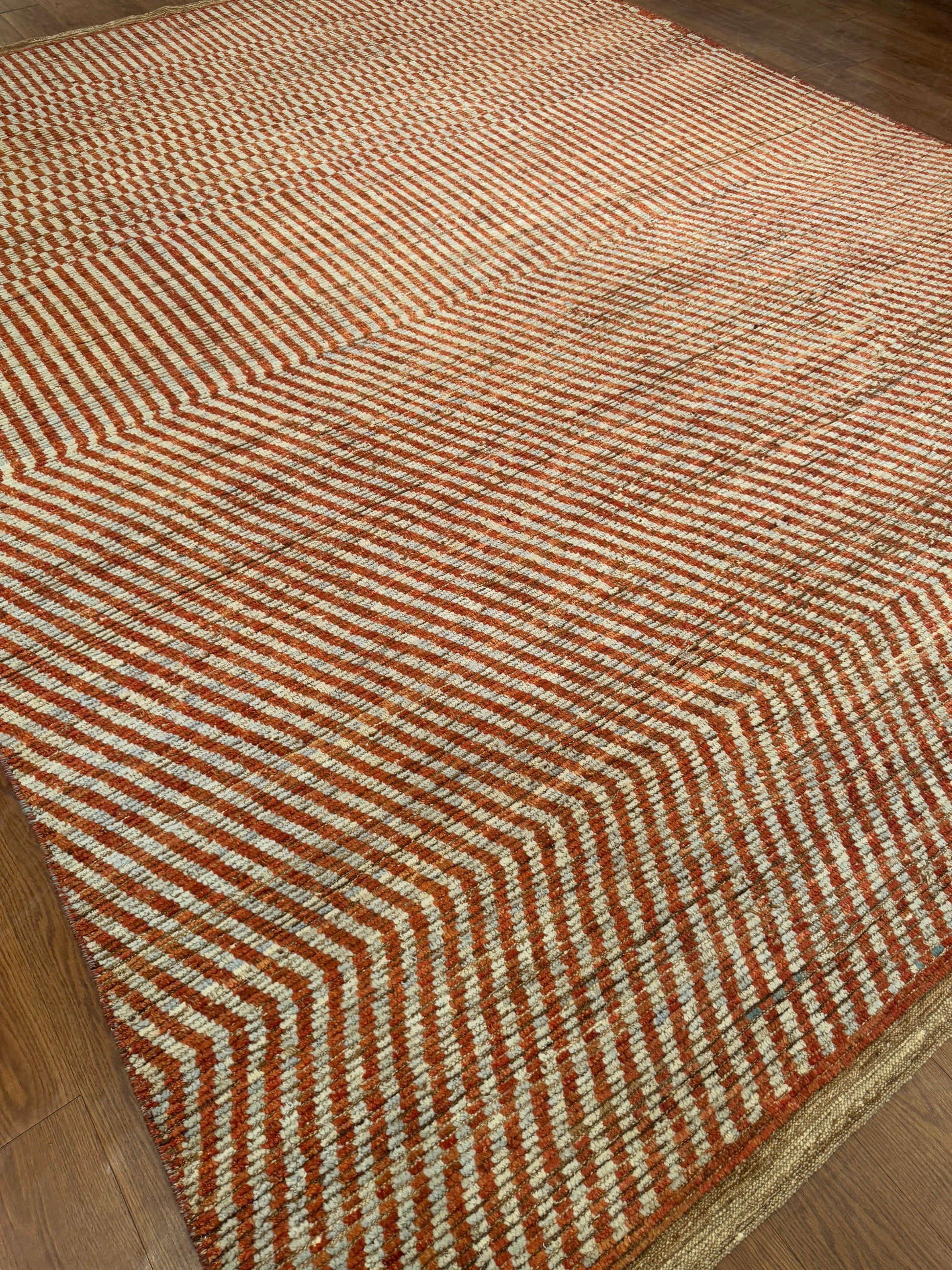 This unique handwoven rug features a striking geometric field where parallel stripes shift into chevron formations, creating a bold sense of movement and contrast. The interplay of terracotta red and ivory tones gives it both warmth and vibrancy, while the woven texture adds artisanal depth. Its modern yet timeless pattern makes it a versatile statement for contemporary spaces.