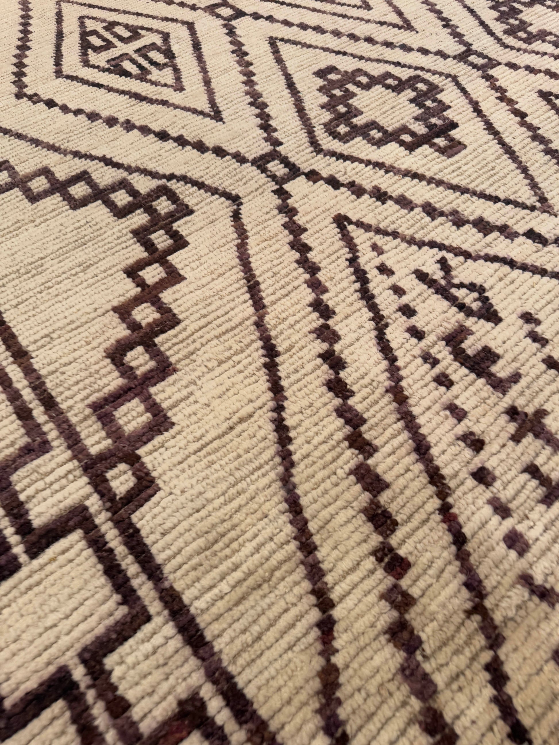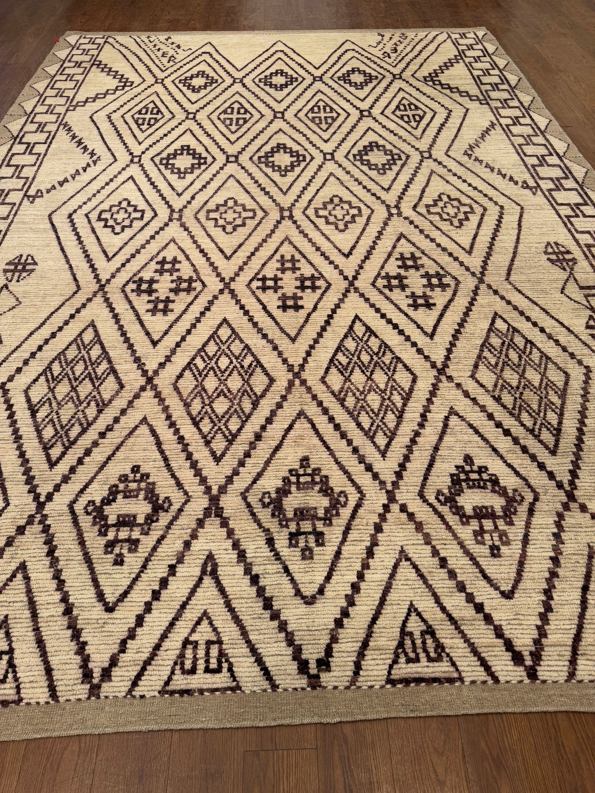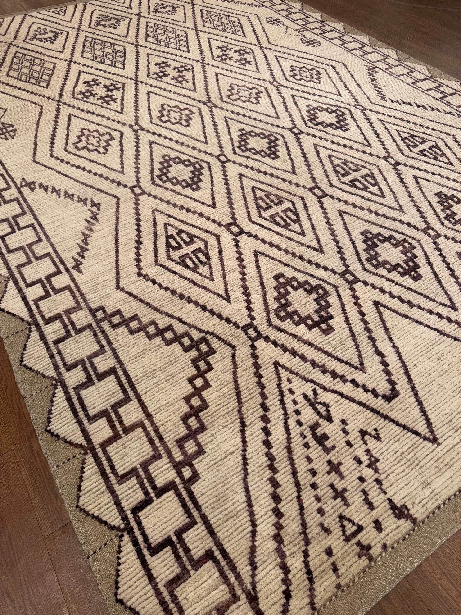 This handwoven rug presents a bold tribal-inspired design with a diamond lattice field filled with geometric and symbolic motifs. The deep brown pattern sits against a natural ivory ground, creating strong contrast and a sense of rhythm across the surface. Its rustic yet sophisticated character makes it a versatile addition for interiors seeking warmth and authenticity.