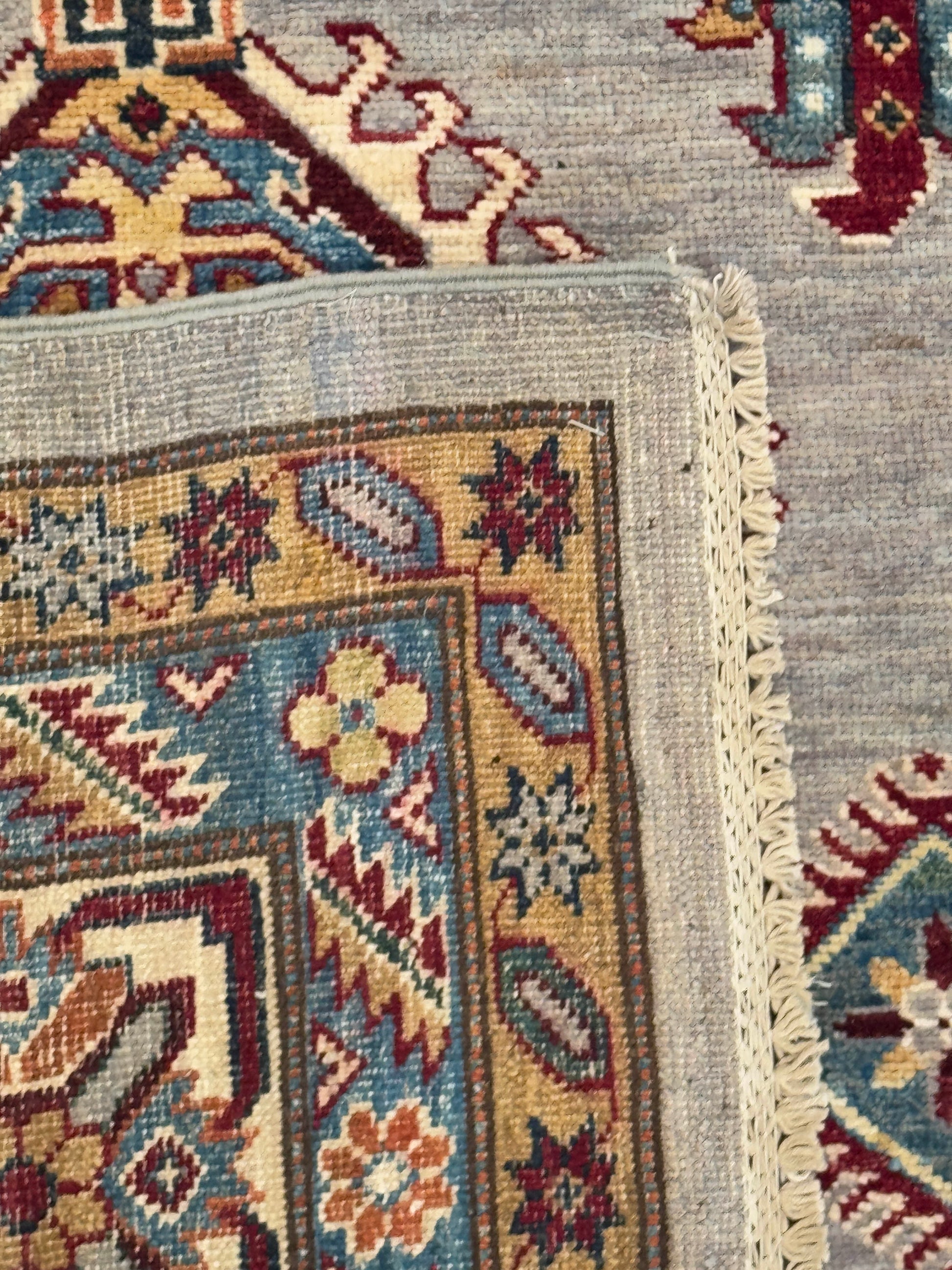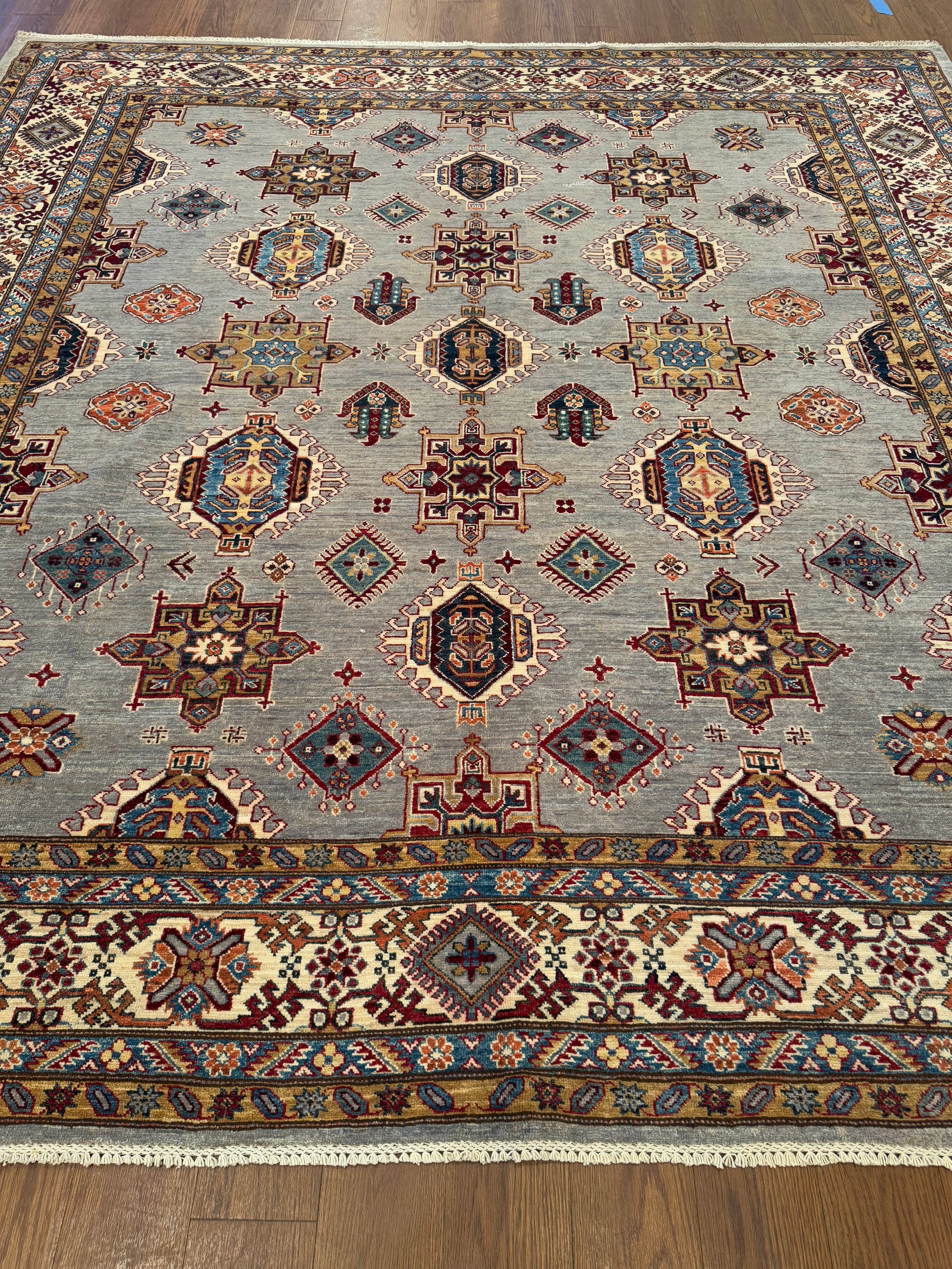 This handwoven rug showcases a refined tribal elegance with its soft gray field adorned by repeating geometric medallions in rich tones of burgundy, navy, ivory, and teal. The motifs are carefully arranged in a rhythmic pattern, framed by a layered border that incorporates intricate floral and angular elements. The balance of muted ground and vibrant accents creates a versatile piece that feels both contemporary and steeped in tradition.