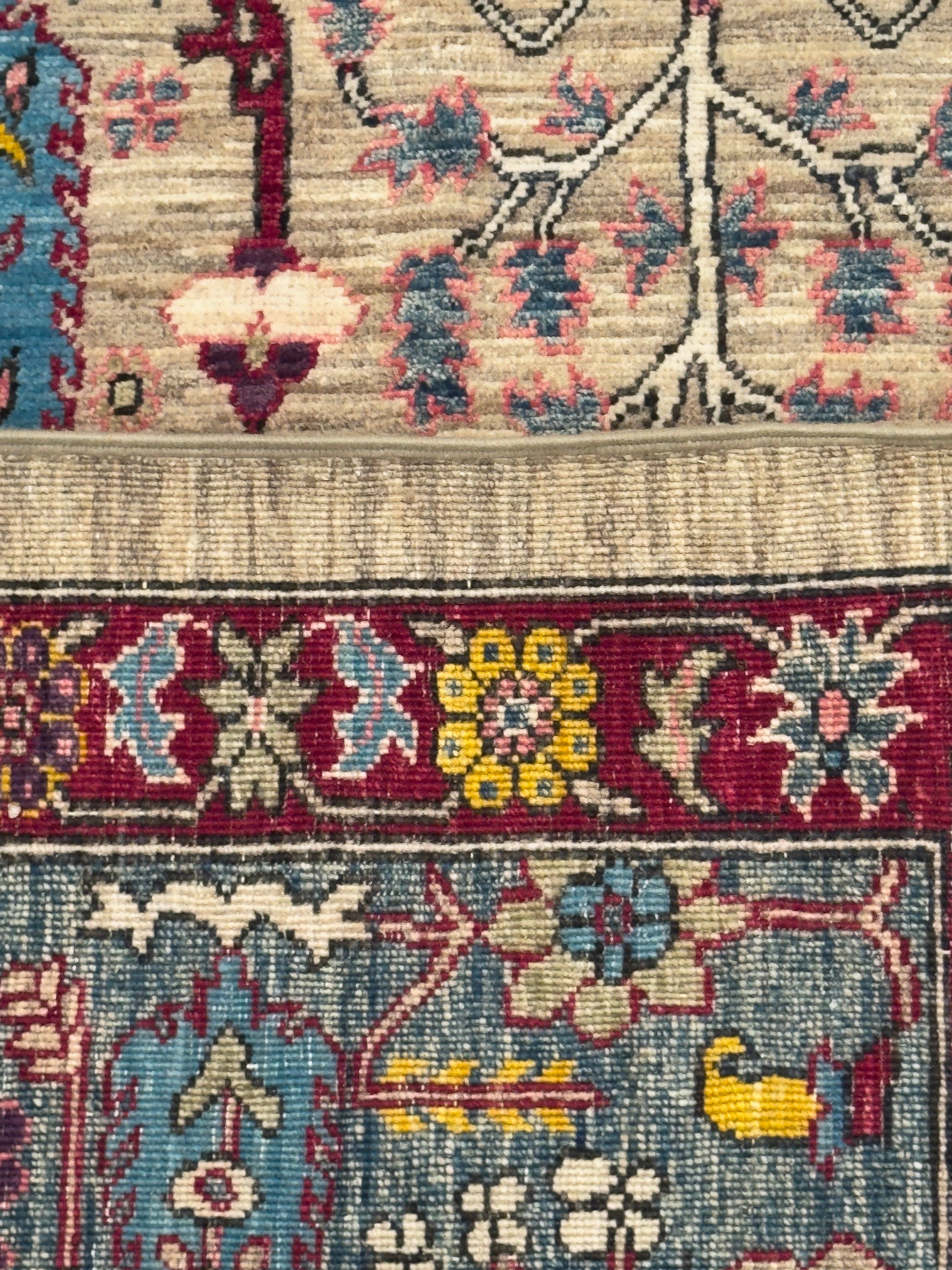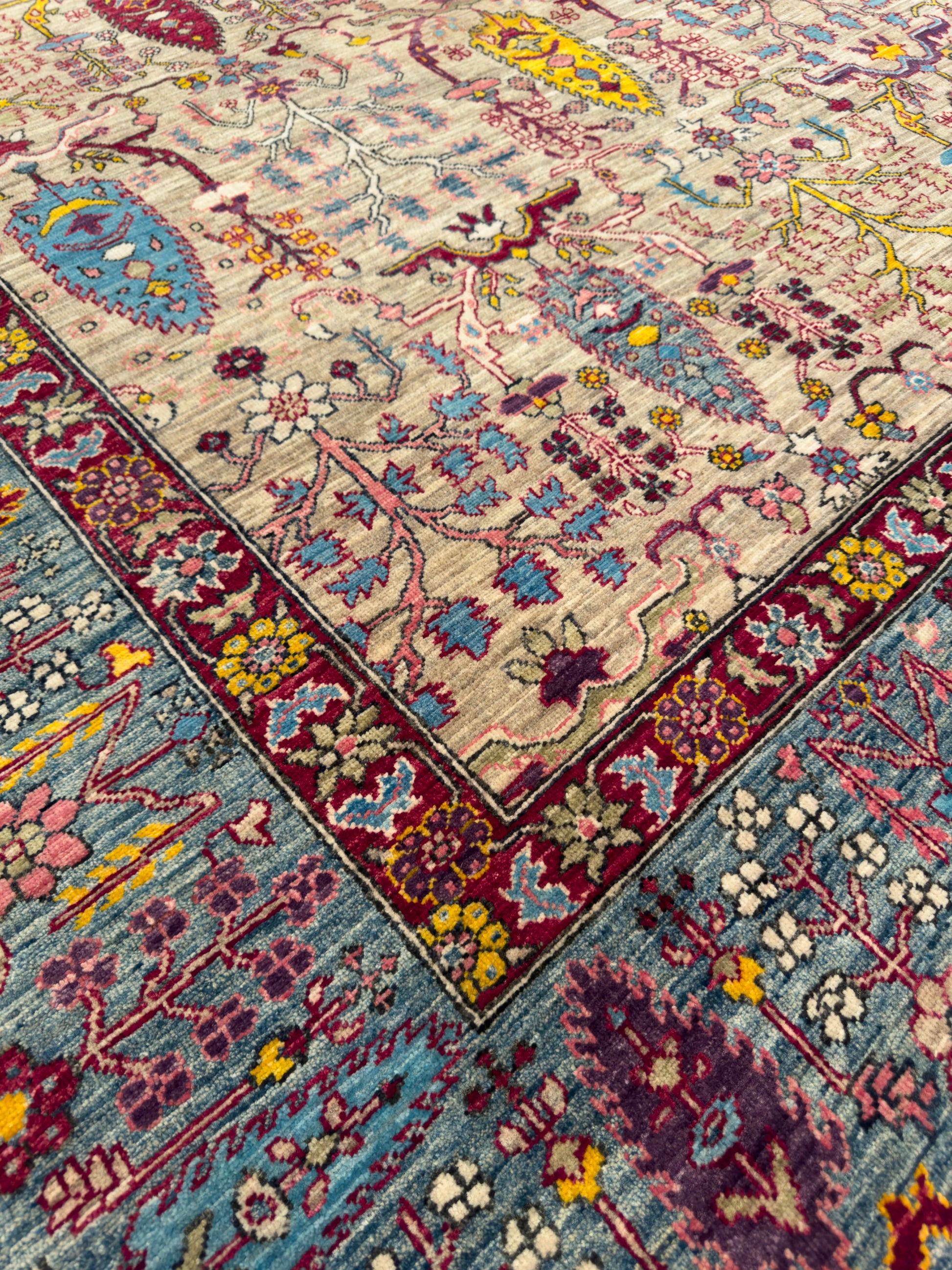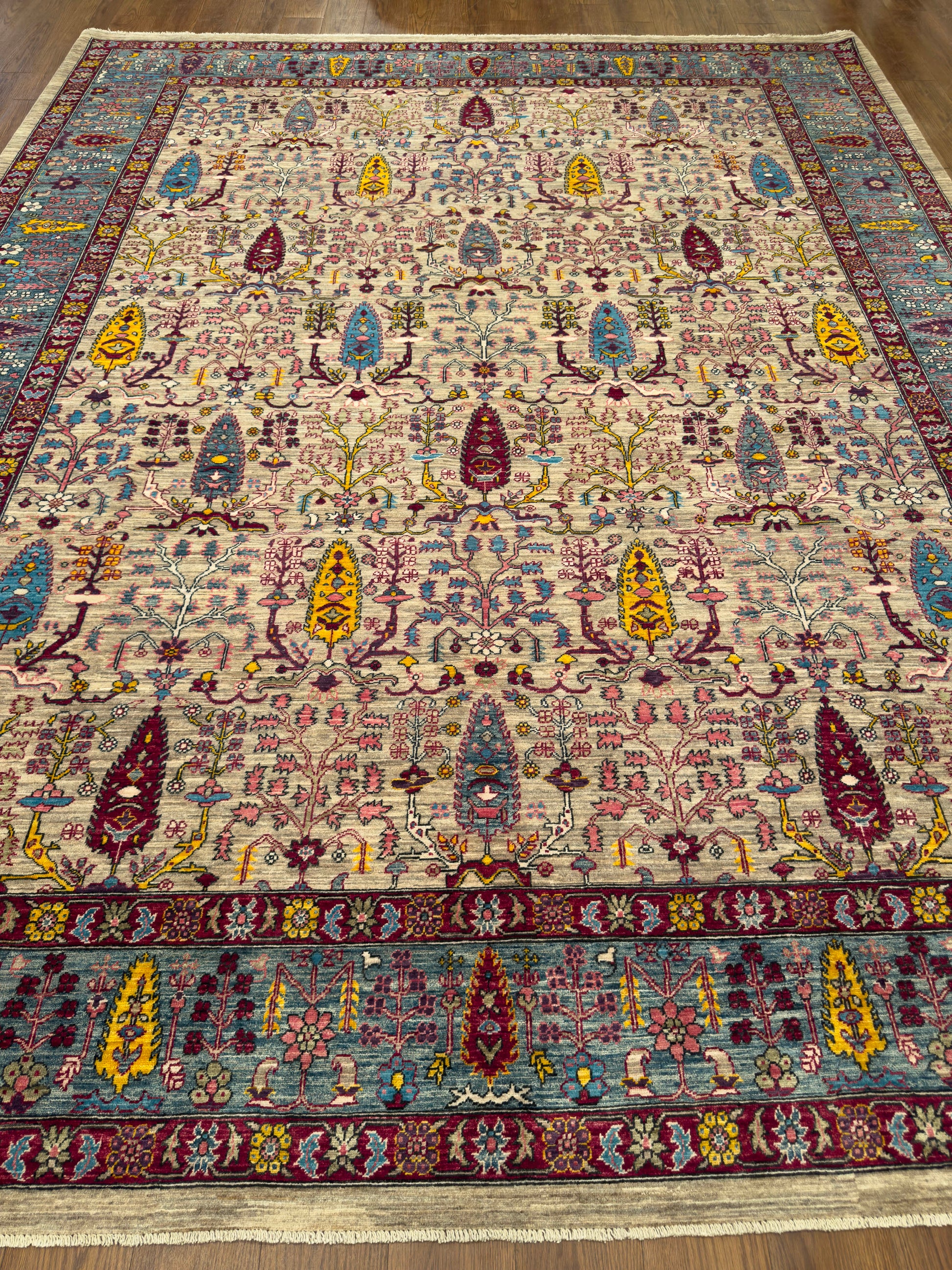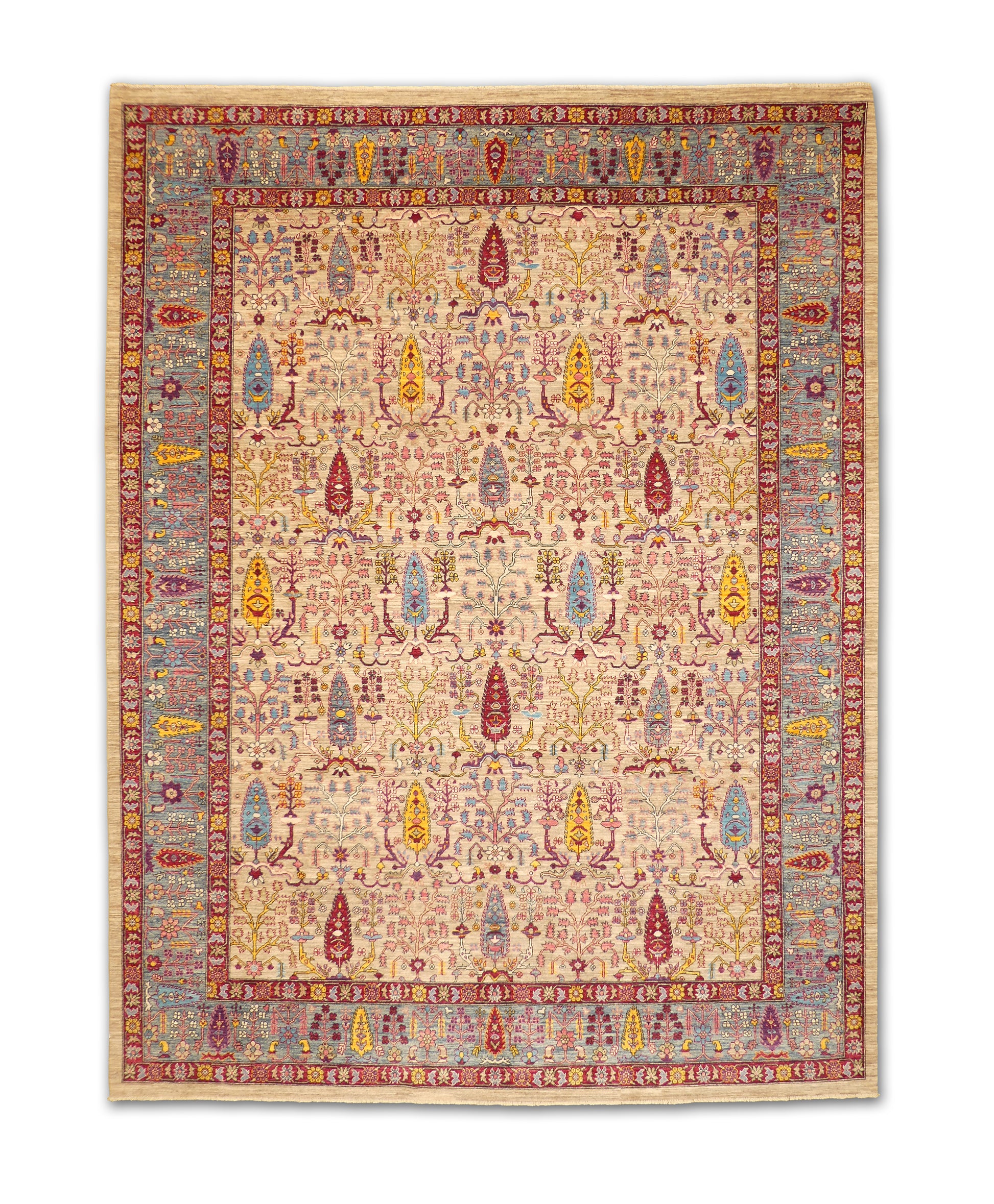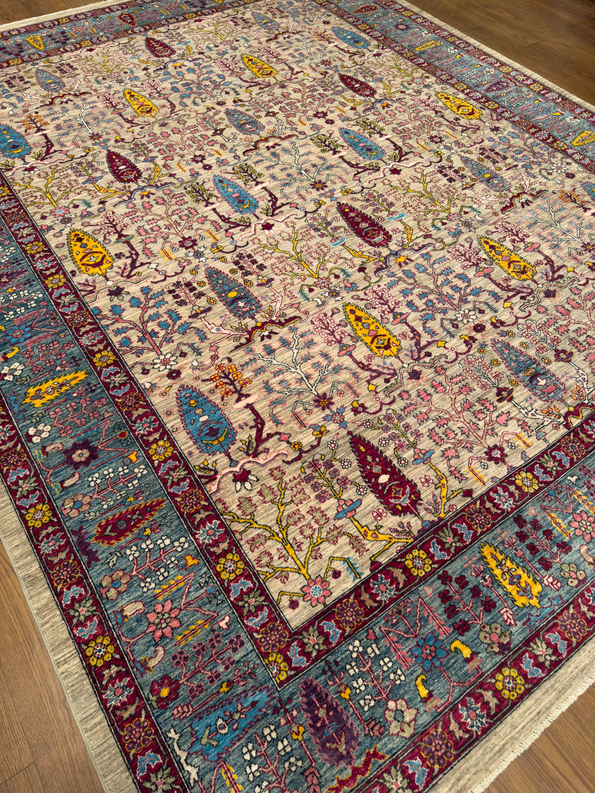 This exquisite hand-knotted rug presents a soft ivory field enlivened by rows of stylized cypress and boteh motifs in vivid shades of crimson, gold, sapphire blue, and olive green. The repeating pattern creates a sense of rhythm and refinement, while the wide border in soft blue with intricate floral and geometric detailing frames the composition with elegance. The combination of jewel-like tones against a light backdrop gives the piece both brightness and warmth, making it an inviting yet sophisticated statement. Perfect for dining rooms, formal living spaces, or transitional interiors that call for color and artistry.