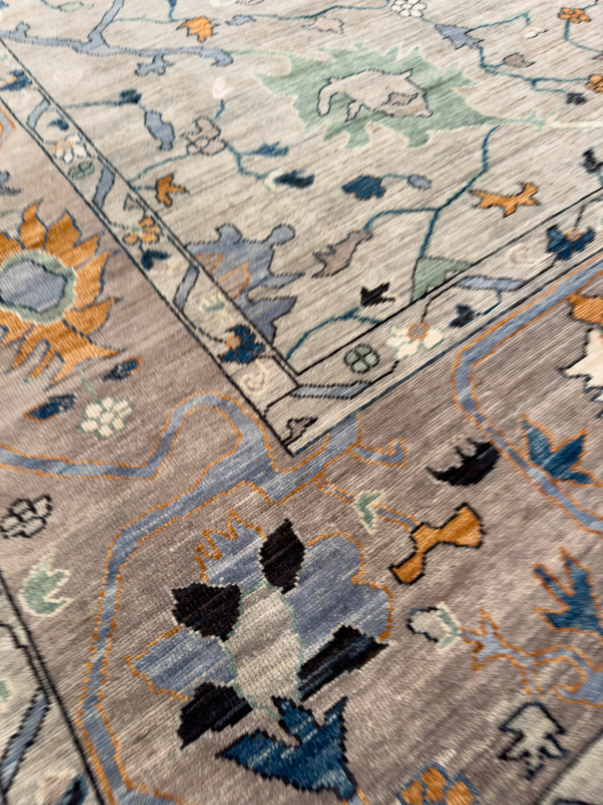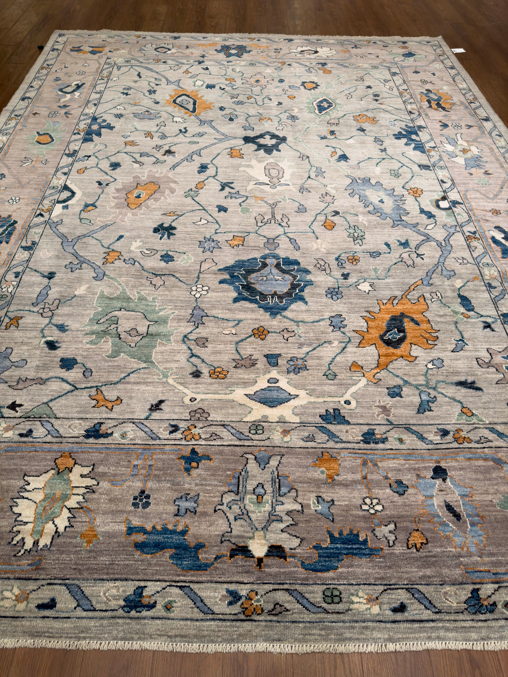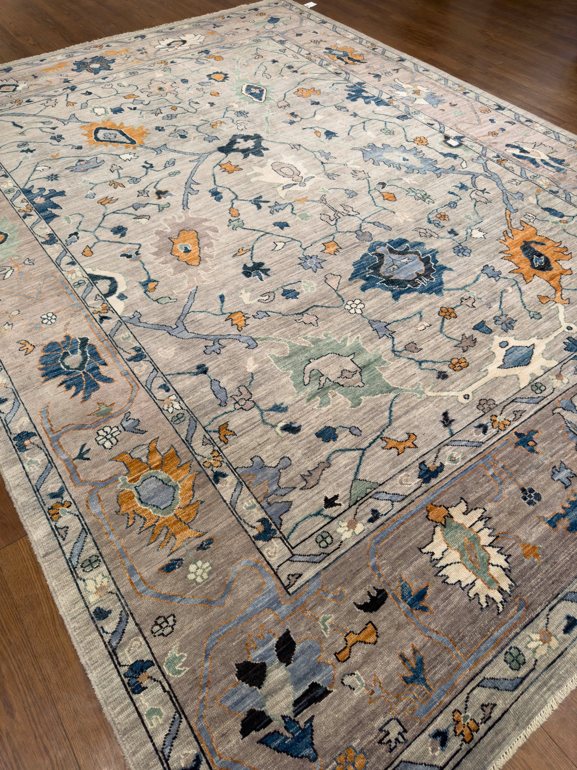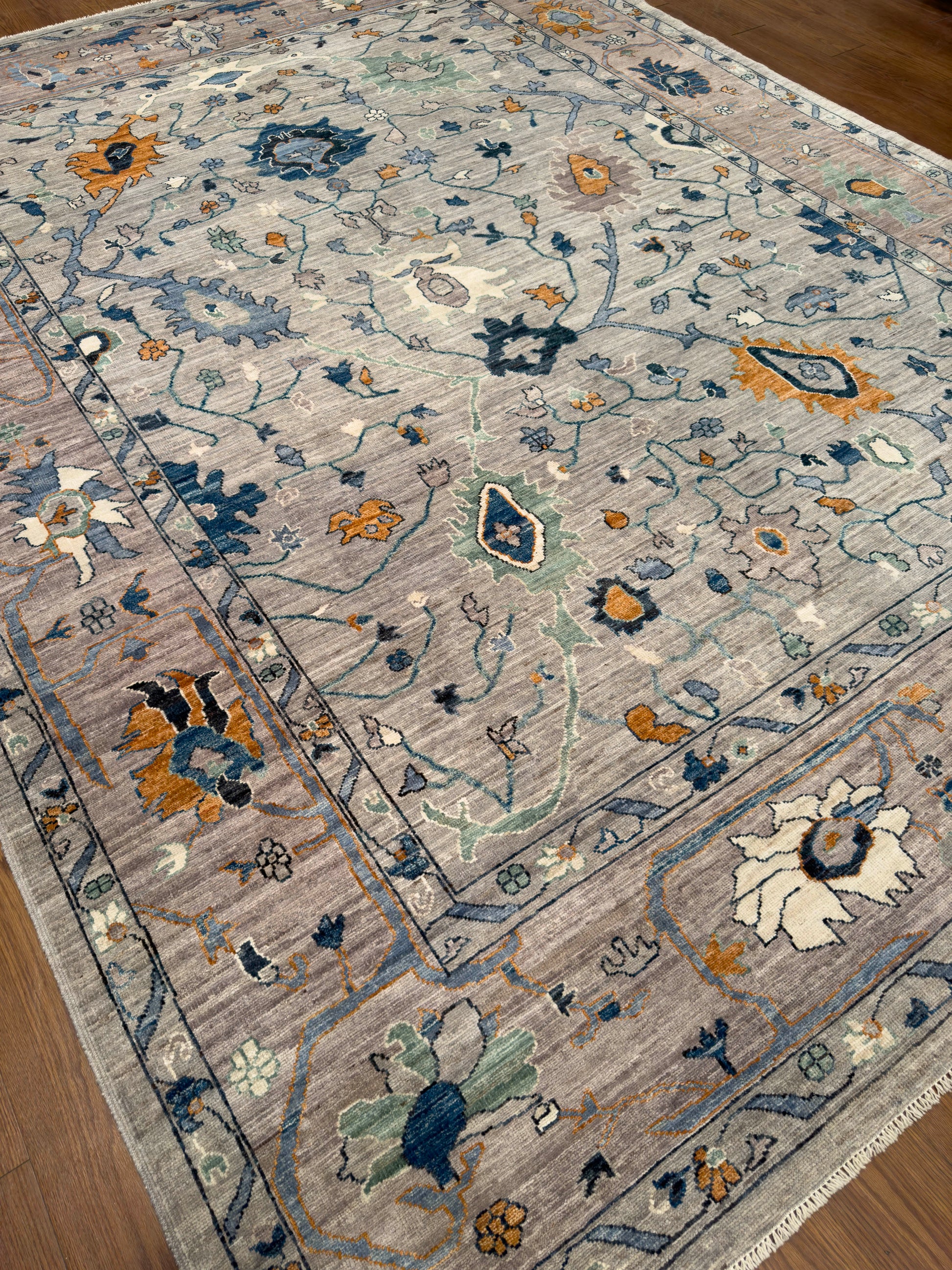This graceful hand-knotted rug features a soft gray field alive with delicate floral and vine motifs in shades of navy, teal, saffron gold, ivory, and soft green. The scrolling botanical design flows with a natural rhythm, balanced by a border of stylized blossoms that frames the composition with quiet elegance. The cooler base tones contrasted with warm accents create harmony and depth, lending the piece both sophistication and versatility. A refined choice for transitional interiors, this rug is ideal for living rooms, dining areas, or bedrooms that call for subtle elegance with a touch of vibrancy.