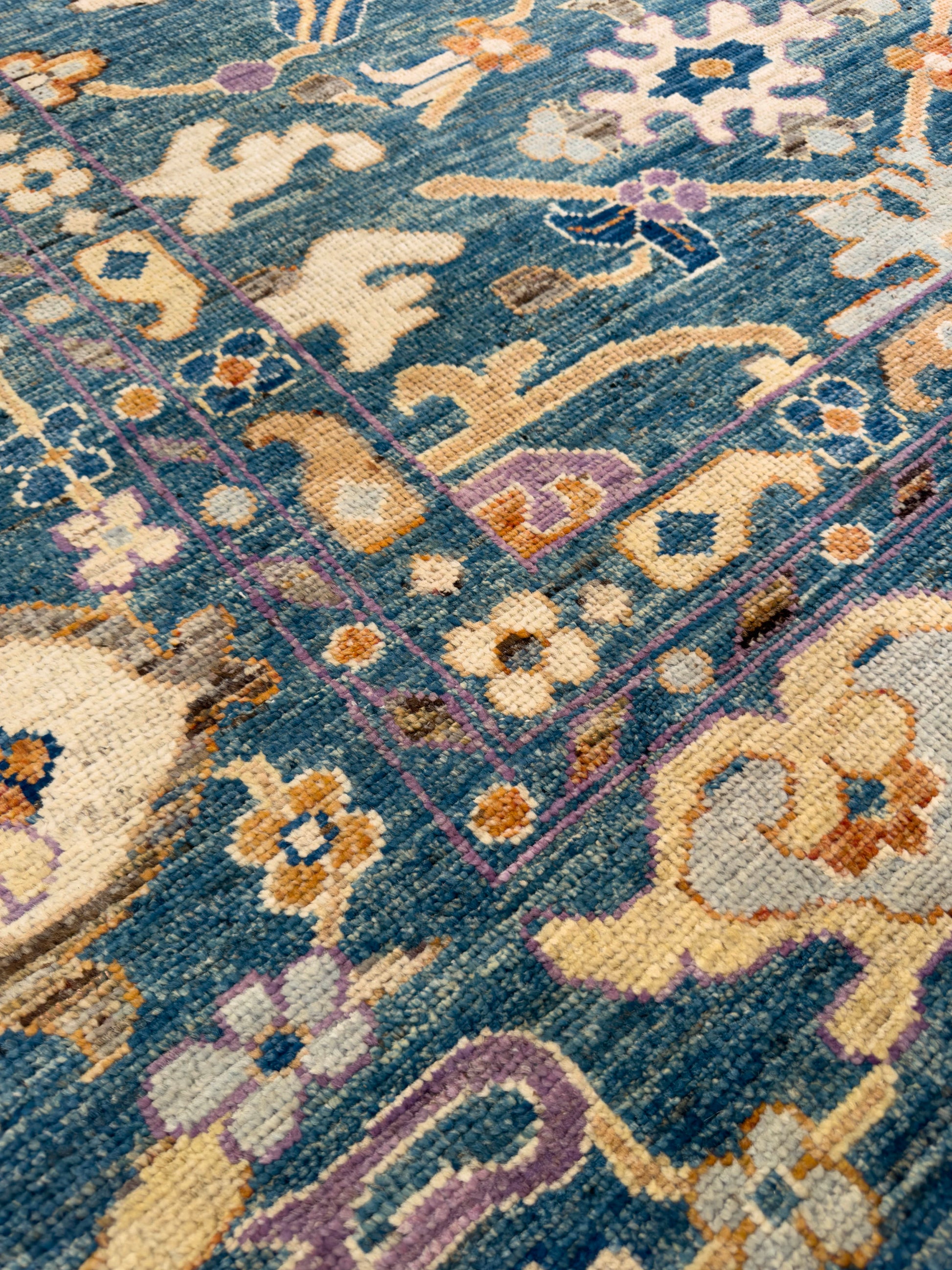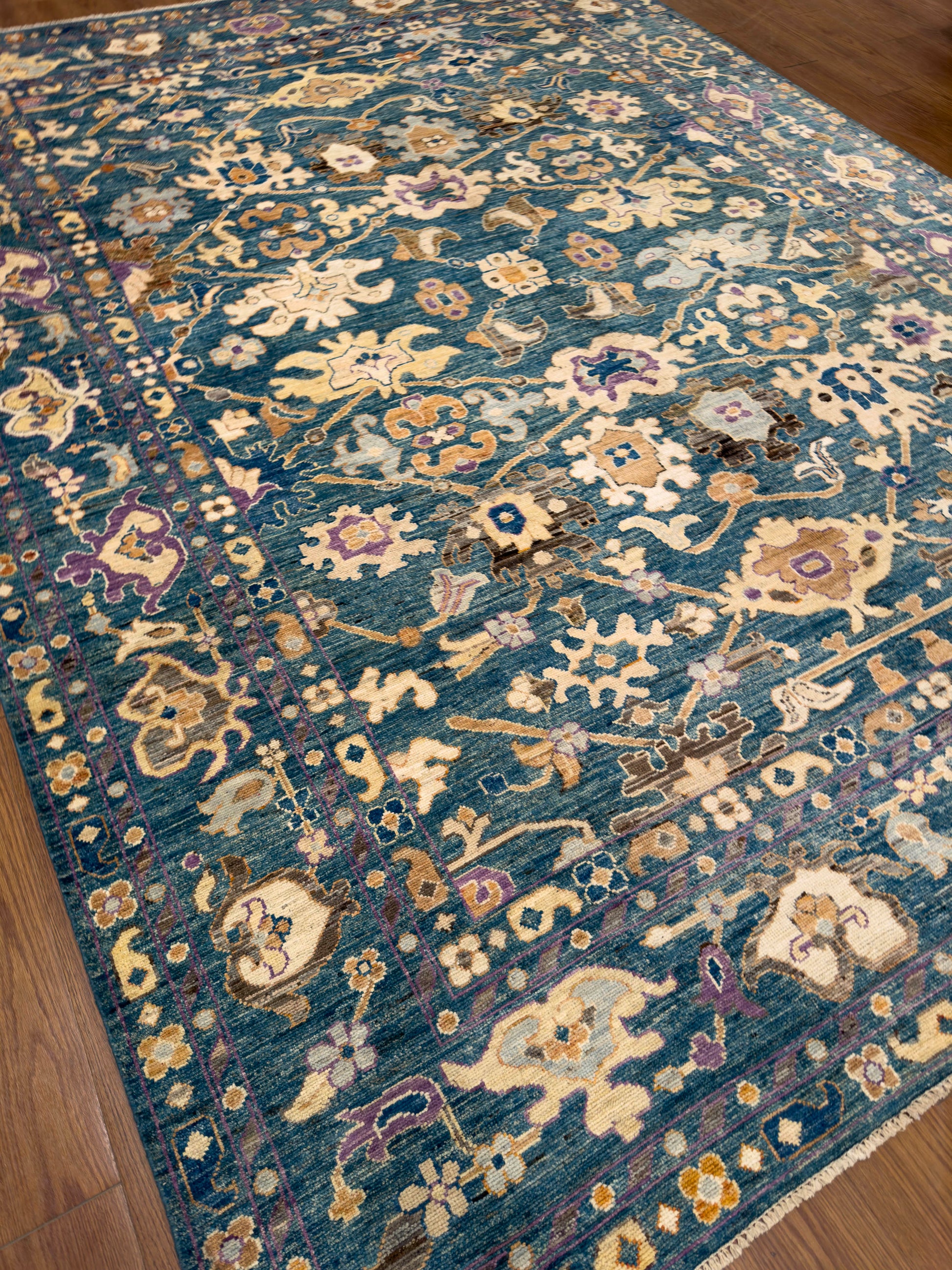 This striking hand-knotted rug showcases a rich teal field filled with bold floral and palmette motifs in tones of ivory, lavender, soft gold, and warm brown. The large-scale pattern is balanced with refined symmetry, creating both visual energy and harmony. A wide border featuring floral and vine elements in complementary shades frames the composition with elegance and depth. The interplay of jewel-like colors against the deep ground gives this piece a dramatic yet inviting presence, making it a standout choice for living rooms, dining spaces, or statement entryways that call for sophistication with personality.