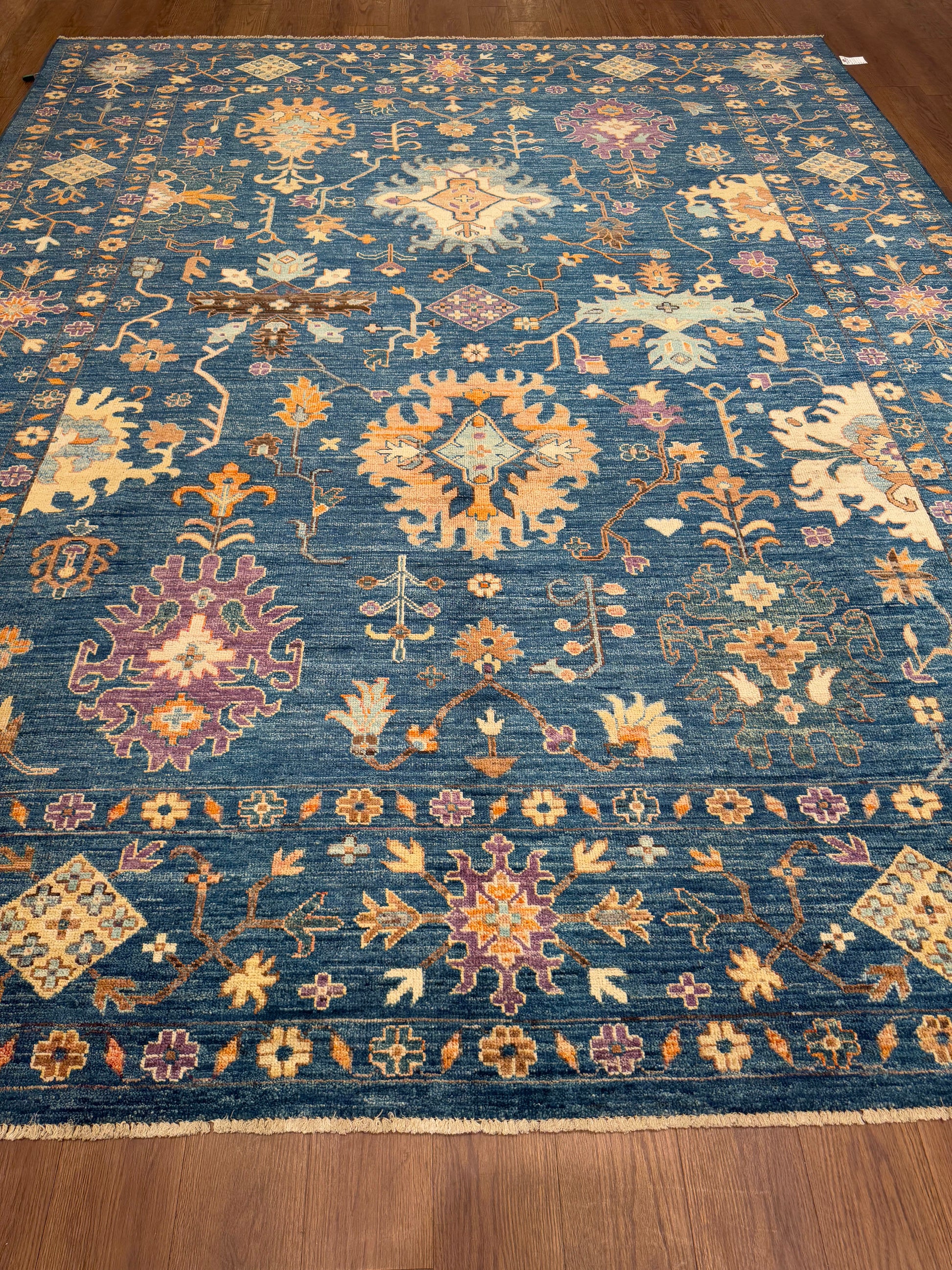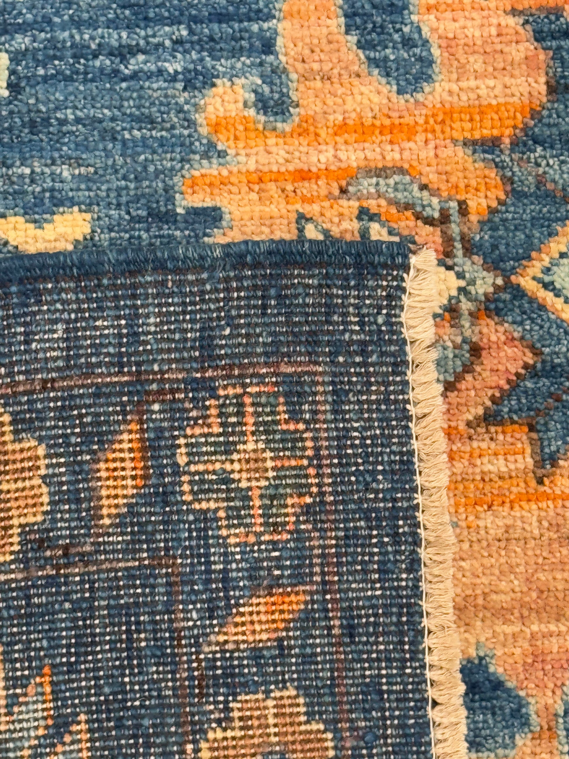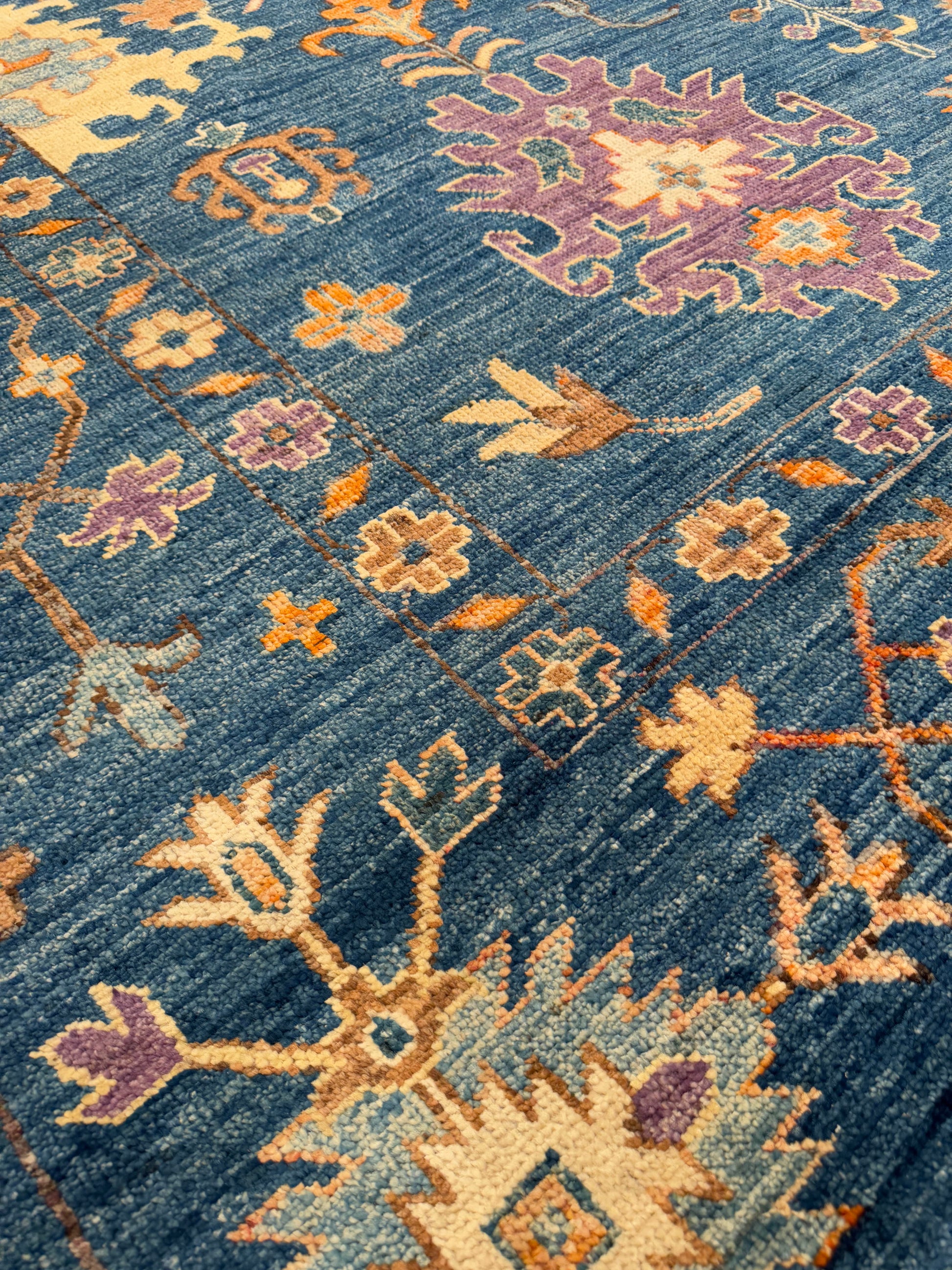 This bold hand-knotted rug features a deep indigo field adorned with vibrant floral and geometric motifs in shades of saffron gold, soft ivory, and rich plum. The large-scale, stylized patterns radiate energy while maintaining balance through their symmetrical arrangement. A border filled with blossoms and angular forms frames the interior with refinement, enhancing the rug’s commanding presence. The interplay of warm and cool tones creates a striking contrast, giving this piece both vibrancy and depth. Perfect for living rooms, dining areas, or entryways that call for a dramatic yet timeless foundation.