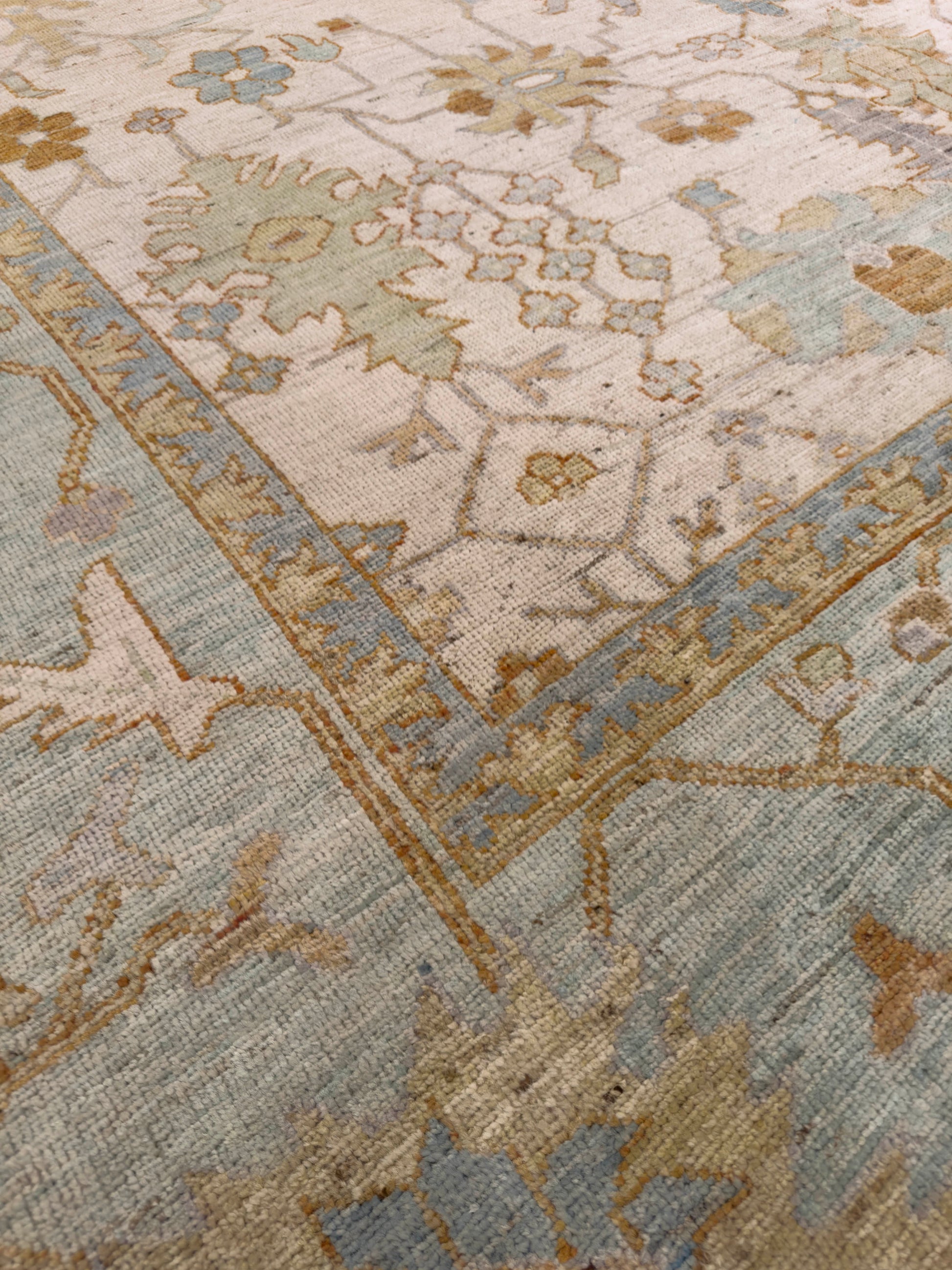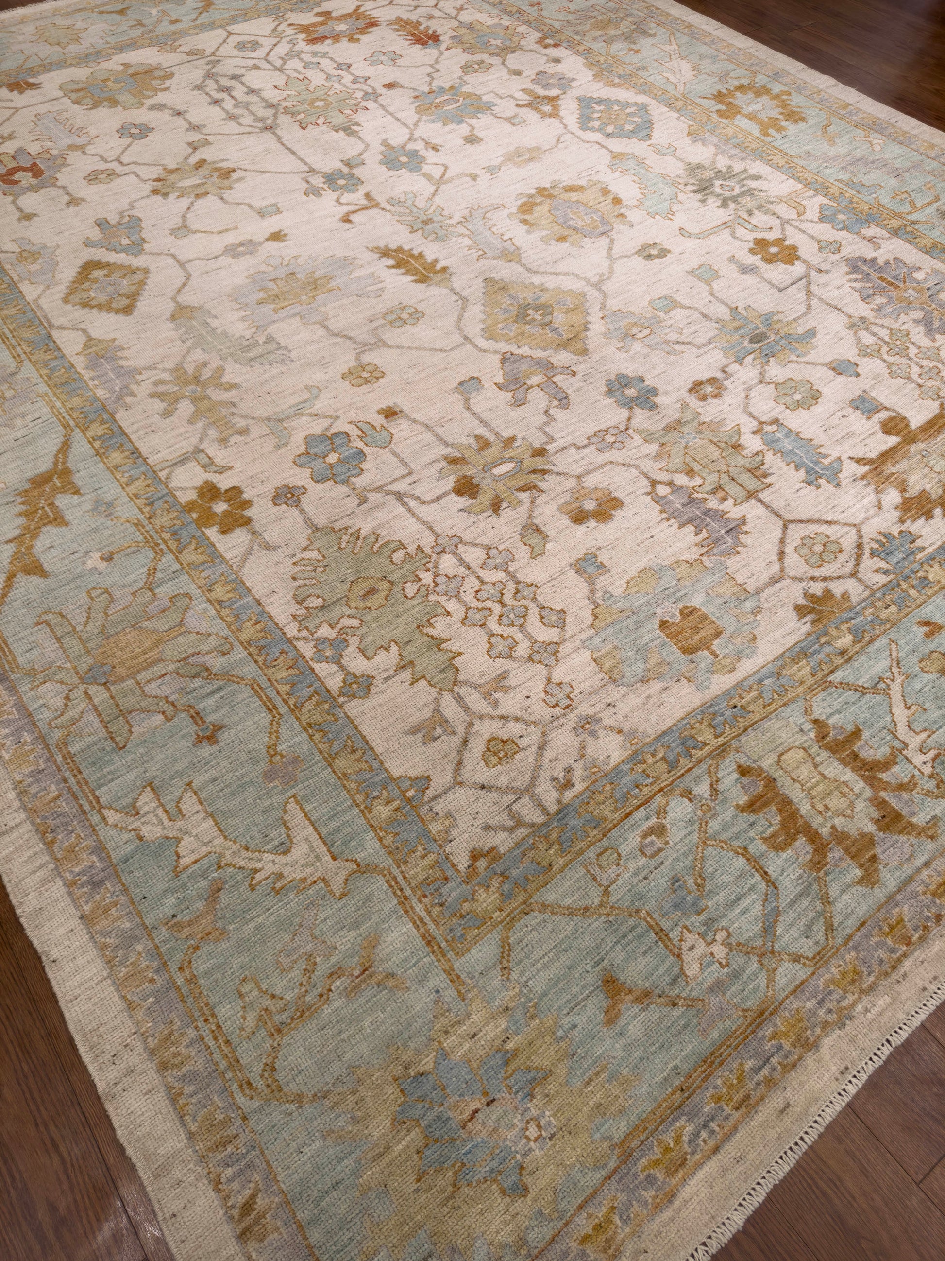 This elegant hand-knotted rug features a soft ivory field adorned with large-scale botanical and geometric motifs in muted tones of sky blue, camel, sage, and terracotta. The design flows in a loose symmetry, giving the rug both structure and an organic, freeform character. A wide border in faded blue with stylized floral details frames the composition, enhancing its vintage-inspired charm. The washed palette and open spacing of motifs create a light, airy feel, making this rug a versatile choice for both traditional and transitional interiors. Perfect for living rooms, dining areas, or bedrooms seeking timeless sophistication with a relaxed appeal.