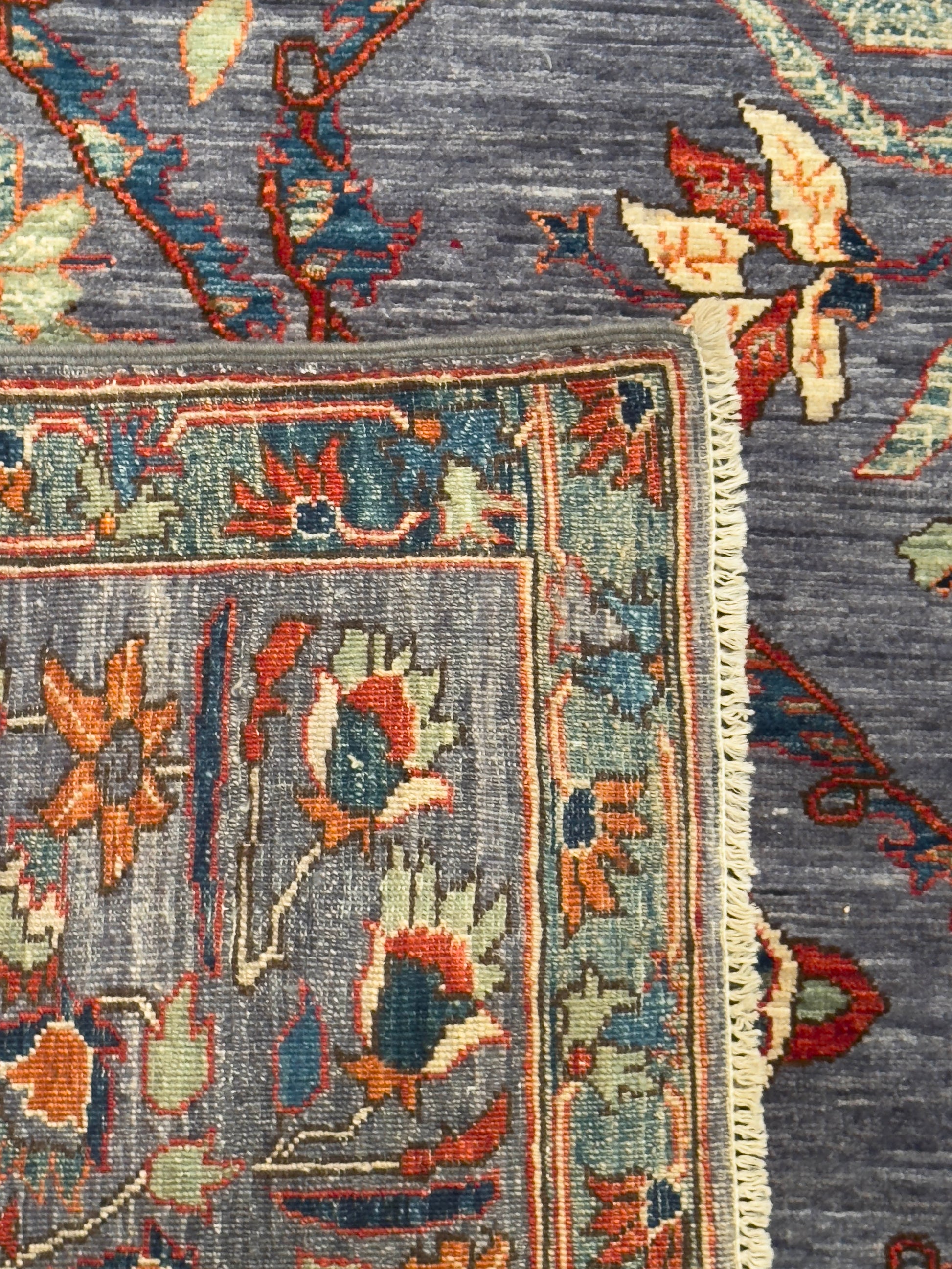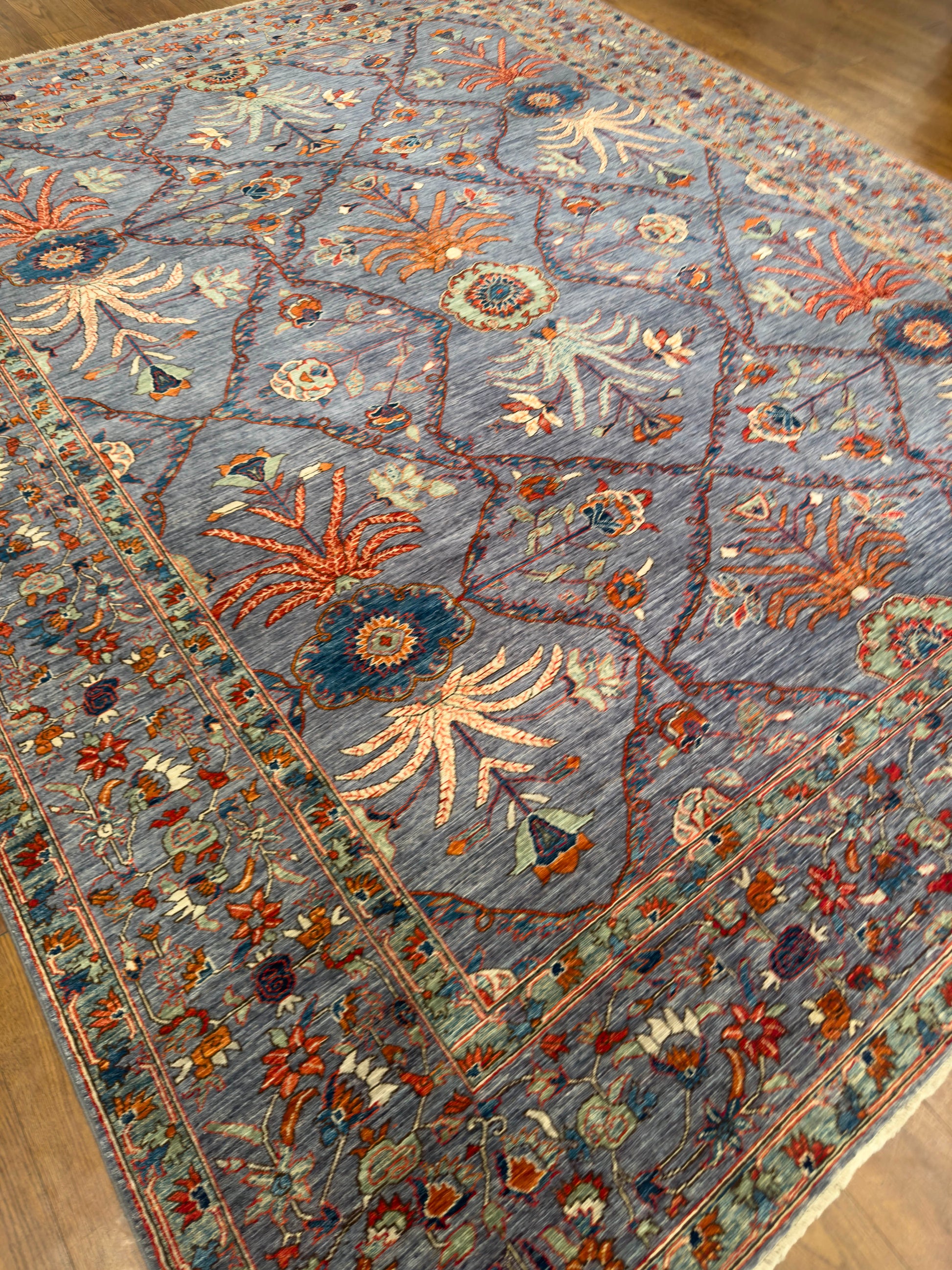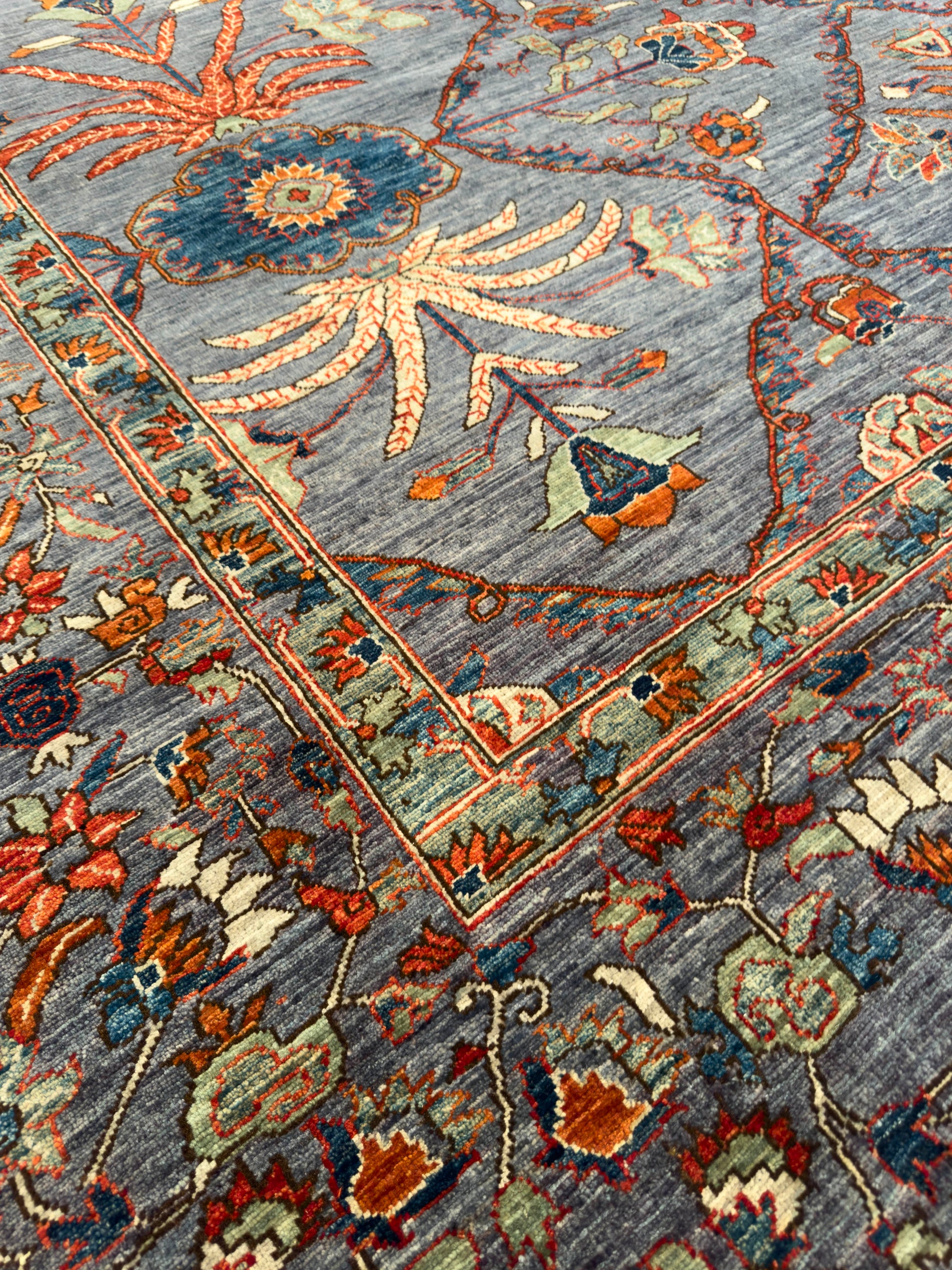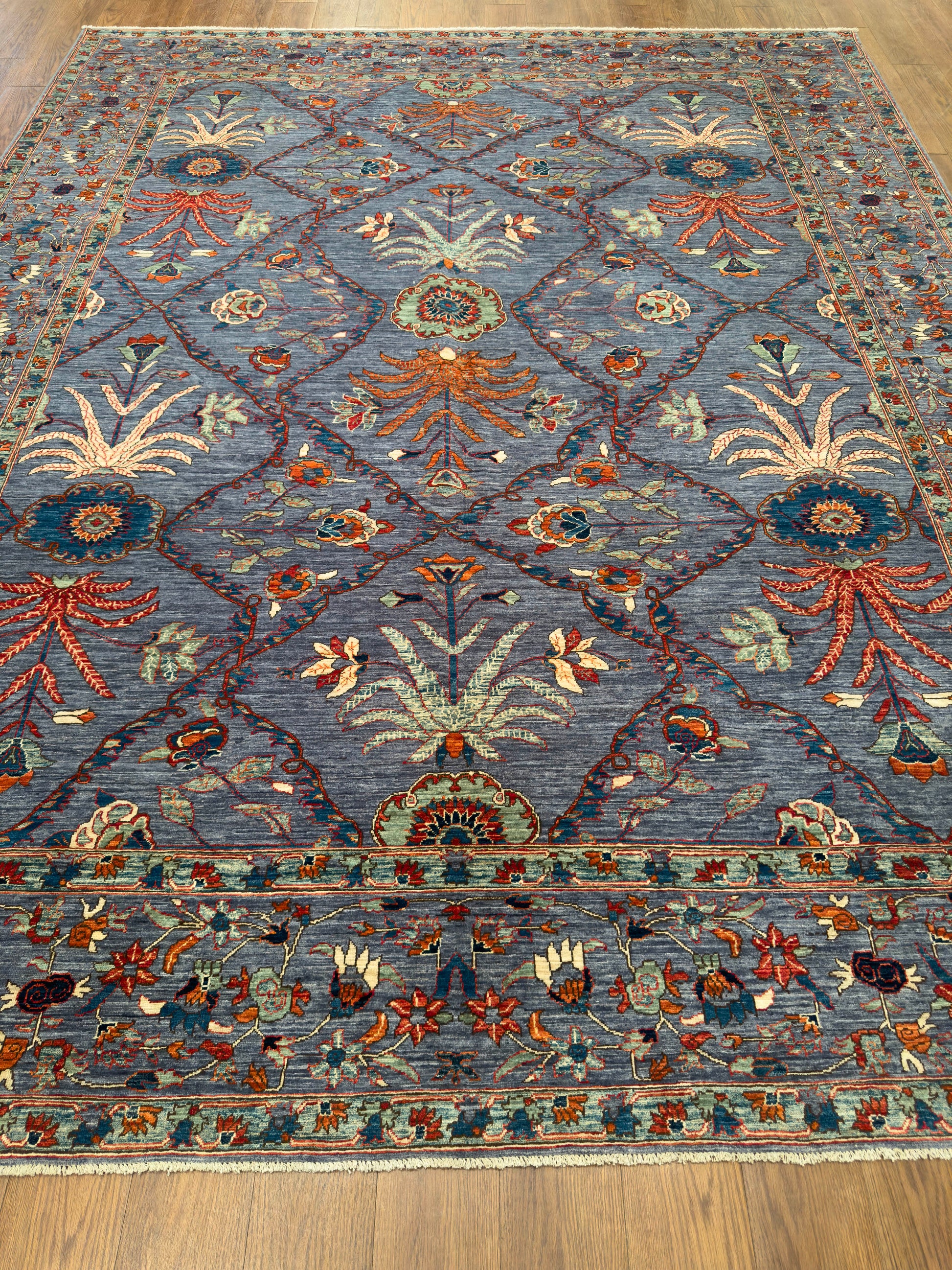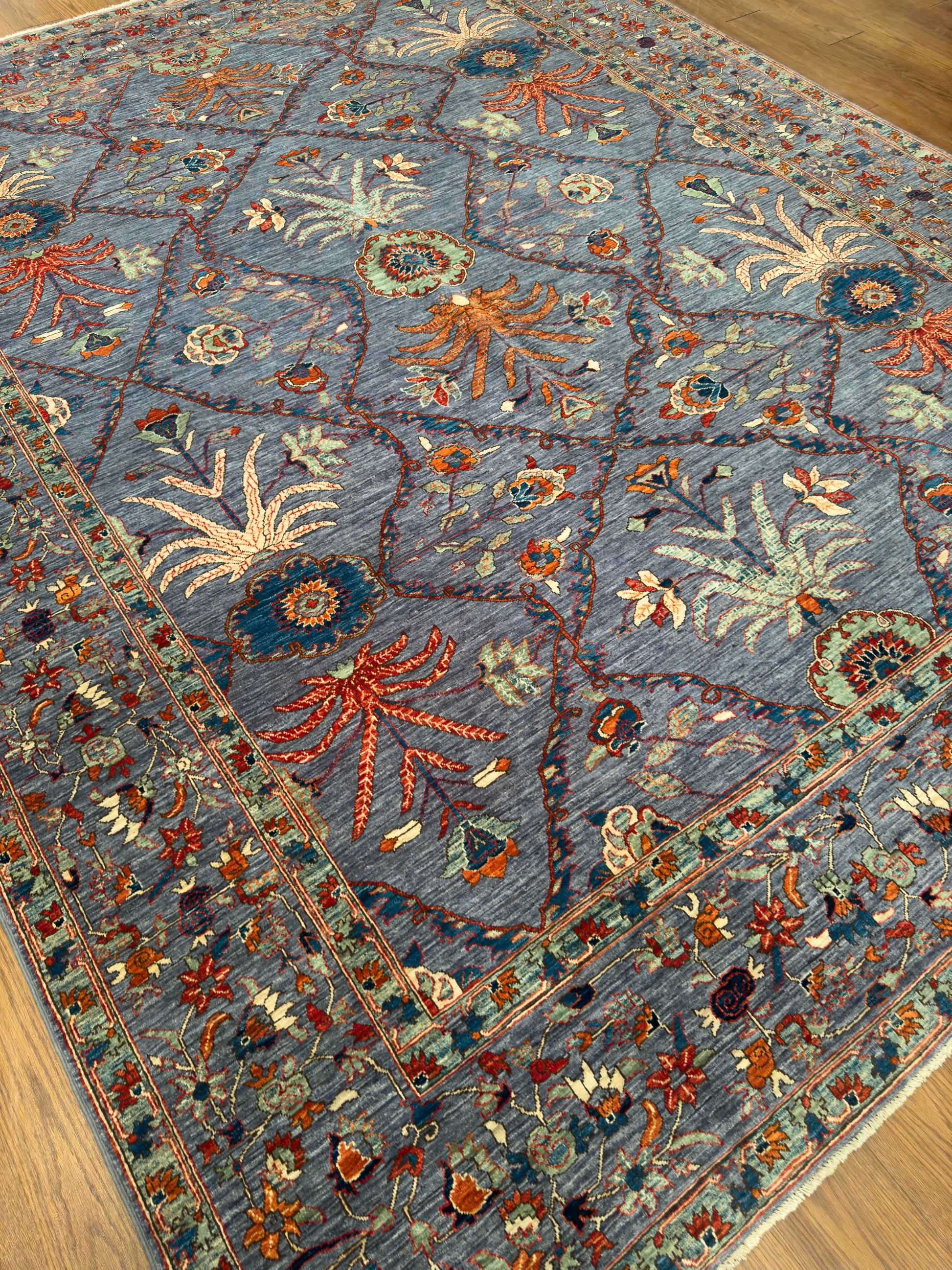 This vibrant hand-knotted rug features a slate-blue field enlivened by bold palm-like floral motifs and stylized medallions in shades of terracotta, peach, teal, and ivory. The design is arranged in a lattice-style framework, giving the composition both order and movement. A richly detailed border with crimson blossoms and leafy vines frames the interior, adding depth and warmth. The interplay of cool blue tones with vivid warm accents creates a dynamic yet balanced look, making this piece a striking choice for living rooms, dining areas, or transitional spaces seeking elegance with personality.