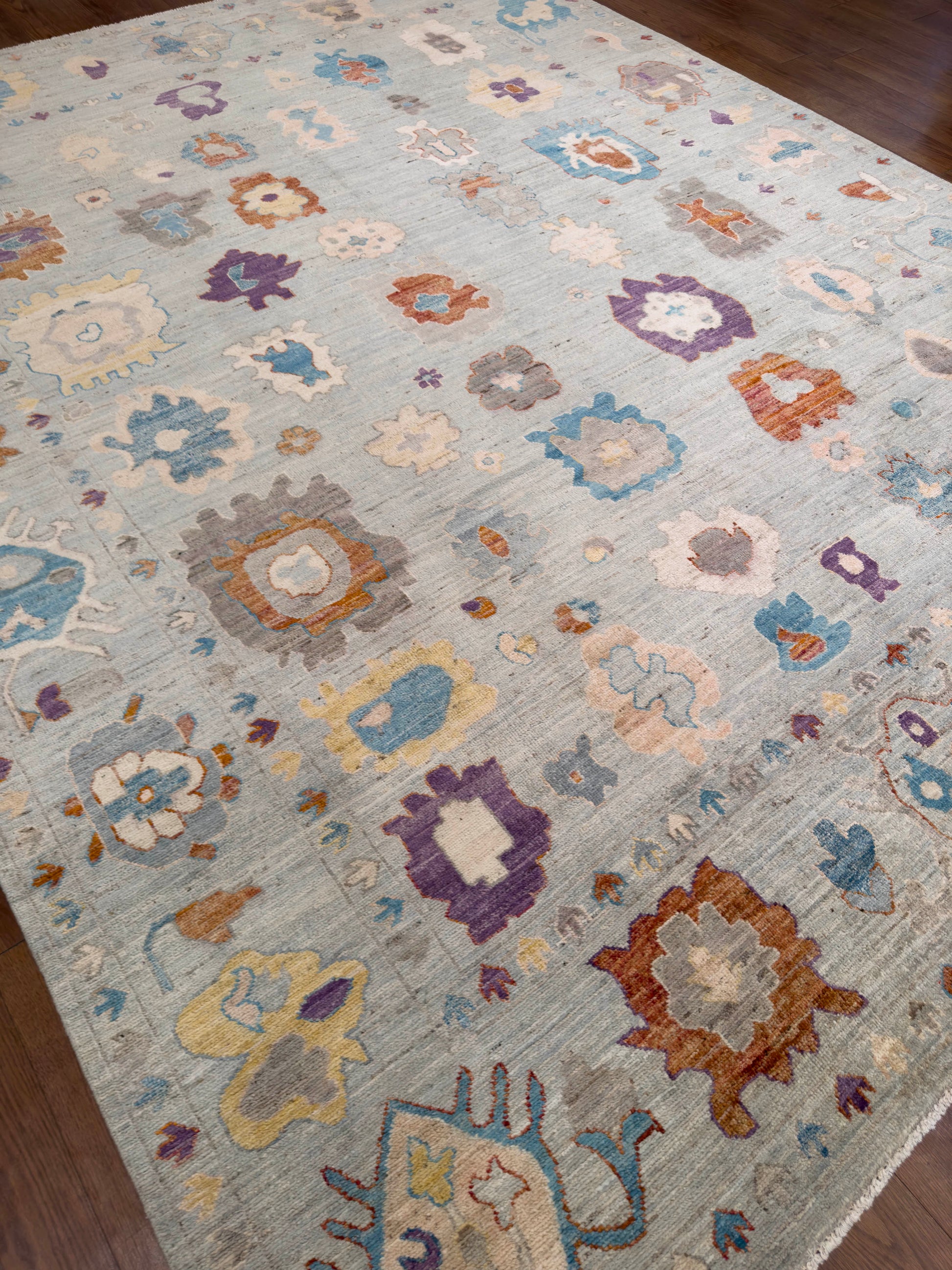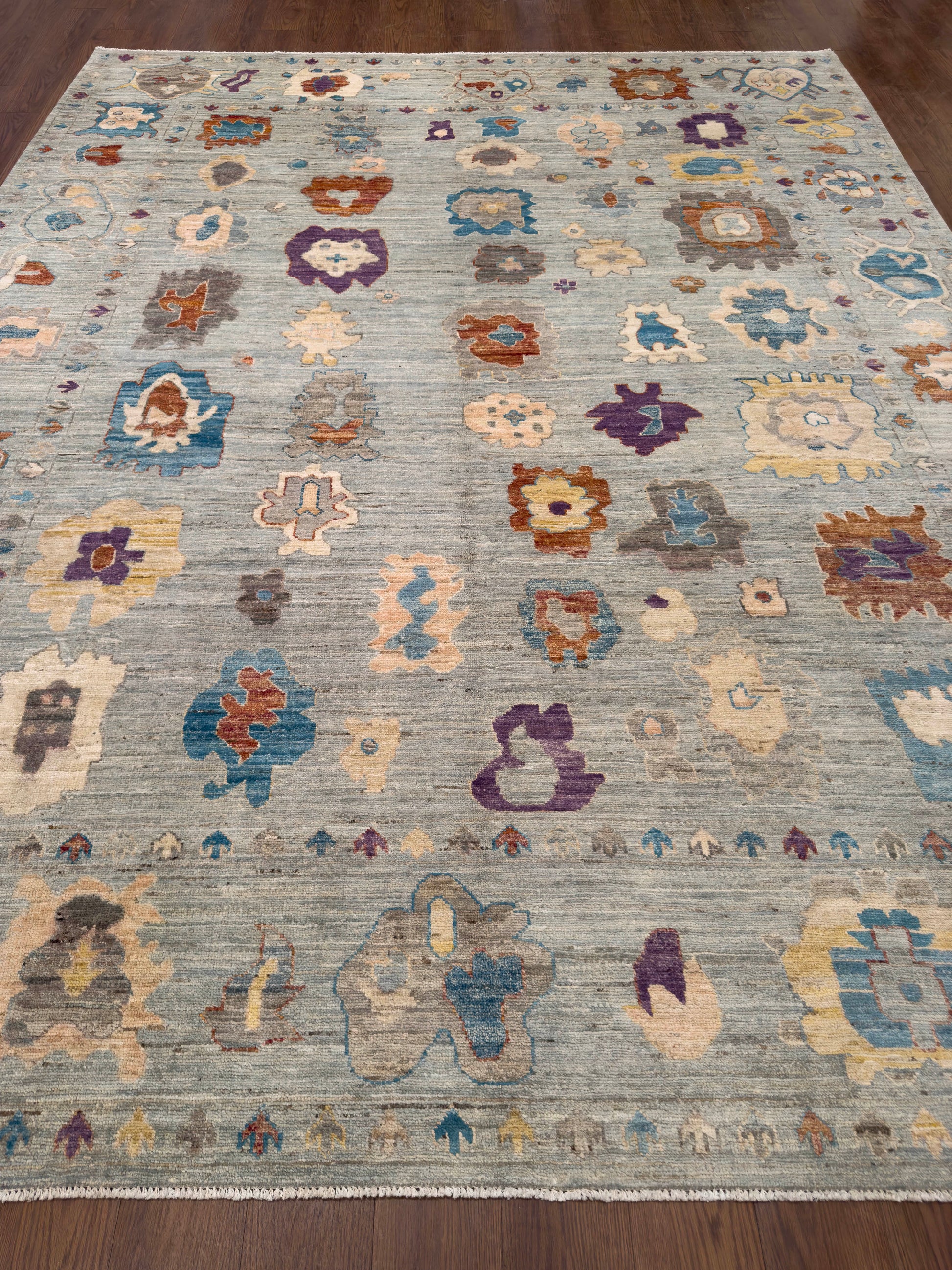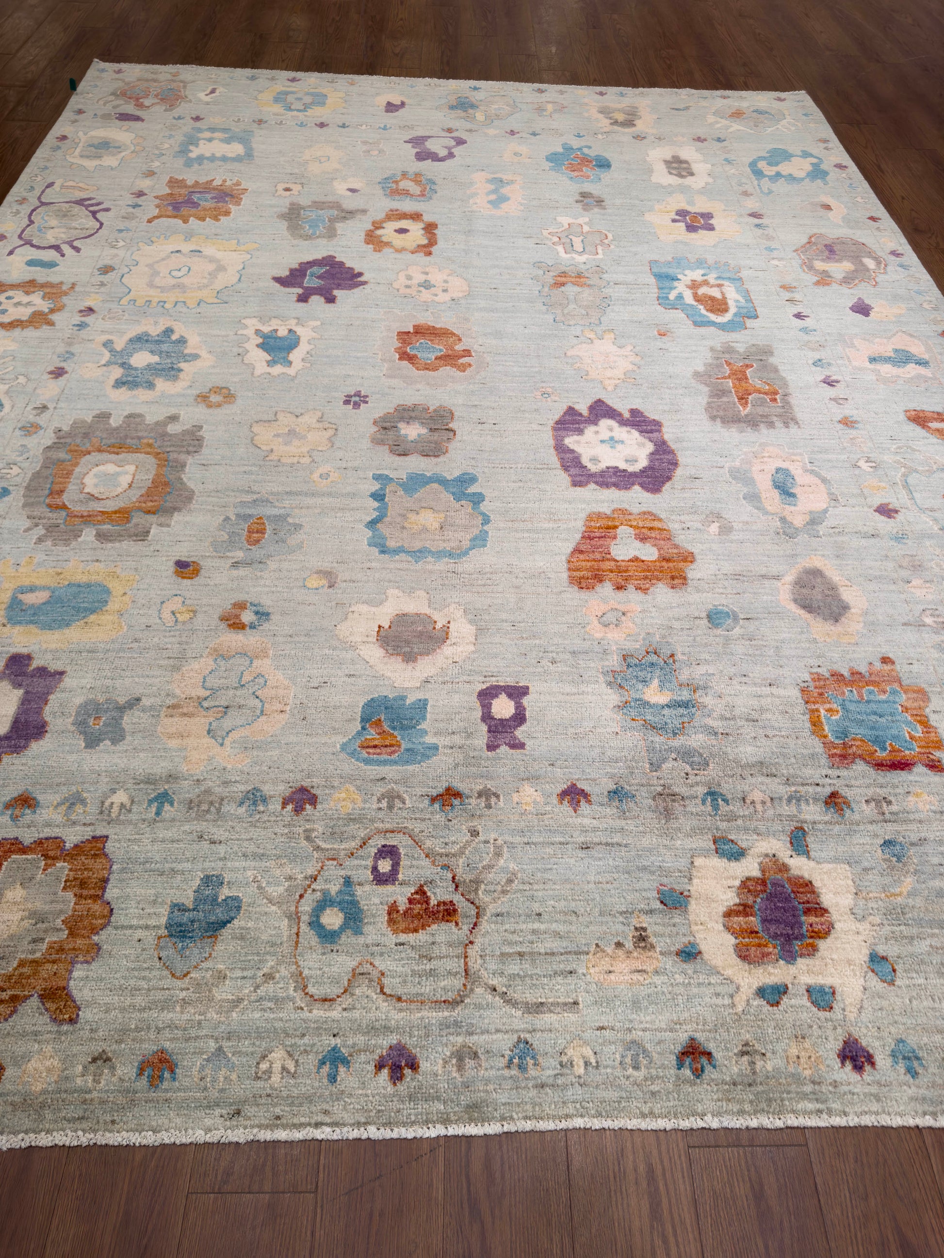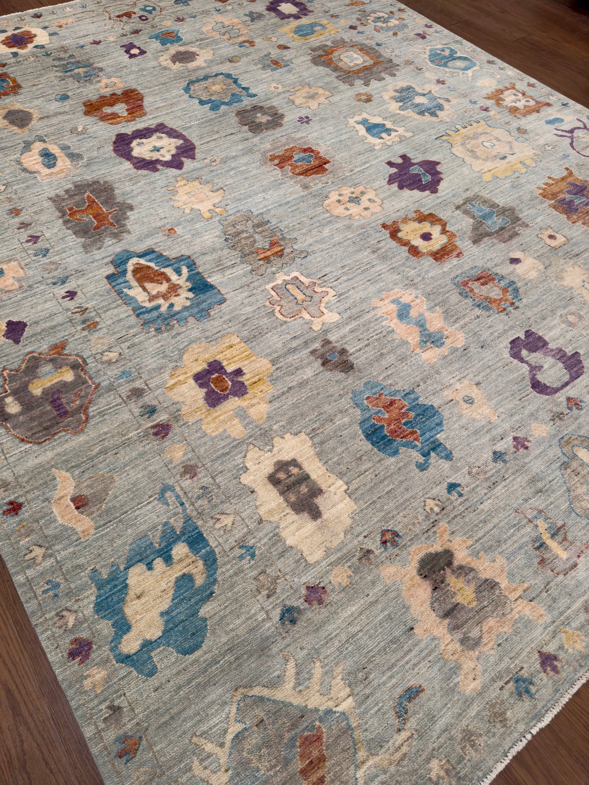 This playful hand-knotted rug features a soft sky-blue field decorated with scattered tribal and geometric motifs in a lively mix of ivory, rust, purple, gold, and turquoise. The irregular, freeform placement of shapes gives the rug a whimsical, contemporary character while still drawing inspiration from traditional village weaving. A subtle border with small boteh-like accents frames the design with charm. Its light, airy background contrasted with colorful highlights makes this piece especially versatile, perfect for eclectic living rooms, children’s spaces, or modern interiors that embrace artistry and individuality.