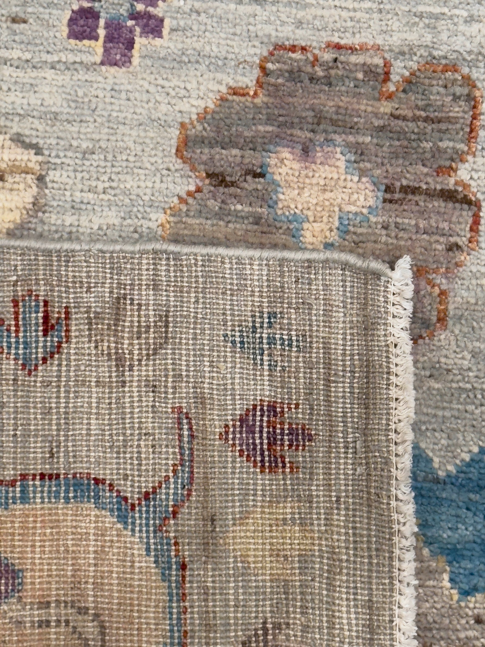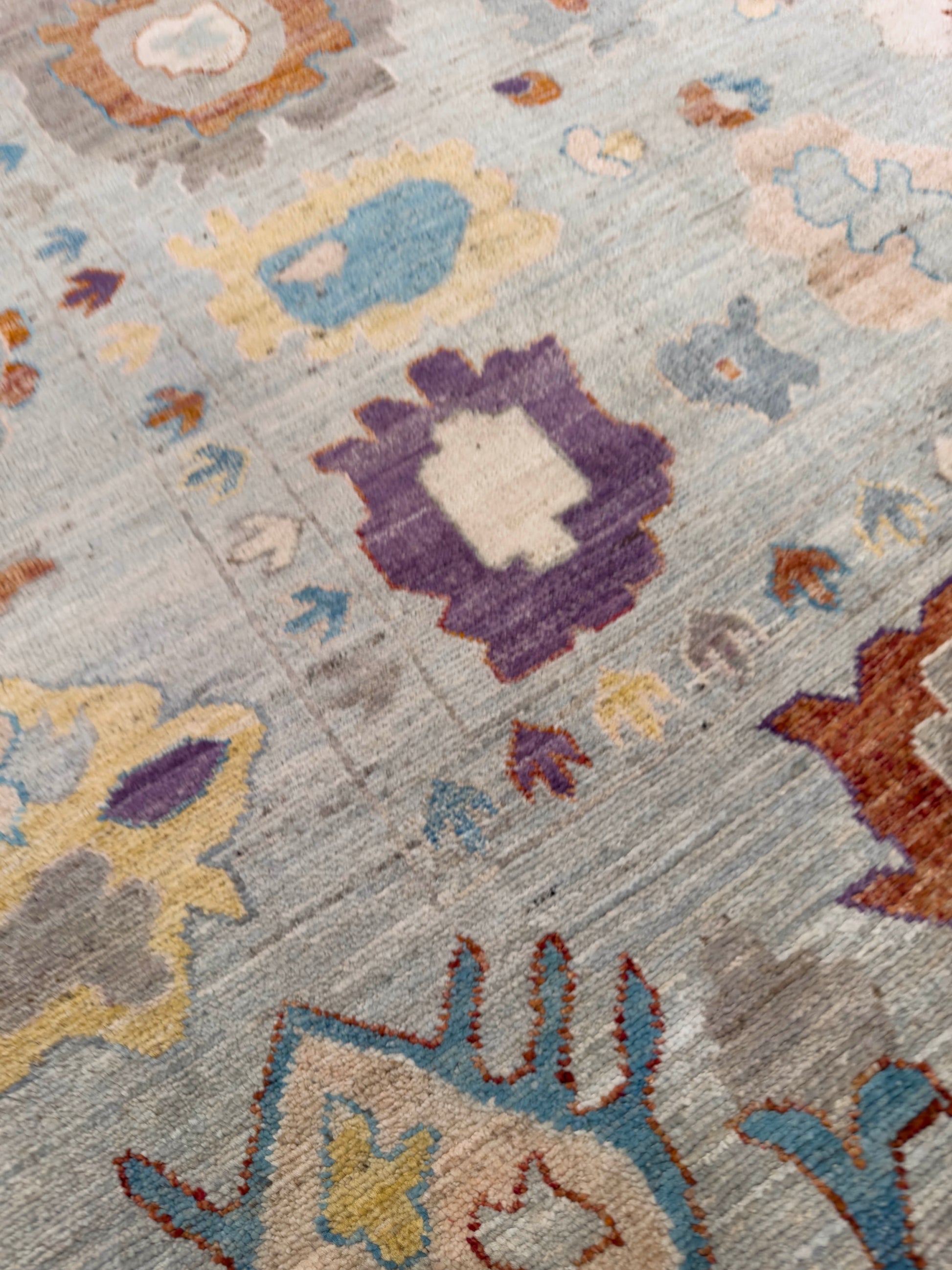 - Color: Sky-blue field with ivory, rust, purple, gold, and turquoise highlights