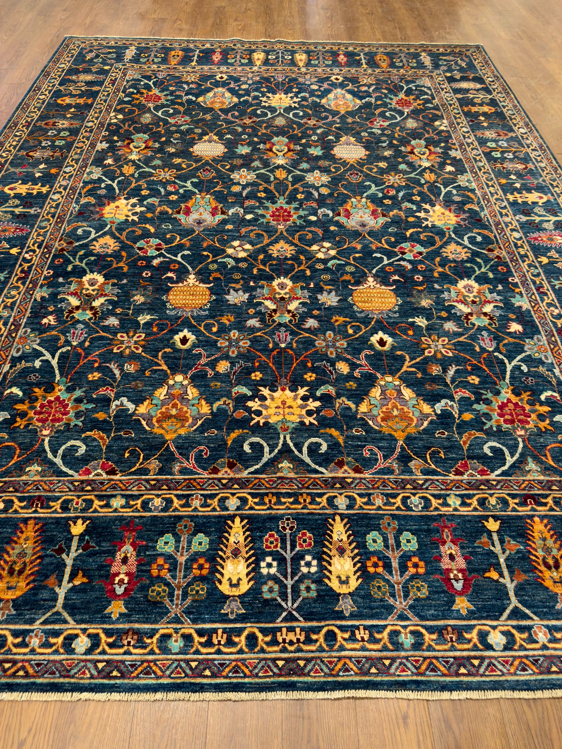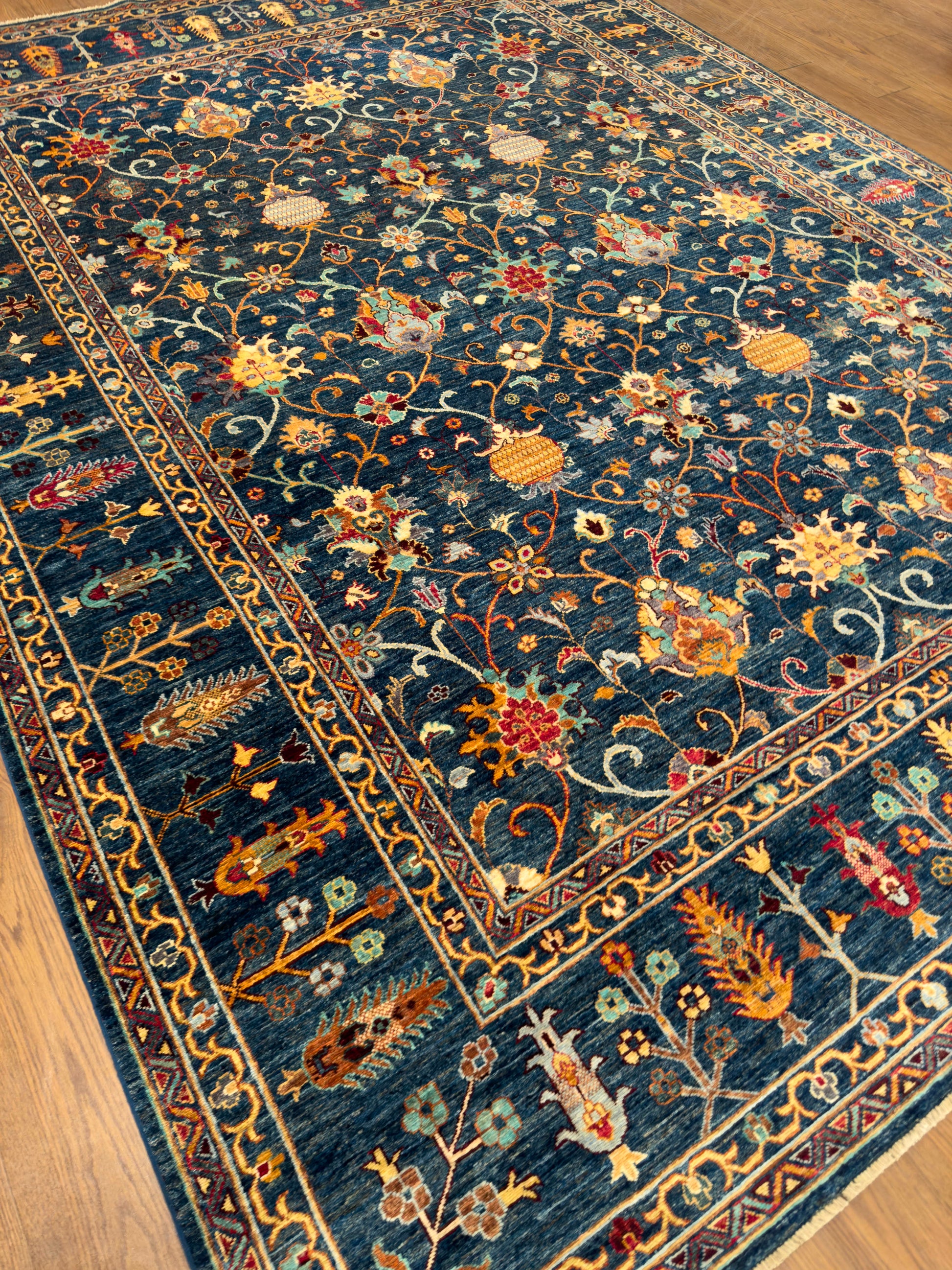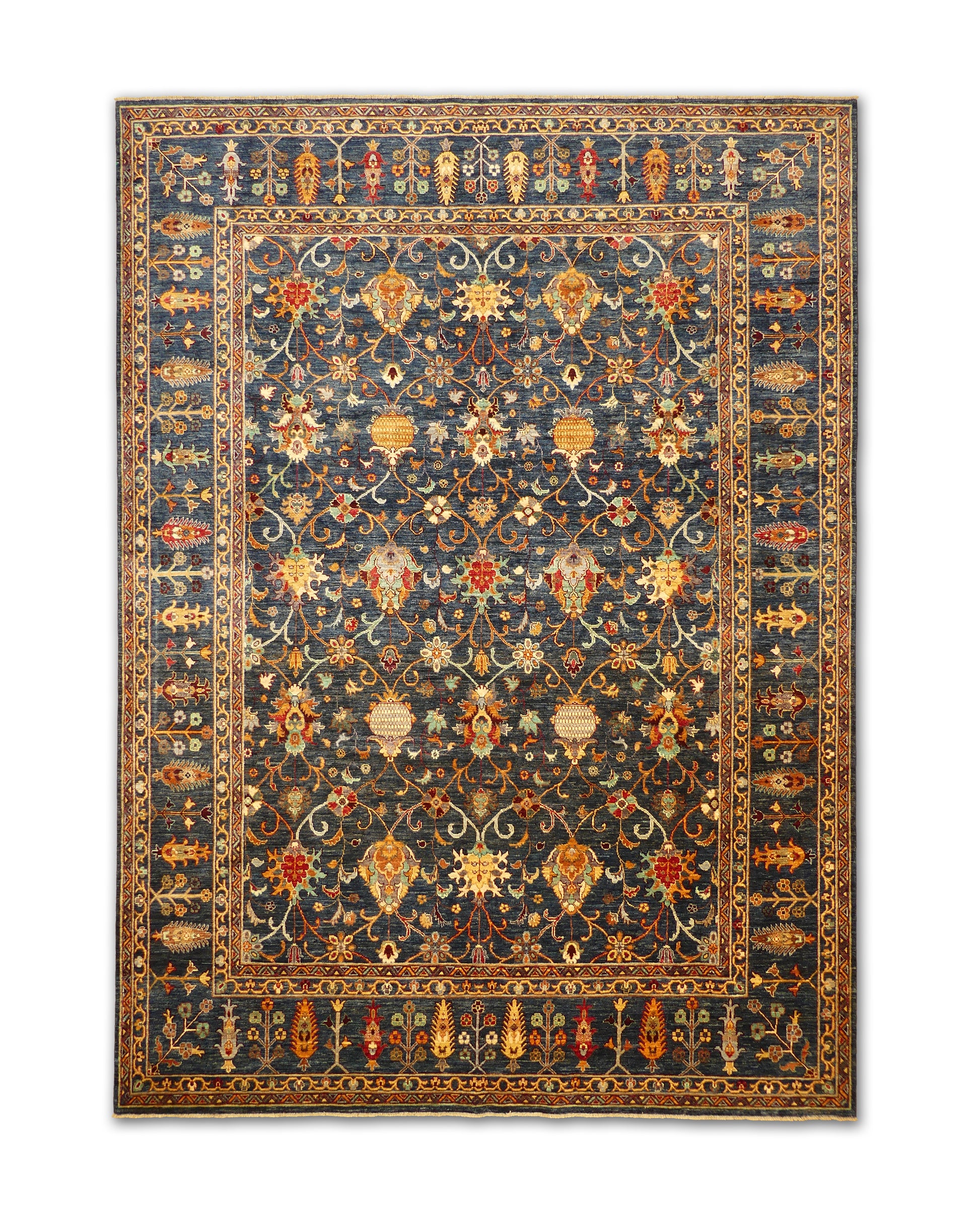 This exquisite hand-knotted rug features a deep navy field illuminated by a repeating pattern of stylized floral medallions, palmettes, and scrolling vines in shades of gold, rust, ivory, and soft green. The design is arranged in a refined lattice framework, creating order and symmetry across the composition. A wide border of alternating floral elements in rich golden tones enhances the rug’s warmth and opulence, perfectly framing the intricate center. The jewel-toned palette and classical motifs bring both drama and elegance, making this rug a stunning choice for formal living rooms, dining areas, or grand entryways.
