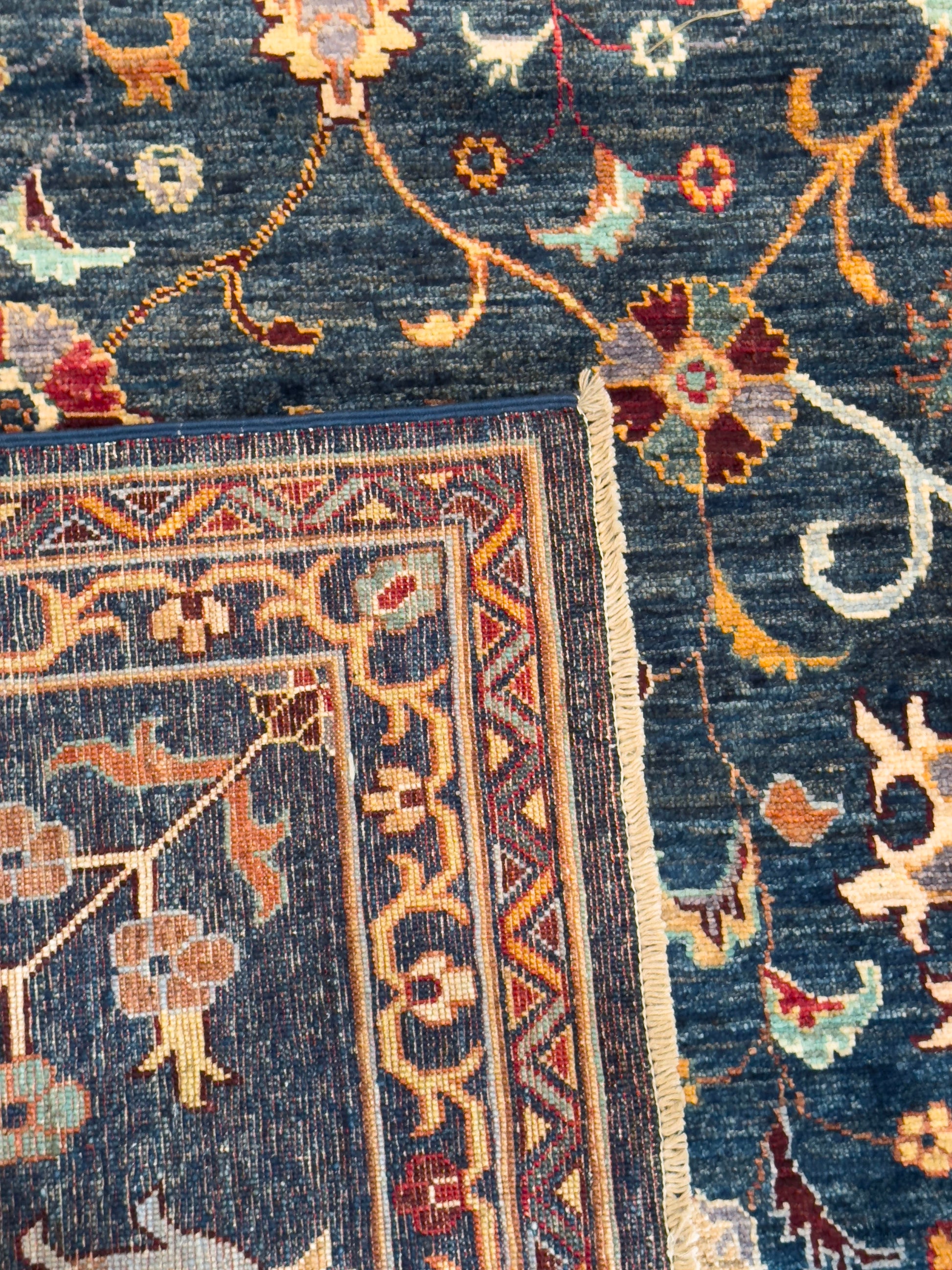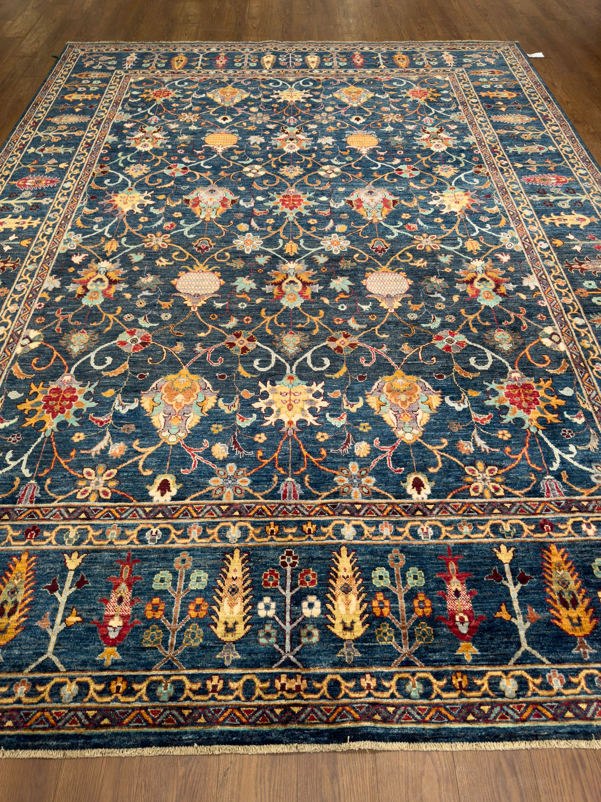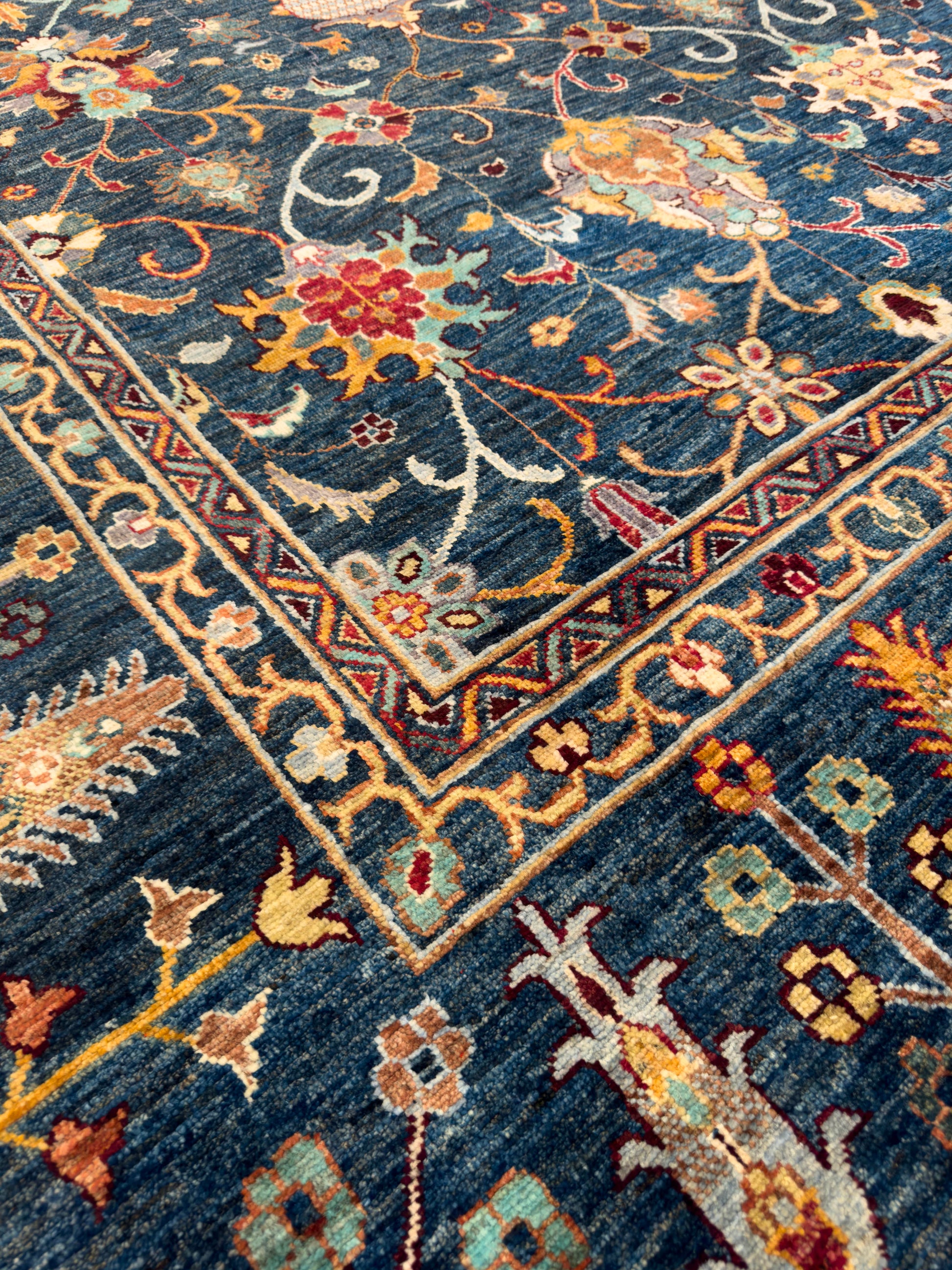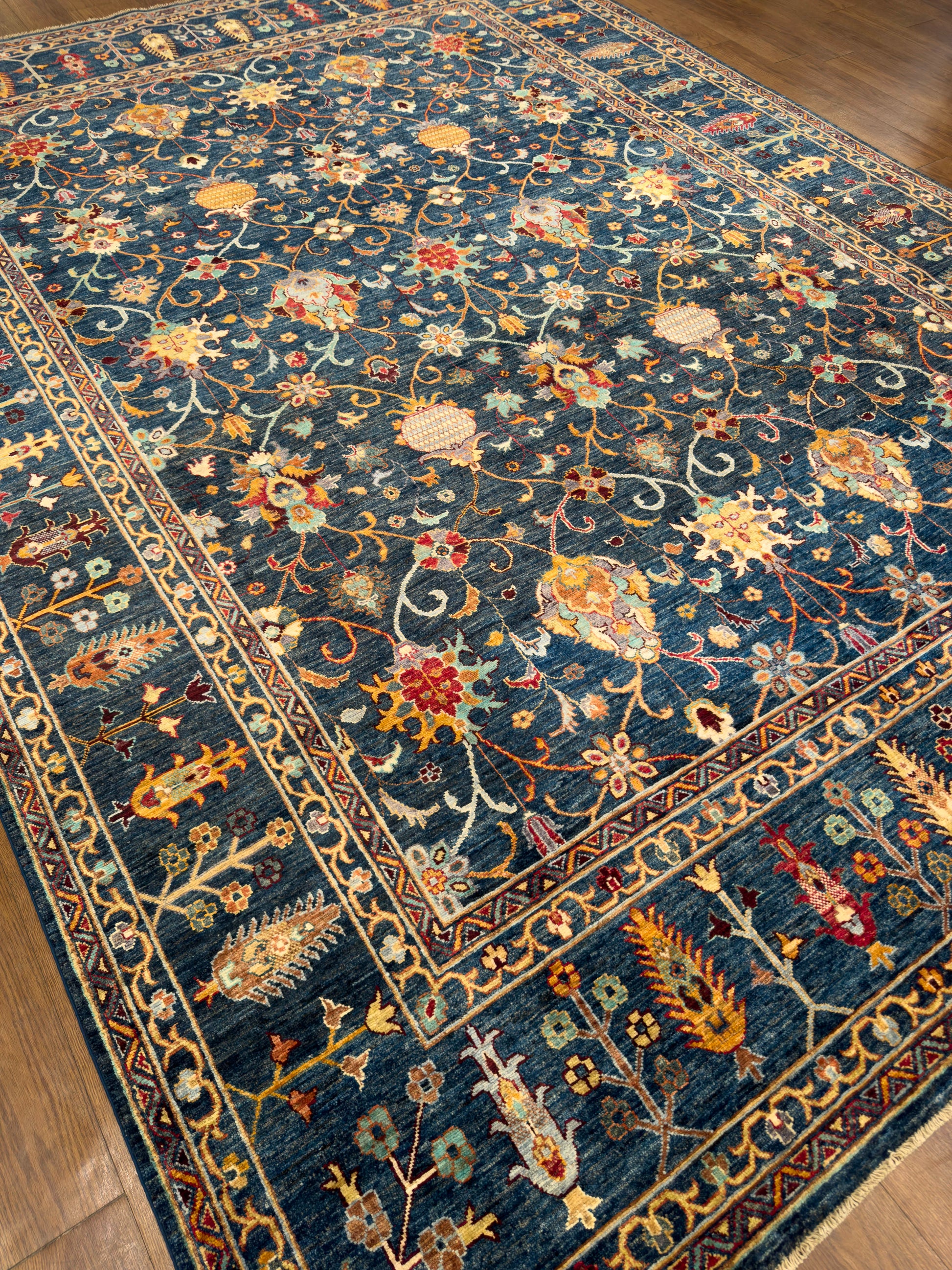 This exquisite hand-knotted rug features a deep navy field illuminated by a repeating pattern of stylized floral medallions, palmettes, and scrolling vines in shades of gold, rust, ivory, and soft green. The design is arranged in a refined lattice framework, creating order and symmetry across the composition. A wide border of alternating floral elements in rich golden tones enhances the rug’s warmth and opulence, perfectly framing the intricate center. The jewel-toned palette and classical motifs bring both drama and elegance, making this rug a stunning choice for formal living rooms, dining areas, or grand entryways.
