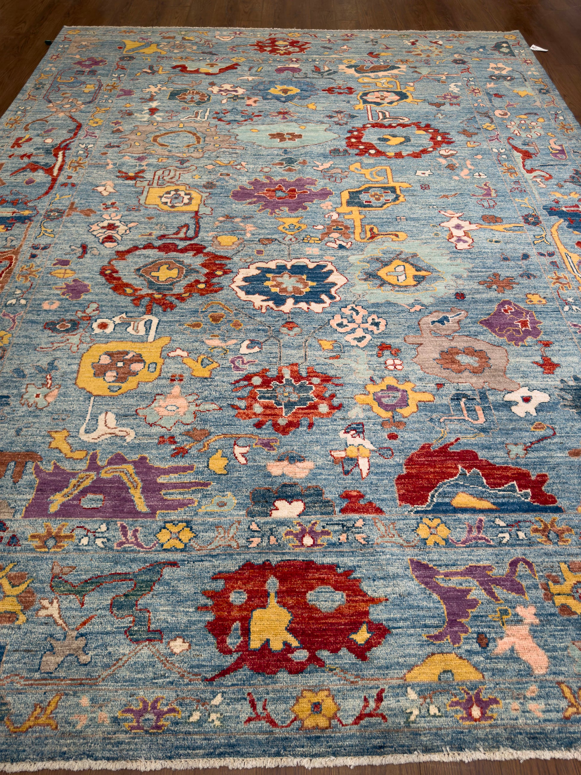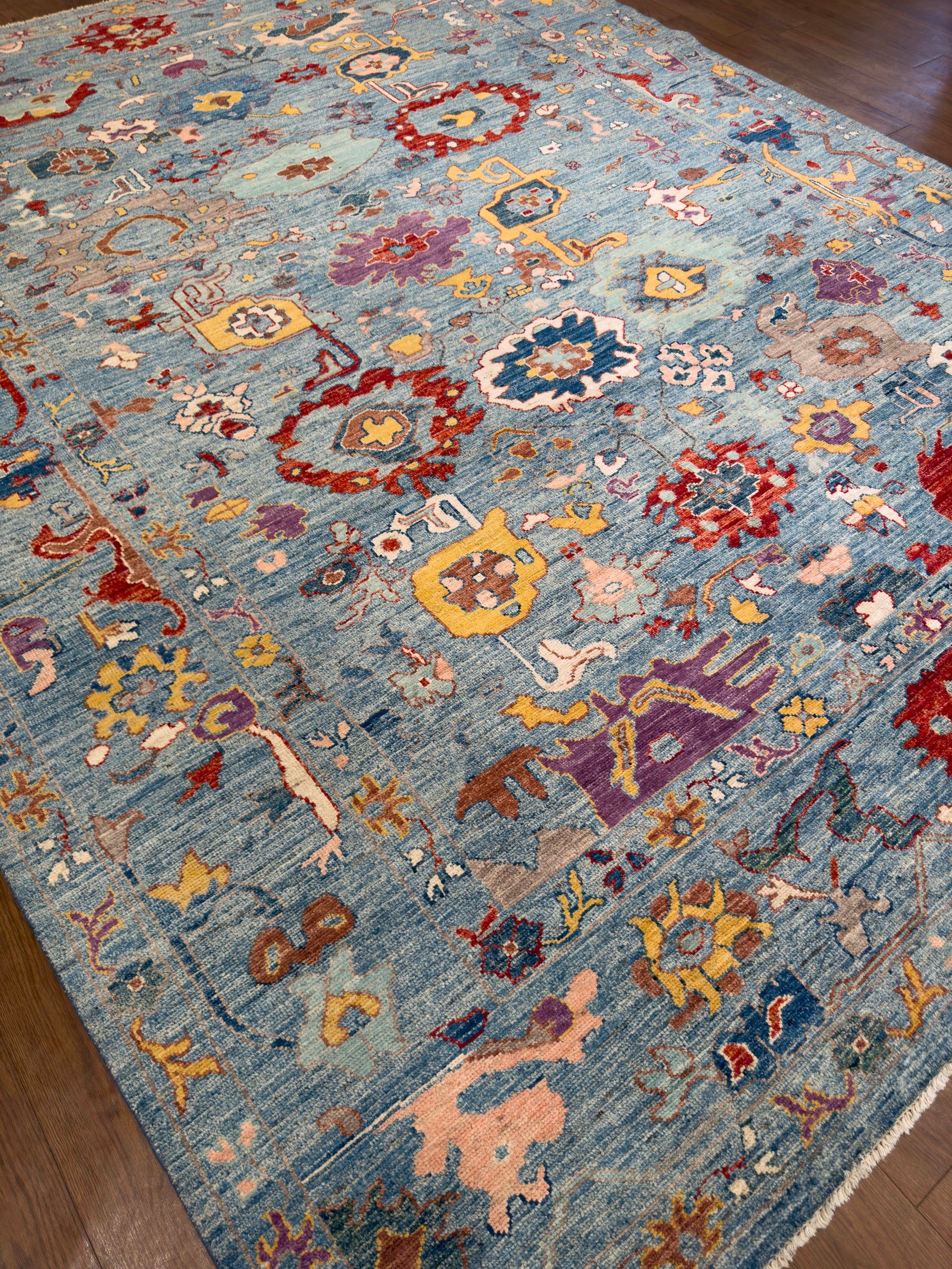 This vibrant hand-knotted rug features a lively sky-blue field scattered with bold tribal and floral motifs in shades of crimson red, golden yellow, ivory, lavender, and deep navy. The asymmetrical placement of medallions, blossoms, and abstract geometric forms lends a whimsical, artistic quality, while the border of stylized flowers ties the composition together. The mix of saturated jewel tones against the cool blue ground creates a striking contrast, giving the rug both energy and charm. Perfect for eclectic living rooms, bohemian interiors, or creative spaces that embrace color and individuality.